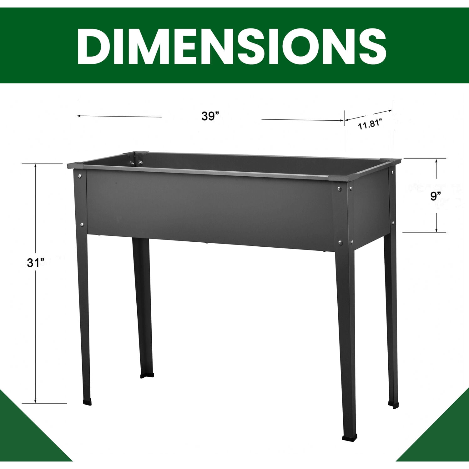 STURDY, STRONG & DURABLE: Made with heavy-duty weather-resistant galvanized steel, this raised planter box is built to withstand rust, rot, UV rays, and corrosion for long-lasting use to enjoy for many years. PERFECT SIZE: Exterior Dimensions are 12″D x 39″W x 31.5″H / Interior Planter Box Dimensions are 10″D x 37″W x 8″H EXCELLENT CUSTOMER SERVICE: Hanover Customer Service is here to help! If you are in need of replacement parts, parts due to damage in transit, or have any questions, please feel free to contact us and our customer service team will respond within 24 hours to assist you. Elevated planter box on legs with 3 sq. ft. surface space for small-space gardening Ideal size for a small balcony, patio, porch, deck or any area with limited space Perfect for the first-time or experienced home gardener for seasonal fun Use to grow seeds, seedlings, herbs, tomatoes, flowers, and vegetables Ergonomic raised bed design so you can stand while working – no more kneeling, bending, or back strain Raised planter protects against pathway weeds, soil compaction, erosion from rain, leaching, and pests Built in drainage system helps prevent root rot (water plug included for hydroponic gardening) Sturdy, strong, and durable for many years of enjoyment Constructed from powder-coated, heavy-duty, weather-resistant galvanized steel to withstand rust, rot, UV rays, and corrosion Wind resistance up to 40 miles per hour Quick 1-person assembly design – hardware and instructions included Exterior Dimensions (inches): 12 D x 39 W x 31.5 H Interior Planter Box Dimensions (inches): 10 D x 37 W x 8 H Soil Capacity: 1.6 cu. ft. 1-year limited warranty