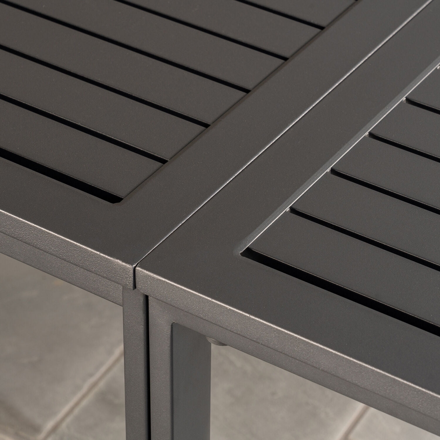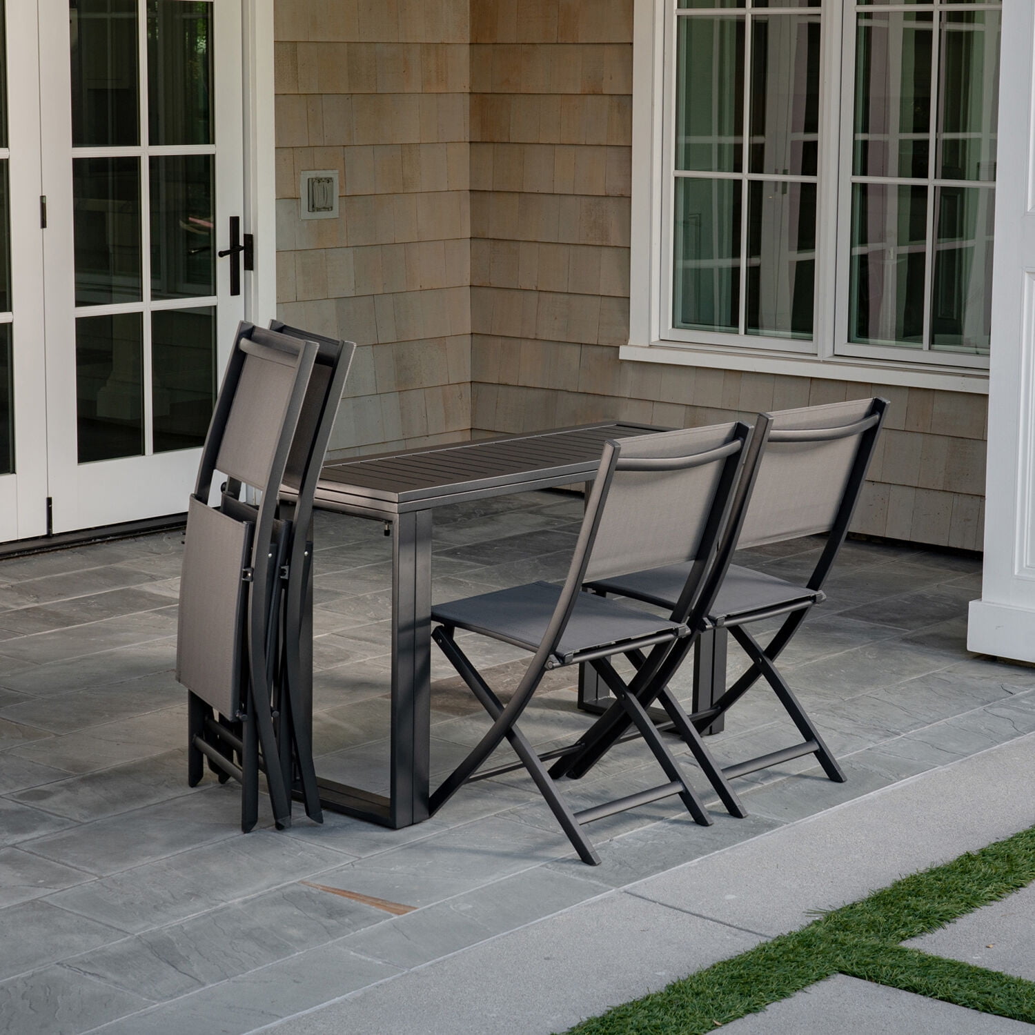 With the Conrad 5-piece compact dining set, by Hanover, outdoor entertaining in smaller spaces is trouble-free. This versatile aluminum set includes four folding sling chairs and a functional yet stylish slatted table ready to use wherever and however you need it. When not in use as a dining table, the legs fold in and the tabletop folds in half on top of itself to create a modern console table. Each chair features a durable sling seat and backrest that are bound to slender yet sturdy frames. These portable chairs are lightweight and fold down flat, making it easy to move them around and transfer in and out of storage. Perfect for small patios, decks, and balconies, this Conrad all-weather modern dining set provides a place to dine or serve outdoors without taking up too much space.