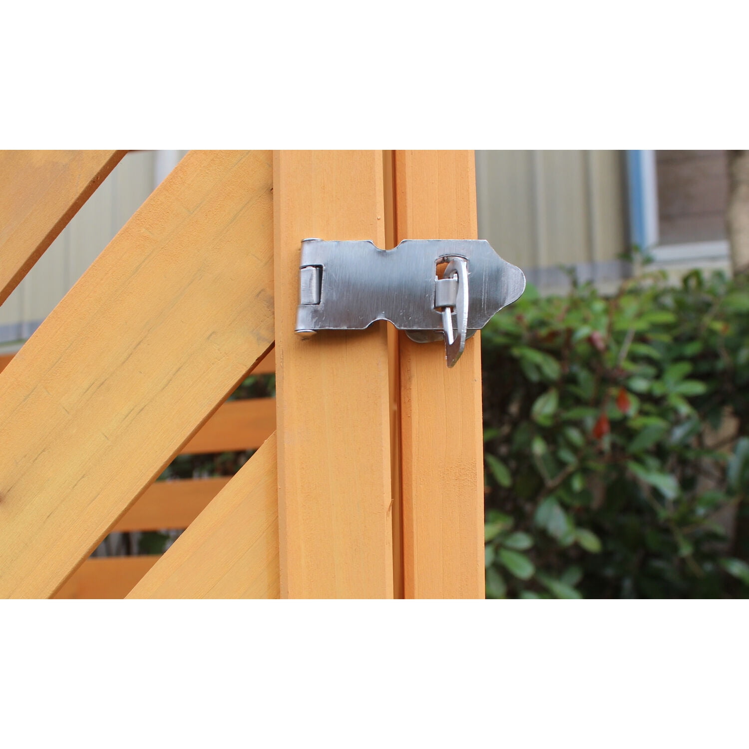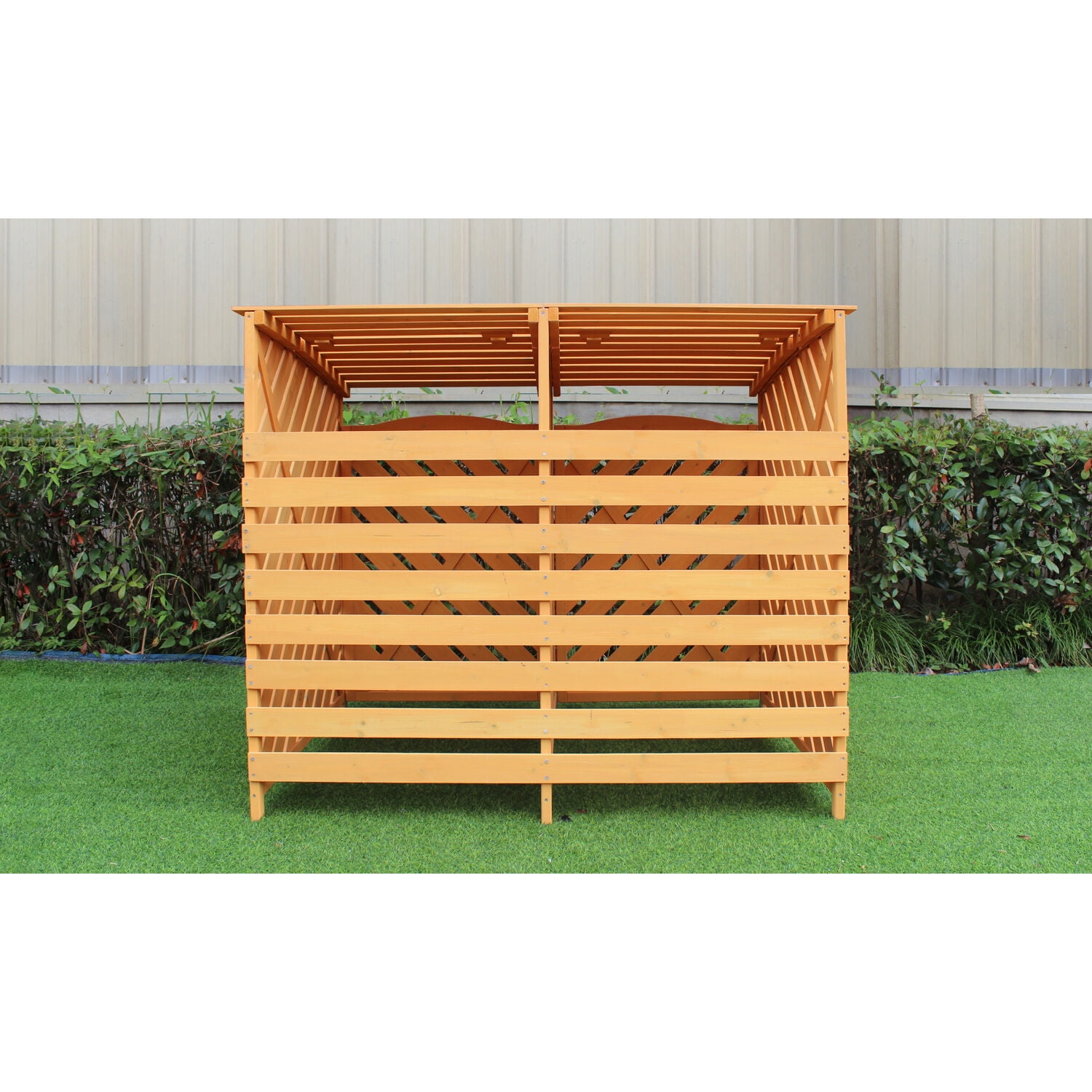 Keep your trash and recycling bins tidy and pest-free with a Wooden Trash and Recyclables Bin Storage Shed from Hanover. Unsightly trash bins will no longer blight your backyard or stink up your storage shed, instead keep them out of sight and out of mind in one of these simple, yet stylish storage sheds, designed to fit up to two 60 gallon garbage cans or recycling bins. Flip up one or both of the dual hinged lids when taking out the trash or use the front two doors to move your trash cans in and out of the shed with ease. To keep pests out, the shed comes with a metal, locking latch that accommodates most combination or keyed locks (padlock NOT included). Stable and durable, the wooden shed is constructed with natural fir wood to last through many seasons. For all of your outdoor storage needs, depend on quality products from Hanover.