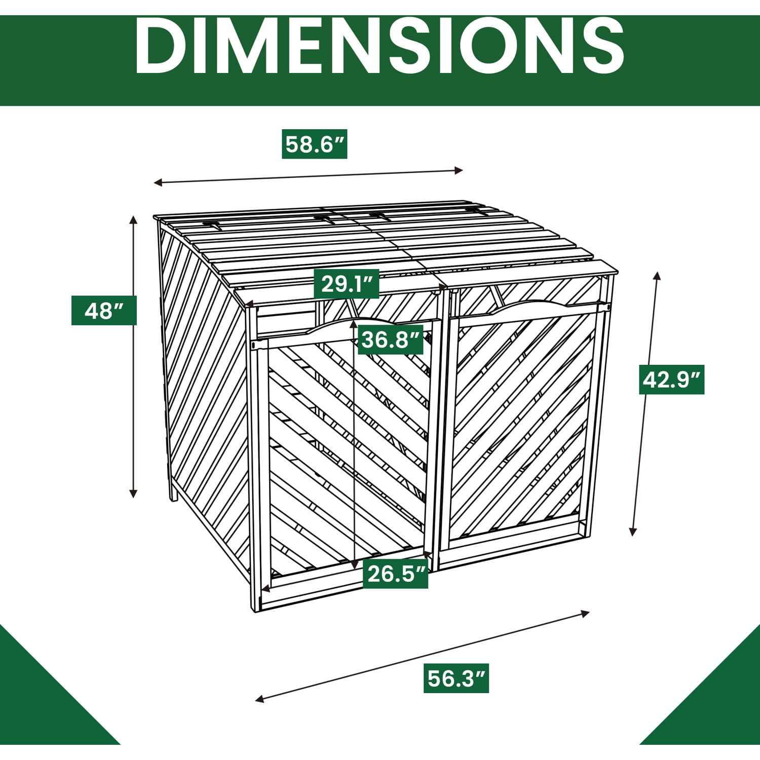 STURDY & DURABLE: Made with natural solid fir wood, this storage shed is built to withstand the outside elements. Ergonomically designed for long lasting use to enjoy for many years. ASSEMBLED PRODUCT DIMENSIONS: 48″H x 58.6″W x 36.2″D (4′ x 4.9′ x 3′) CUSTOMER SERVICE : Hanover Customer Service is here to help! If you are in need of replacement parts, parts due to damage in transit, or have any questions, please feel free to contact us and our customer service team will respond within 24 hours to assist you. Wooden Trash and Recyclables Bin Storage Shed with Dual Front Doors and Hinged Top Lids Sturdy, fir wood construction with metal hardware Metal locking latch accommodates most combination or keyed locks (padlock NOT included) Designed to fit up to two 60 gallon garbage cans or recycling bins Has 2 front doors and 2 lid doors to add trash or access the interior with ease Door opening is 35.4 in. W x 26.3 in. H 1 year limited warranty 2 Doors