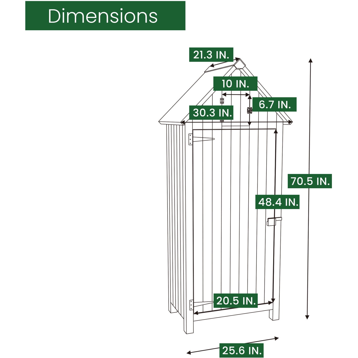 STURDY & DURABLE: Made with natural sturdy fir wood and waterproof roof, this storage cabinet is built to withstand the elements. Ergonomically designed for long lasting use to enjoy for many years. ASSEMBLED PRODUCT DIMENSIONS: 70.4″H x 30.3″W x 21.3″D (5.9′ x 2.5′ x 1.8′) CUSTOMER SERVICE: Hanover Customer Service is here to help! If you are in need of replacement parts, parts due to damage in transit, or have any questions, please feel free to contact us and our customer service team will respond within 24 hours to assist you. Outdoor Wooden Storage Shed with Pitched Roof, 3 Shelves and Locking Latch Sturdy, fir wood construction with black, metal hardware Metal locking latch accommodates most combination or keyed locks (padlock NOT included) 8.7 cubic feet internal storage capacity Pitched, asphalt roof is waterproof Includes three short shelves Door opening is 20.4 in. W x 48.4 in. H Color: Mint Green Storage loft door dimensions: 10 in. W x 6.7 in. H Floor included 1 year limited warranty