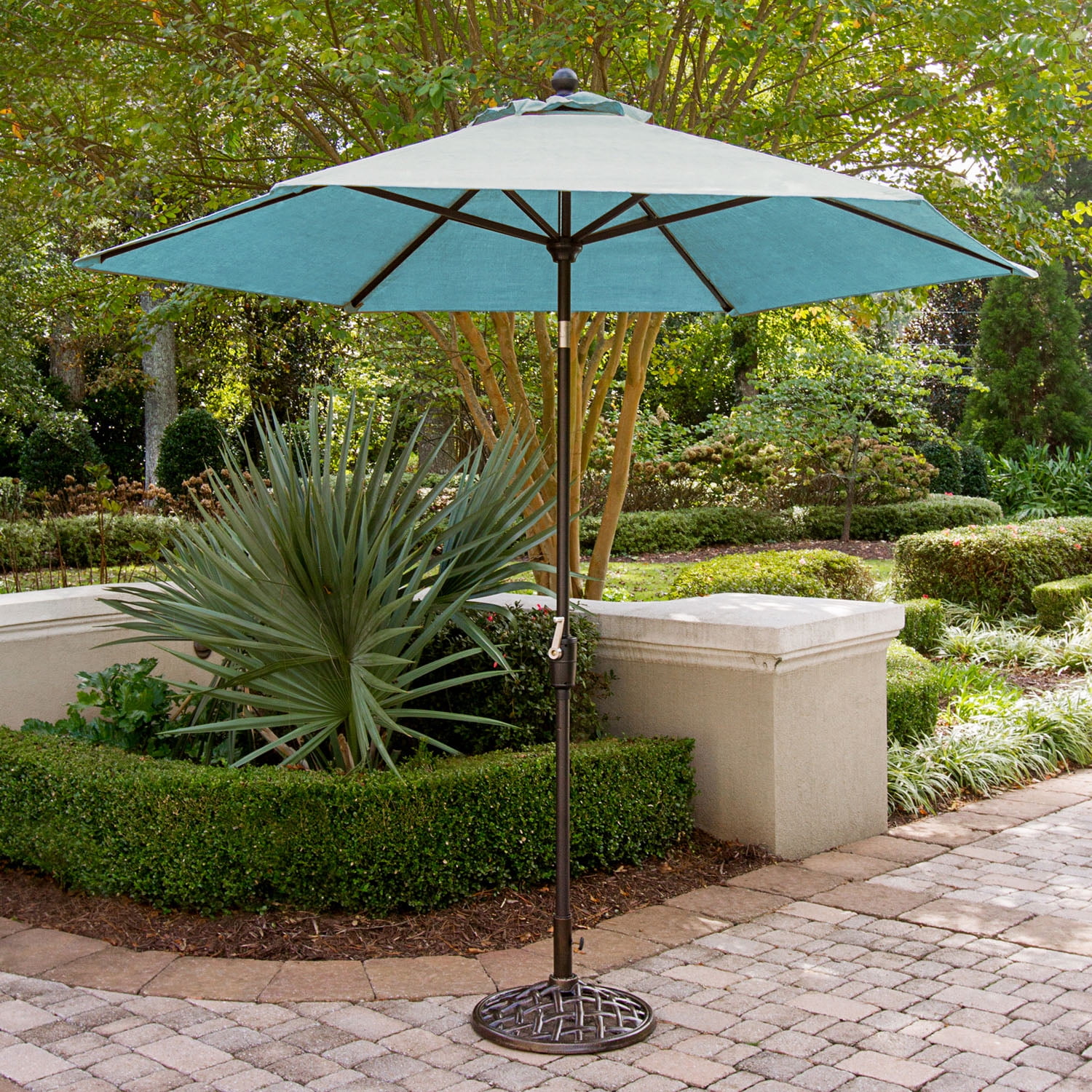 Extra large table umbrella designed for the Traditions Dining Collection 11 ft. canopy is perfect for use with large dining sets Keeps guests cool and comfortable in the shade Crank lever for swift canopy operation Tilting pivot adjusts the angle of shade to your preference Rust-resistant aluminum pole with a bronze finish Long-lasting fabric requires little maintenance UV- and weather-resistant Quick and easy assembly 1-year limited warranty