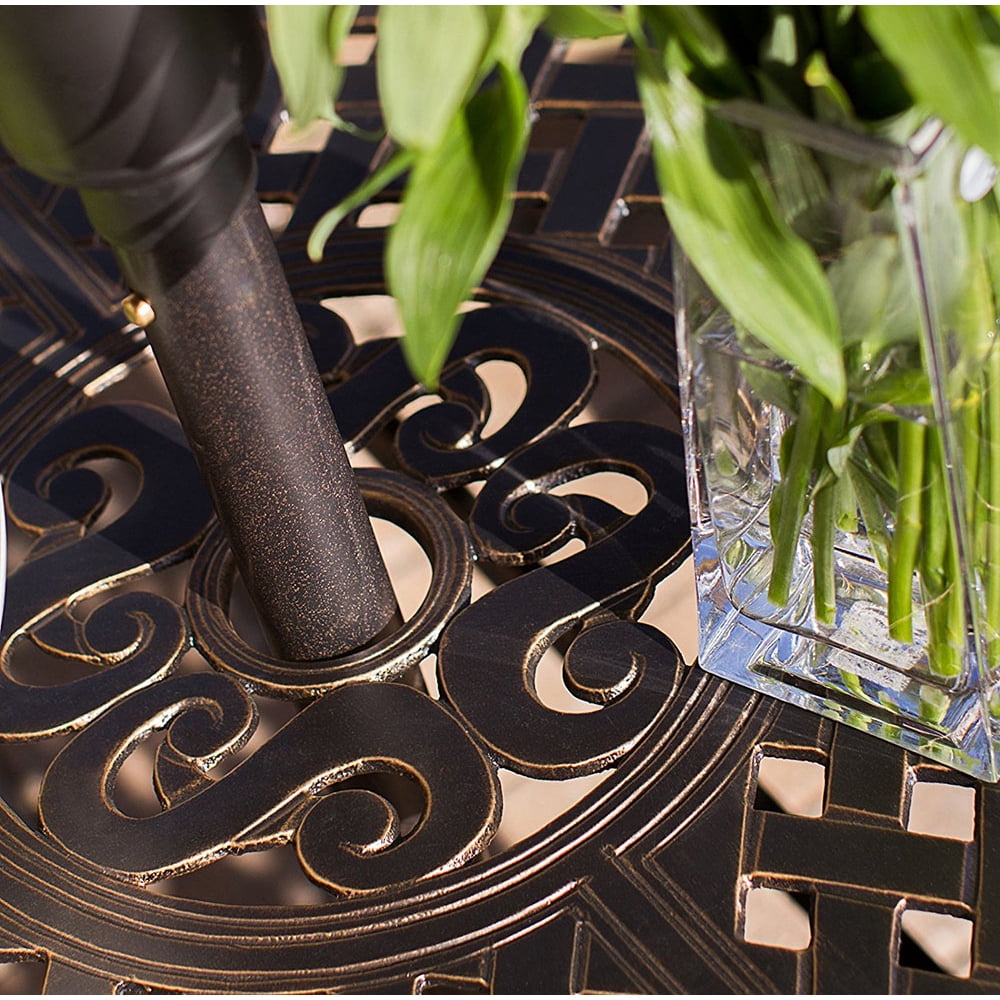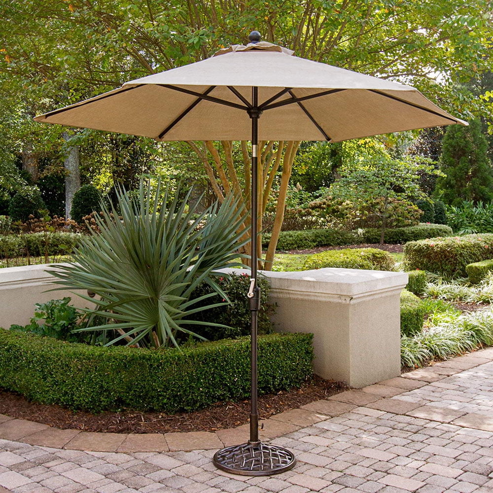 TRADITIONAL DESIGN: Whether you’re joining in conversation or gathering with friends and family , the Traditions umbrella is the perfect addition to your outdoor space. This stylish umbrella allows you to entertain outdoors while keeping your guests both cool and comfortable. ADJUSTABLE ANGLE & PIVOT: The beautiful 9-foot umbrella features an easy-crank lever that allows you to quickly and easily adjust the angle and pivot of the umbrella to keep you and your guests relaxed in the shade from sunrise to sundown. STURDY & DURABLE: The easy-care, long-lasting fabric canopy is weather and fade resistant will complement any outdoor dining set with its lovely warm earth-tone and clean lines. SET DIMENSIONS: Open Umbrella Dimensions: 104″D x 104″W x 108″H, Overall Weight: 12 lbs. CUSTOMER SERVICE: Hanover Customer Service is here to help! If you are in need of replacement parts, parts due to damage in transit, or have any questions, please feel free to contact us and our customer service team will respond within 24 hours to assist you. Market umbrella designed for Hanover’s Traditions Dining Collection Large canopy is perfect for use with outdoor dining sets Keeps guests cool and comfortable in the shade Crank lever for swift canopy operation Tilting pivot adjusts the angle of shade to your preference UV and weather-resistant Long-lasting fabric requires little maintenece Bronze-coated aluminum pole will remain rust-free for life 1-year limited warranty