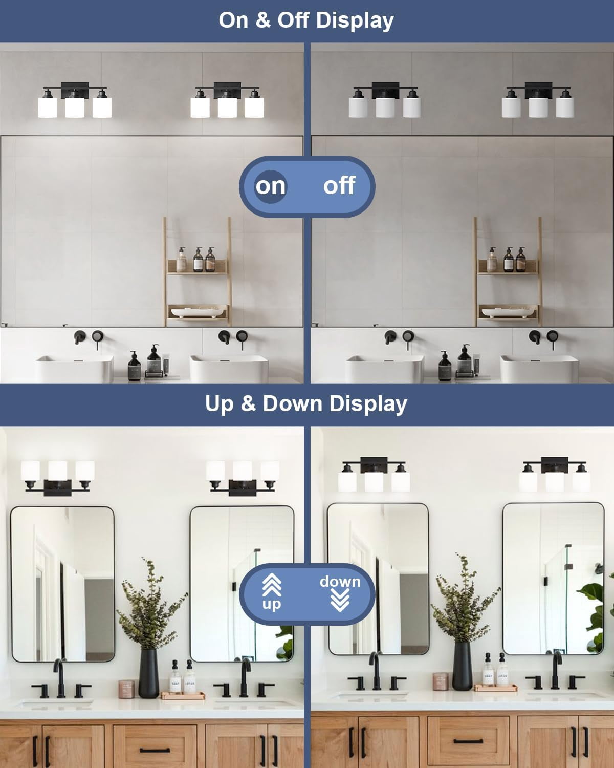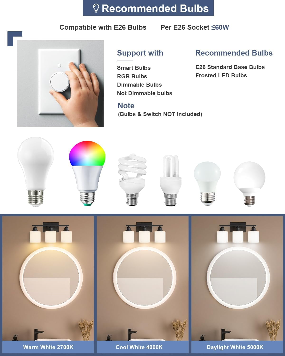 Hansang 3-Light Anti-Rust Matte Black Dimmable Vanity Light with Milky White Glass Shades Produces a safe lighting layout for your bathroom Ensures equal light distribution to enhance visibility Minimizes accidental shadows or bright spots for a balanced ambiance Works effectively with true or warm light colors for a cozy atmosphere Features a matte black finish that offers exceptional rust resistance Crafted from corrosion-proof materials for long-lasting durability Designed with three thick glass shades that provide soft light without harsh glare Lightweight yet robust, suitable for high humidity environments Can be installed in two orientations: pointed up towards the ceiling or down towards the floor Compatible with E26 standard sockets, allowing for easy bulb replacement Works with bulbs of up to 60 watts and is compatible with dimmers and smart bulbs Installation is straightforward and can be completed in under 10 minutes with basic electrical skills