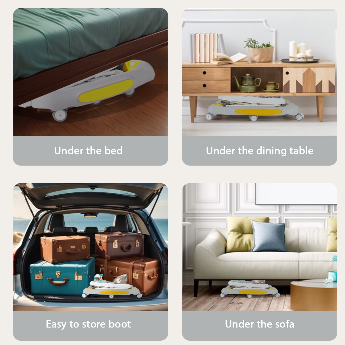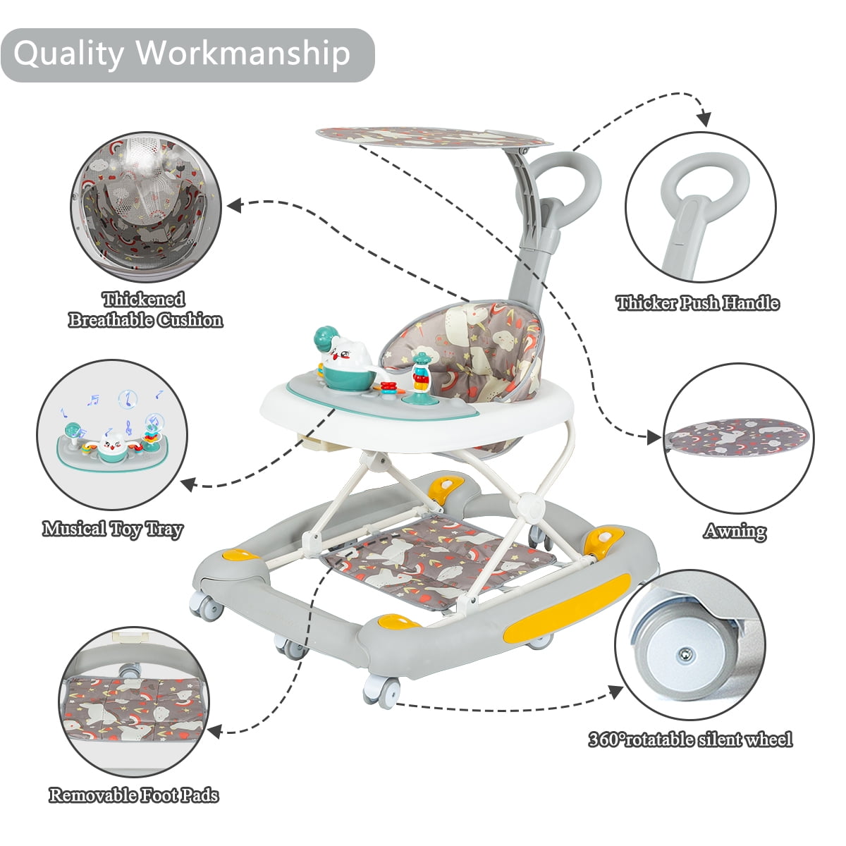Compact and Portable- The clever foldable design allows for easy storage and transport, making it perfect for home use or travel. Safety First- Equipped with a secure, non-slip base and sturdy construction, ensuring a safe walking experience for your little one. Adjustable Height- Our walker features multiple height settings, accommodating your baby as they grow and learn to walk confidently. Interactive Play Tray- The colorful play tray is filled with engaging toys that promote sensory development and keep your baby entertained. Easy to Clean- The removable seat cushion is machine washable, making it simple to maintain hygiene and keep the walker looking fresh.