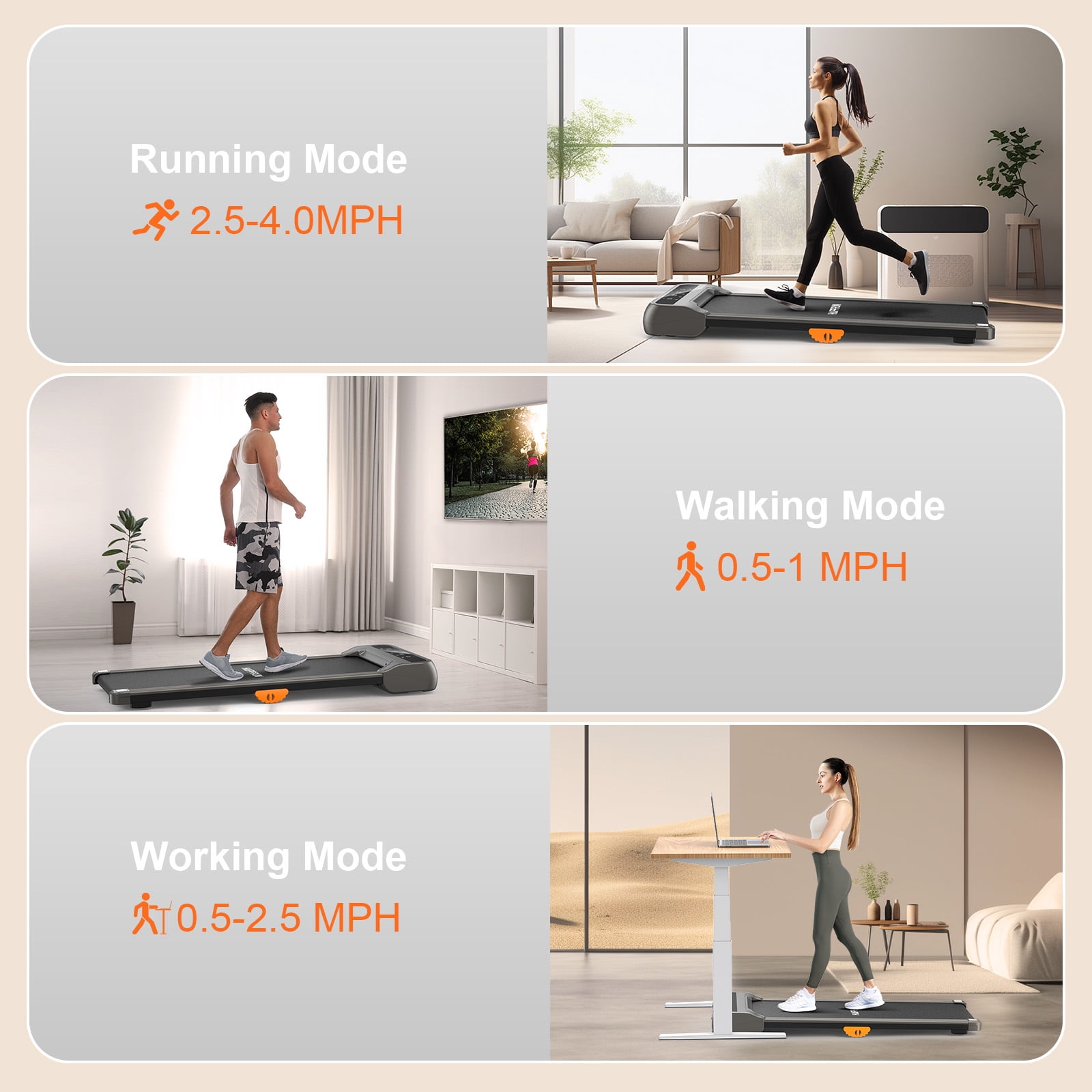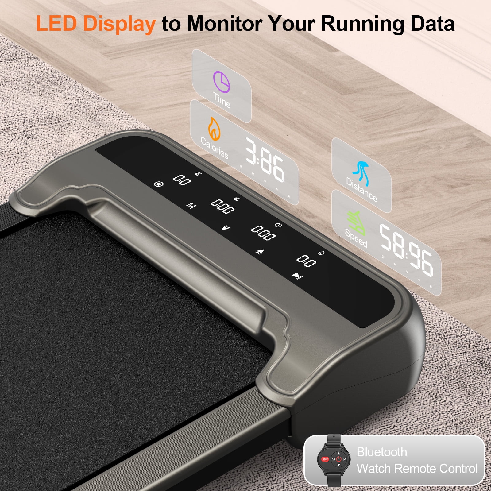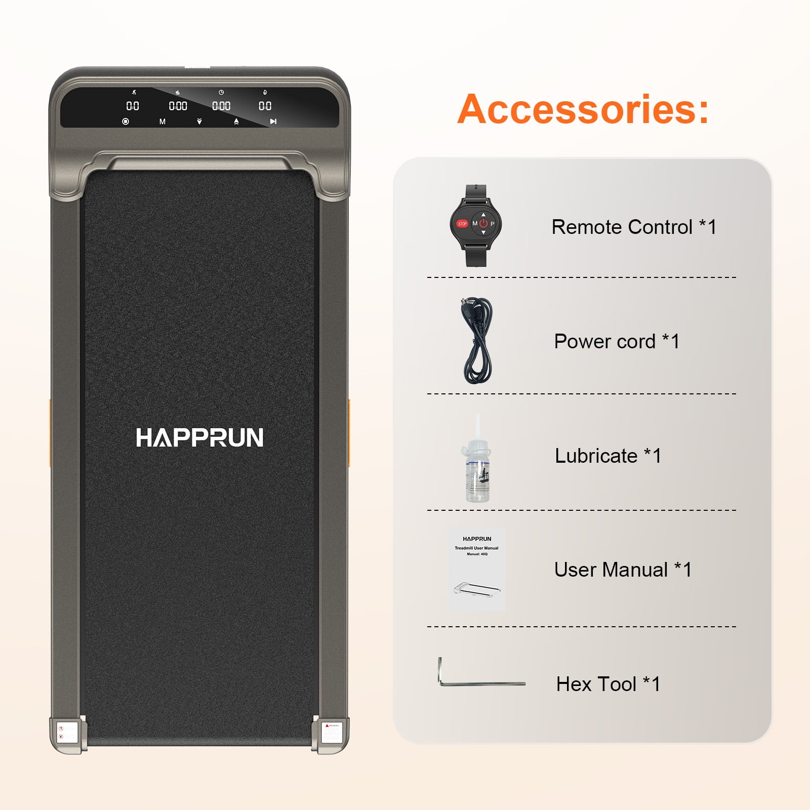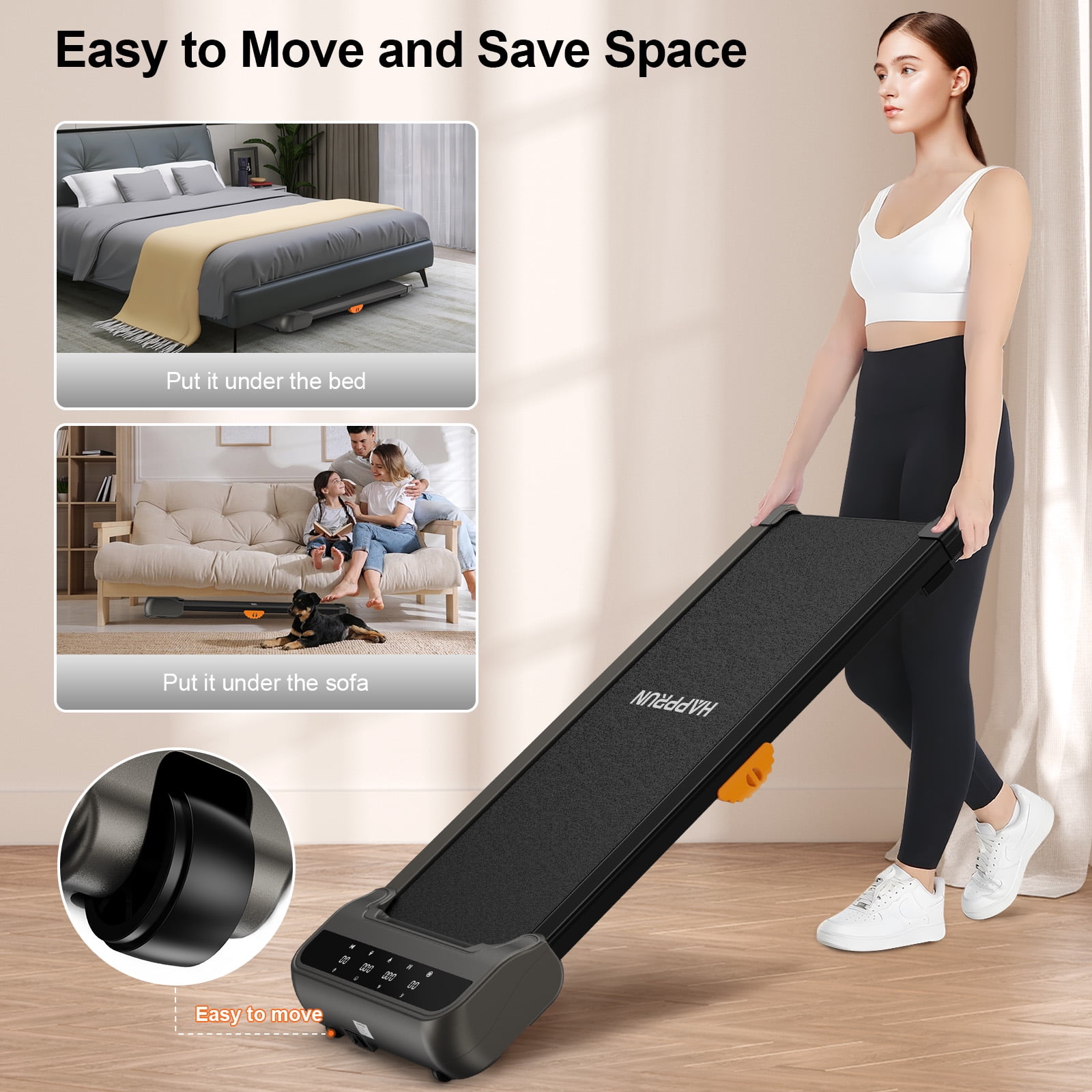 Transform Your Fitness Routine with HAPPRUN walking pad! Are you struggling with night runs? Worried about exercising outdoors in the winter? Or simply not a fan of going to the gym? Now, with the HAPPRUN treadmill, all your fitness concerns can be a thing of the past. HAPPRUN is designed to make your workouts enjoyable and hassle-free. We provide prompt and effective customer support, ensuring you have no worries about after-sales issues with larger products. Key Features: ???? Dual Control and LED Touch Screen: Equipped with a wrist-worn remote control, it’s convenient to adjust settings while exercising. The LED touch screen also allows for easy control and displays time, speed, distance, and calories burned, helping you track your progress effortlessly.This under desk treadmill retains your workout data for up to 10 minutes when paused, so you can hydrate or take calls without losing your progress. ???? Three Workout Modes: Choose from walking, working, or running modes by adjusting the speed. If you experience shoulder, neck, or back discomfort while working, you can opt to walk while you work. This healthier work style is set to become a future trend. ???? The compact, space-saving design allows you to store it under the sofa, bed, or against a wall, making it perfect for apartment use. With two wheels at the bottom, it’s easy to move around. This walking pad treadmill comes fully assembled, so you can use it straight out of the box with no setup required. ???? The 5-layer non-slip running belt and spacious running area (40″ x 16″) offer effective cushioning for your knees and leg muscles, ensuring a safer and more comfortable workout experience. Tips: It’s normal for the treadmill belt to shift slightly, either initially or after some use. This is a common occurrence and there’s no need to worry. The included manual provides instructions on how to adjust the belt. If you hear any unusual noises, use the included lubricant to help reduce them. Satisfying Customer Service: HAPPRUN offers a 1-year warranty and professional customer support to ensure your peace of mind. If you have any questions or concerns, please feel free to contact us. Don’t let weather, time, or location limit your fitness goals. Order your HAPPRUN treadmill today and enjoy a healthier, more active lifestyle right from the comfort of your home!