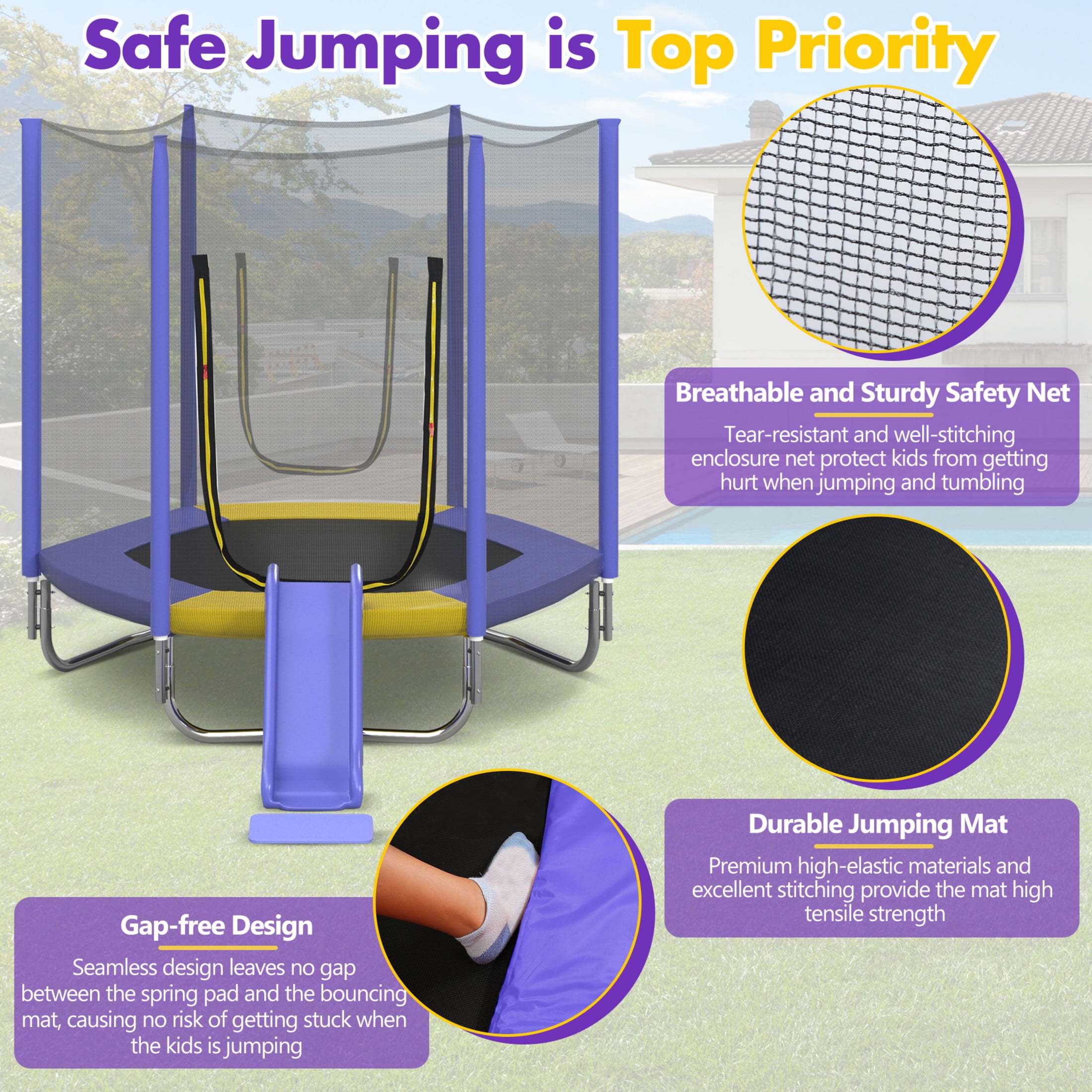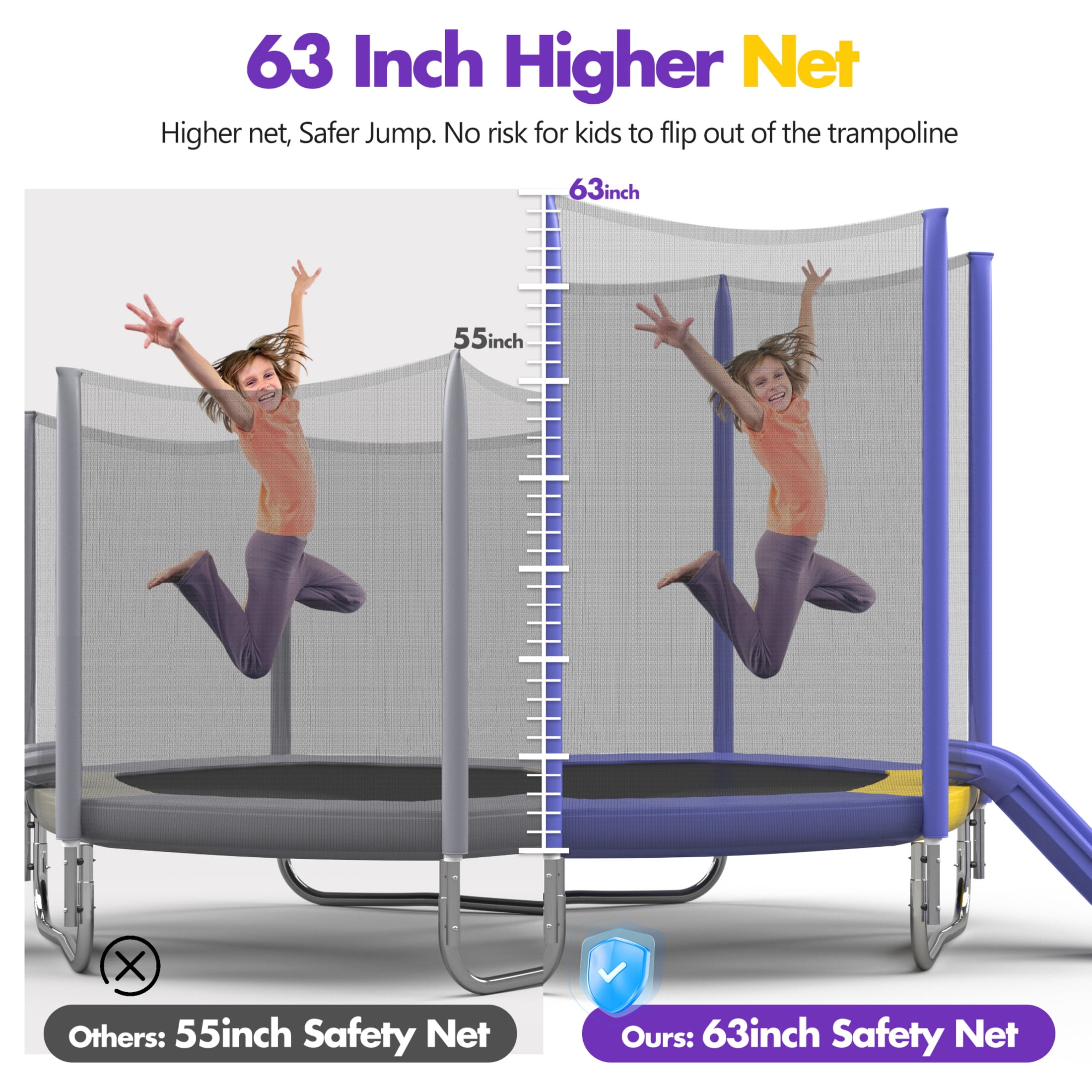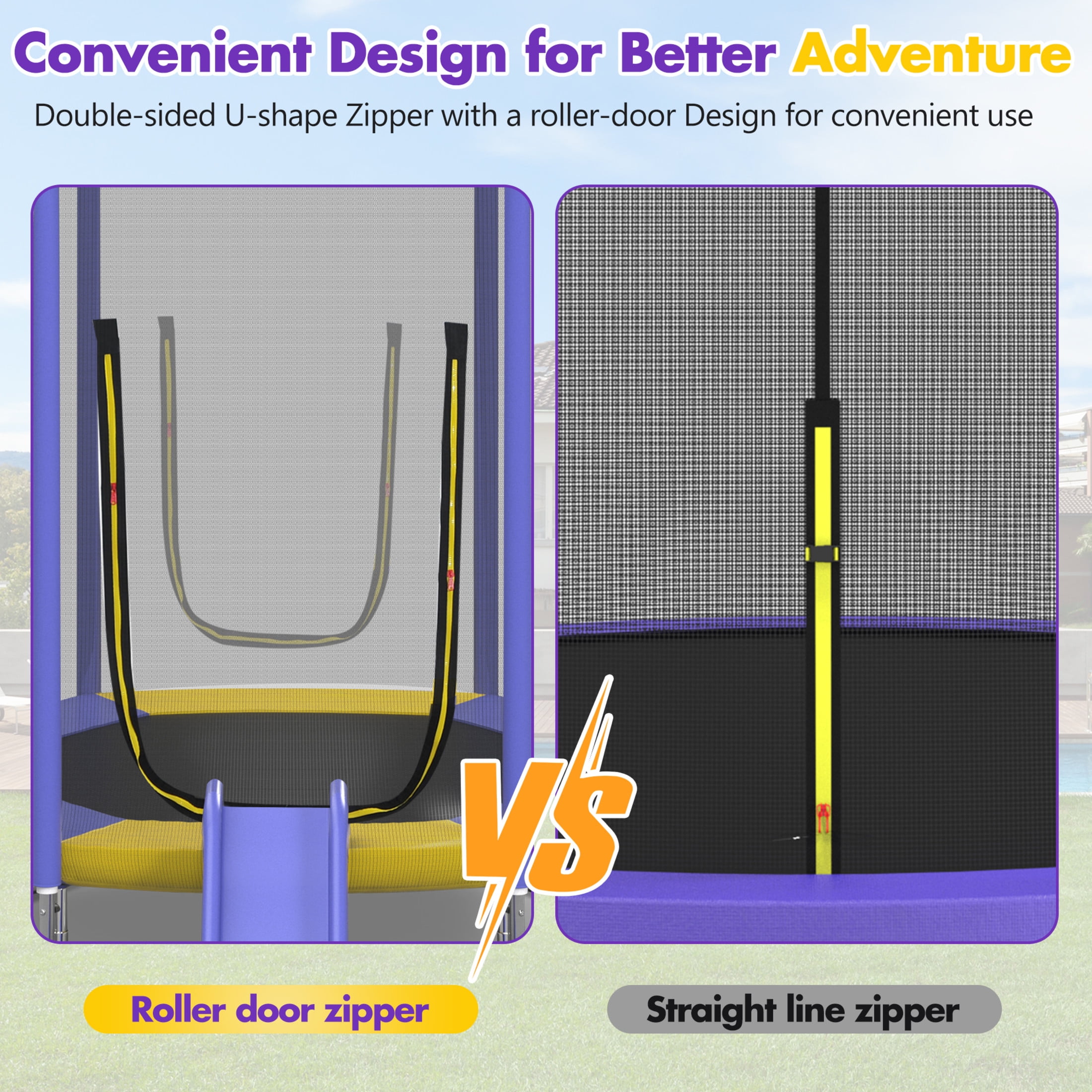 This 7FT trampoline offers a perfect collection of active play, letting your child enjoy multiple games in one place. With a durable 100% polyester safety net, UV protection, and 36 high-elastic springs, this trampoline is built to withstand various weather conditions and provide endless outdoor fun. The U-shaped steel frame and secure zippered enclosure prioritize safety, while the soft cushion and smooth slide ensure gentle landings for all-around protection. Ideal for indoor or outdoor use, this compact trampoline brings a family-friendly play environment to your home, encouraging physical activity and joy-filled playtime. With a weight capacity of up to 220 lbs and easy assembly, this set is a hassle-free addition to any backyard or playroom.