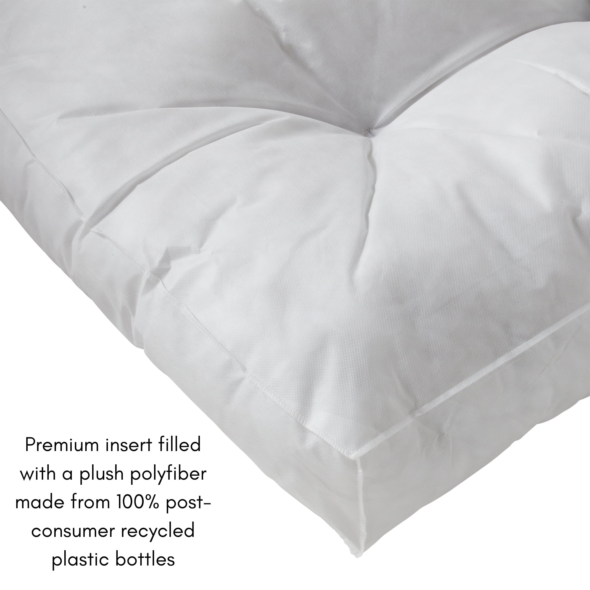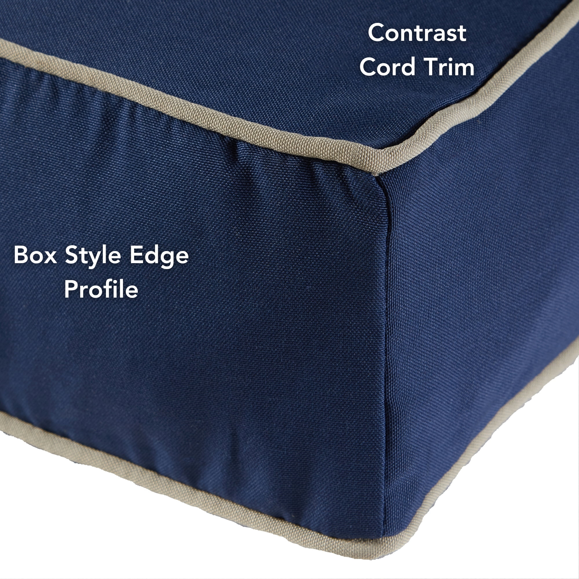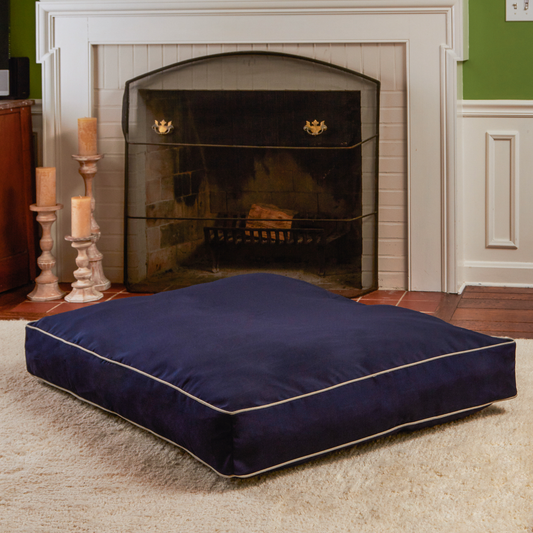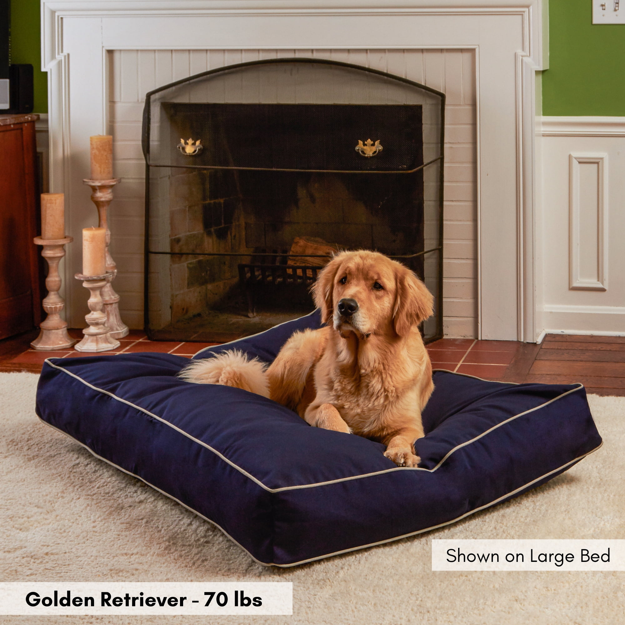 Large Bed: 36 inch x 48 inch x 6 inch Recommended for dogs over 75 lbs Ryder is shown on our large bed, he is a 75 lb Golden Retriever Solid Navy color Double-sewn boxed edges for lasting durability Reversible design Water and UV-resistant polyester fabric Suitable for indoor or light outdoor use Removable, machine-washable cover Generously filled with a soft recycled polyfiber Bed dimensions are +/- 2 inches Please note: product will arrive in a slightly compressed state; please allow a few days for product to expand to final size listed in description