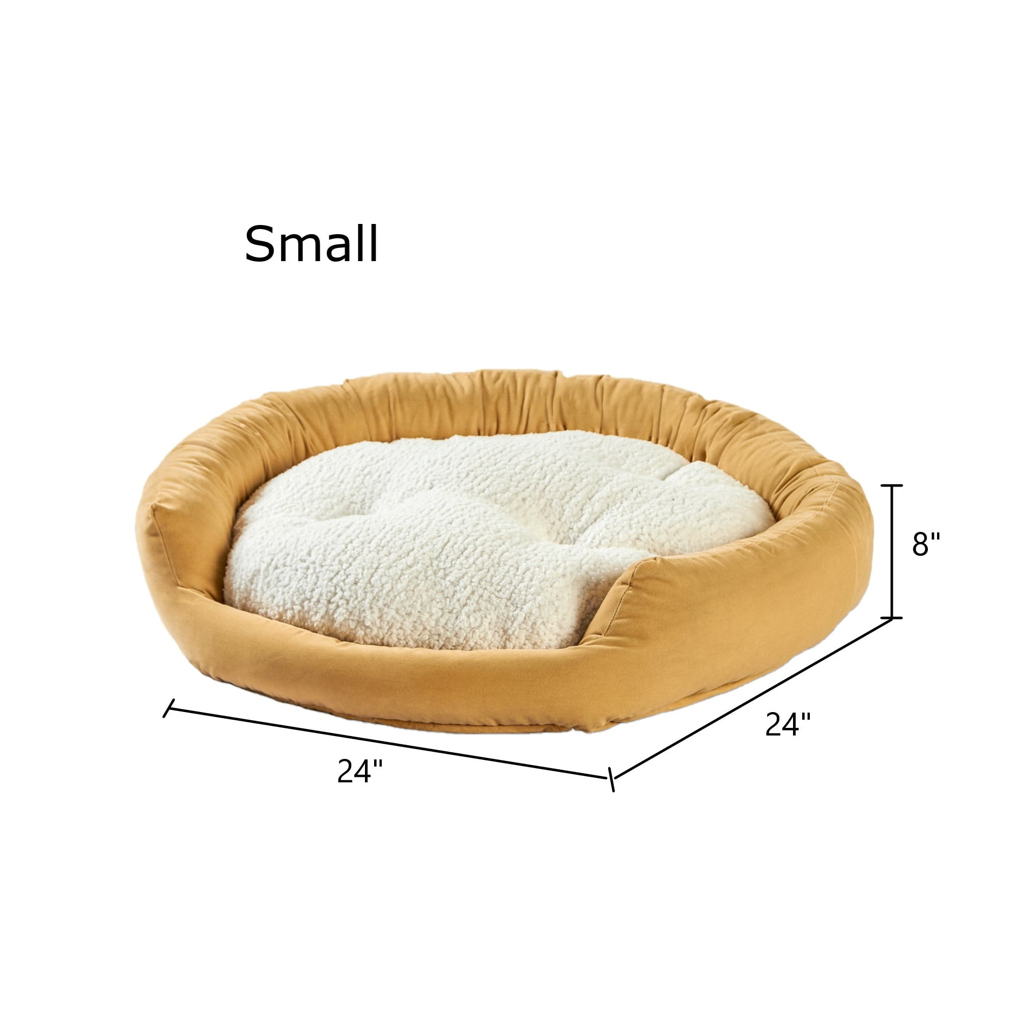 Small bed size: 24 inches Recommended for dogs up to 25 lbs Sam is shown on our small bed, he is a 10 lb Chihuahua Terrier Mix Solid cream color Cuddler style bed ideal for dogs who like to curl up while sleeping Microfiber fabric is stain and water-resistant Features a luxuriously soft Sherpa panel Pillow is machine washable for easy care For best results spot clean the outer bumper or clean on gentle cycle in a non-agitator machine Bed dimensions are +/- 2 inches Please note: product will arrive in a slightly compressed state; please allow a few days for product to expand to final size listed in description