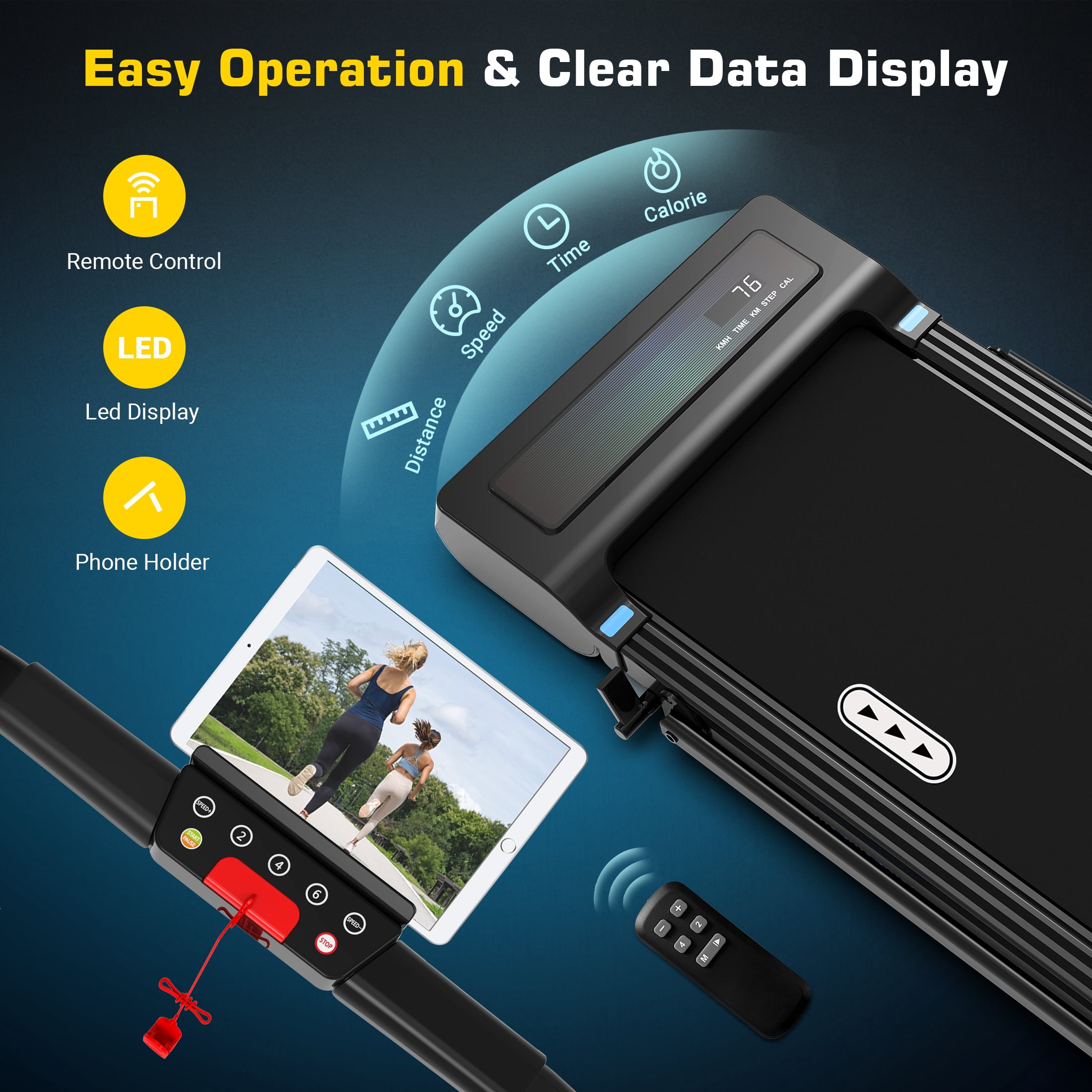 Versatile 2-in-1 Design: Seamlessly transition between walking and running modes, making it ideal for home, office, or gym use. Powerful 2.25 HP Motor: The 2.25 HP motor powers speeds from 0.6-7.6mph, catering to diverse training needs such as interval, speed, or endurance workouts. Diverse Workout Programs: Enjoy a variety of 12 programs, enhancing your exercise routine and providing options for different fitness levels. Spacious Running Belt: The wide running belt ensures freedom of movement, making your workouts more comfortable and effective. Compact and Foldable: Save space with the compact, foldable design, allowing easy storage when not in use. Intuitive LED Display: Track essential metrics like time, speed, calories, and distance on the clear LED display for an informed workout. Convenient Remote Control: Effortlessly control the treadmill’s settings with the included remote for added ease of use. Safety Features and Device Holder: Exercise worry-free with built-in safety features, and stay entertained by placing your phone or pad on the convenient holder. Elevate your fitness journey with this pre-assembled, comprehensive treadmill experience!