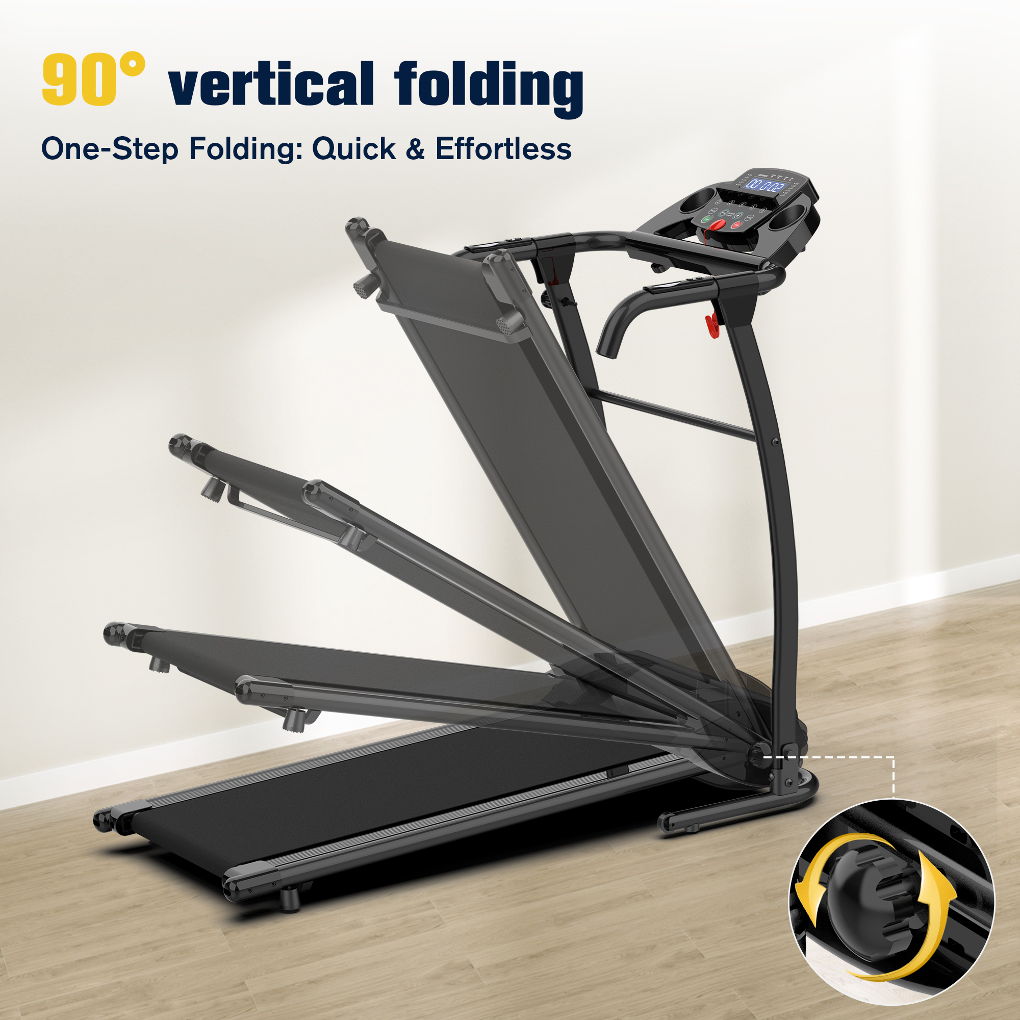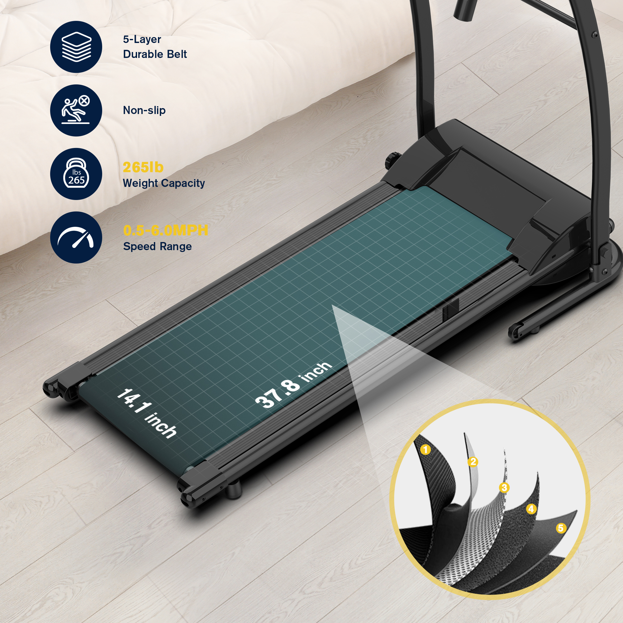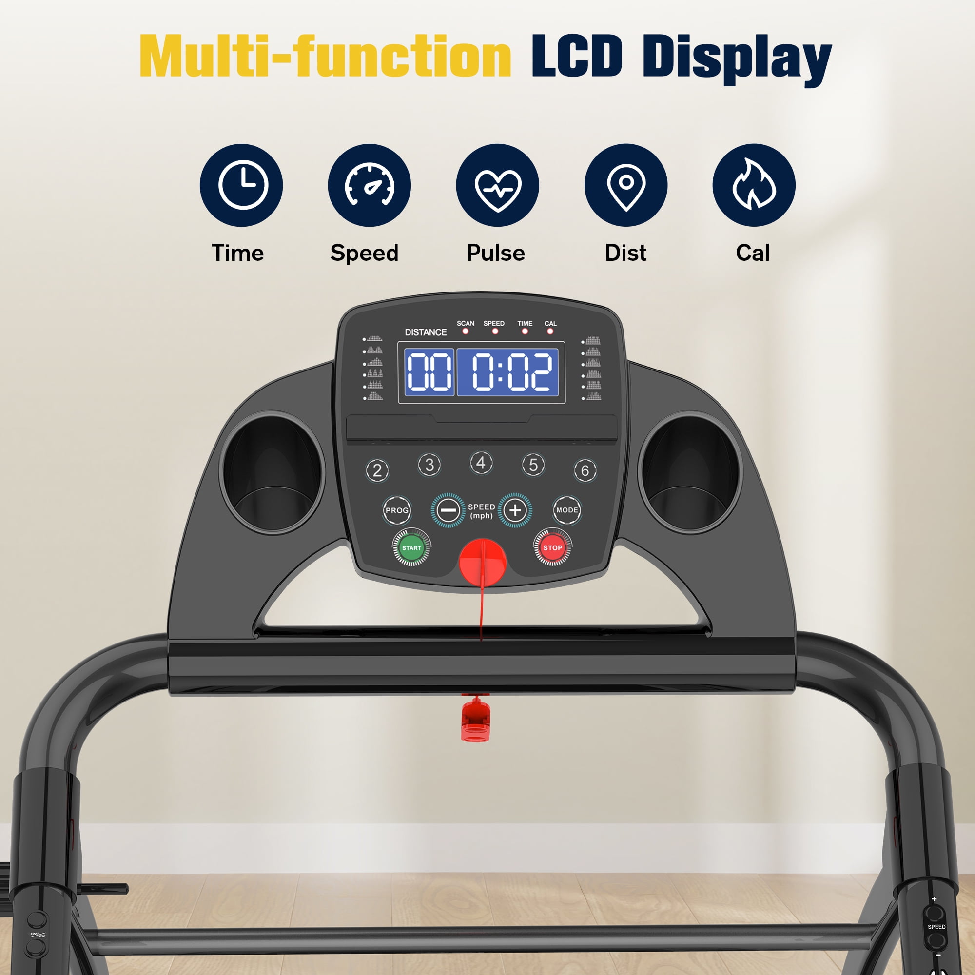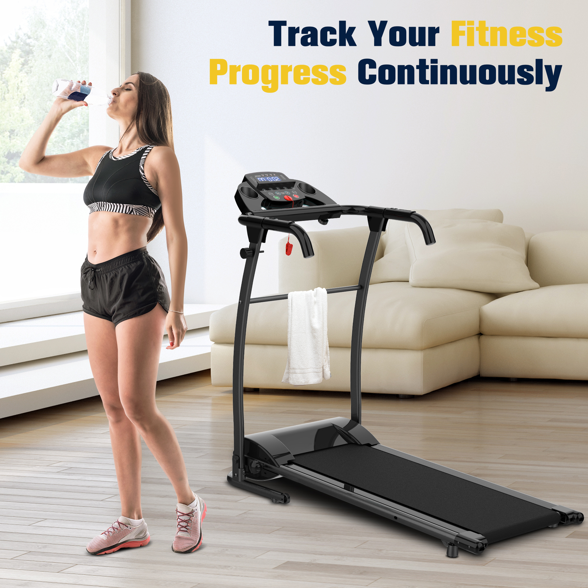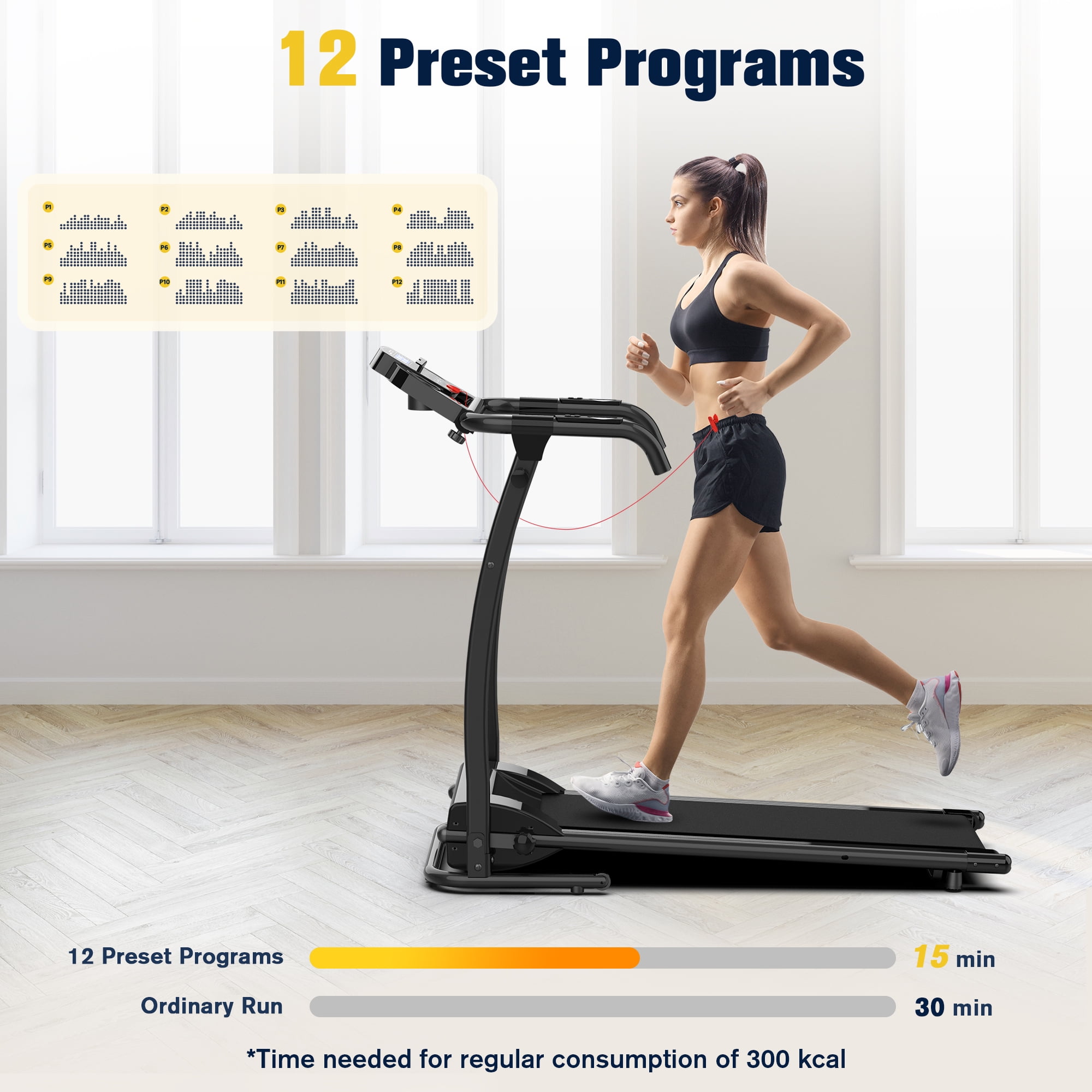 HAPYCITY Electric Running Exercise Treadmill, Black, 265 lb Intuitive LCD display shows time, speed, distance, calories, and heart rate for easy monitoring Foam grip arm provides comfort with buttons for easy start, acceleration, and stopping Offers 12 preset training modes with adjustable speed from 0.5 to 6 MPH for various fitness levels Folds to a 90° angle for easy storage, saving space in your home Crossbar between upright bars enhances stability during use Equipped with rollers for easy mobility and transport Includes lubricating oil, safety keys, assembly tools, and screws for quick setup Stylish cyan color design makes it a standout choice for home fitness Running belt measures 37.8 x 14.1 inches, providing ample space for comfortable workouts