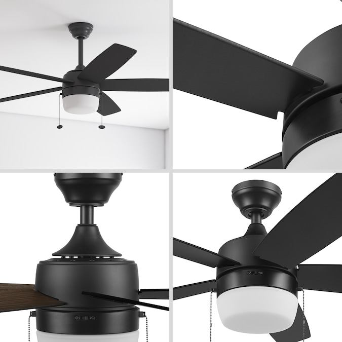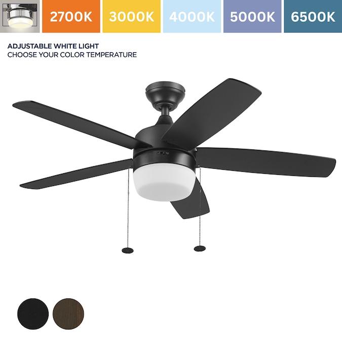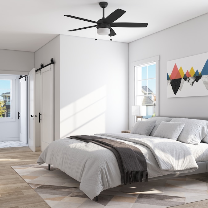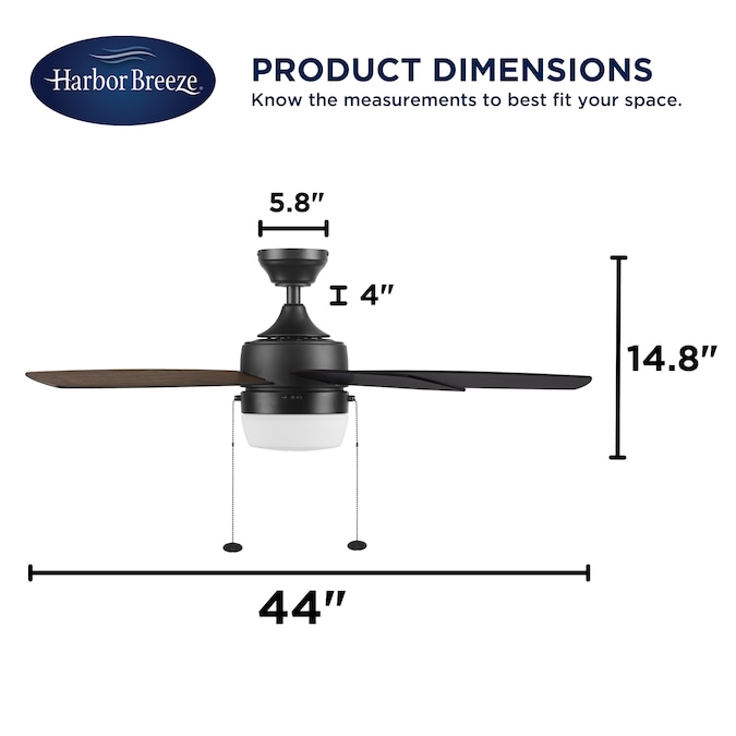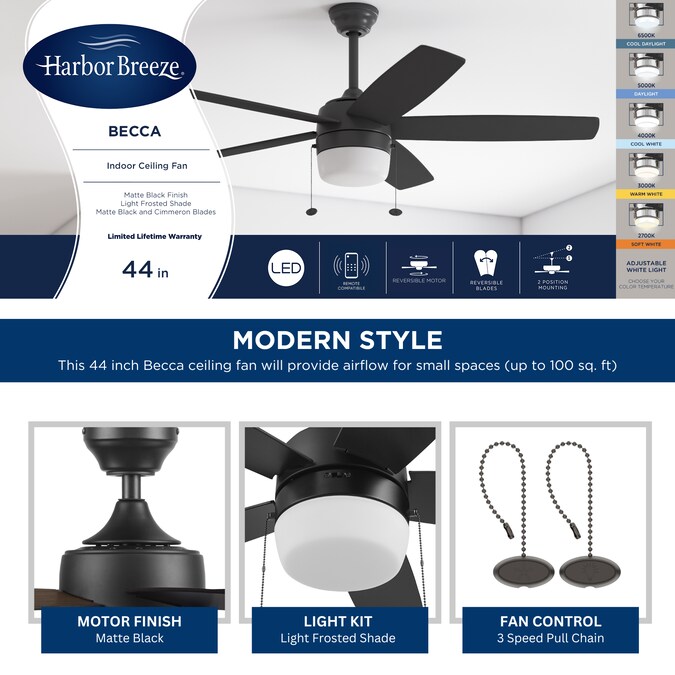 The Harbor Breeze Becca is a 44 inch indoor ceiling fan with lights, perfect for your smaller to medium sized space(s). This black ceiling fan features an integrated LED light kit and 5 reversible blades. With its three speed, reversible motor, this pull chain-controlled fan will provide comforting air circulation year-round. Harbor Breeze ceiling fans provide style, function, and illumination to help make your house a home.