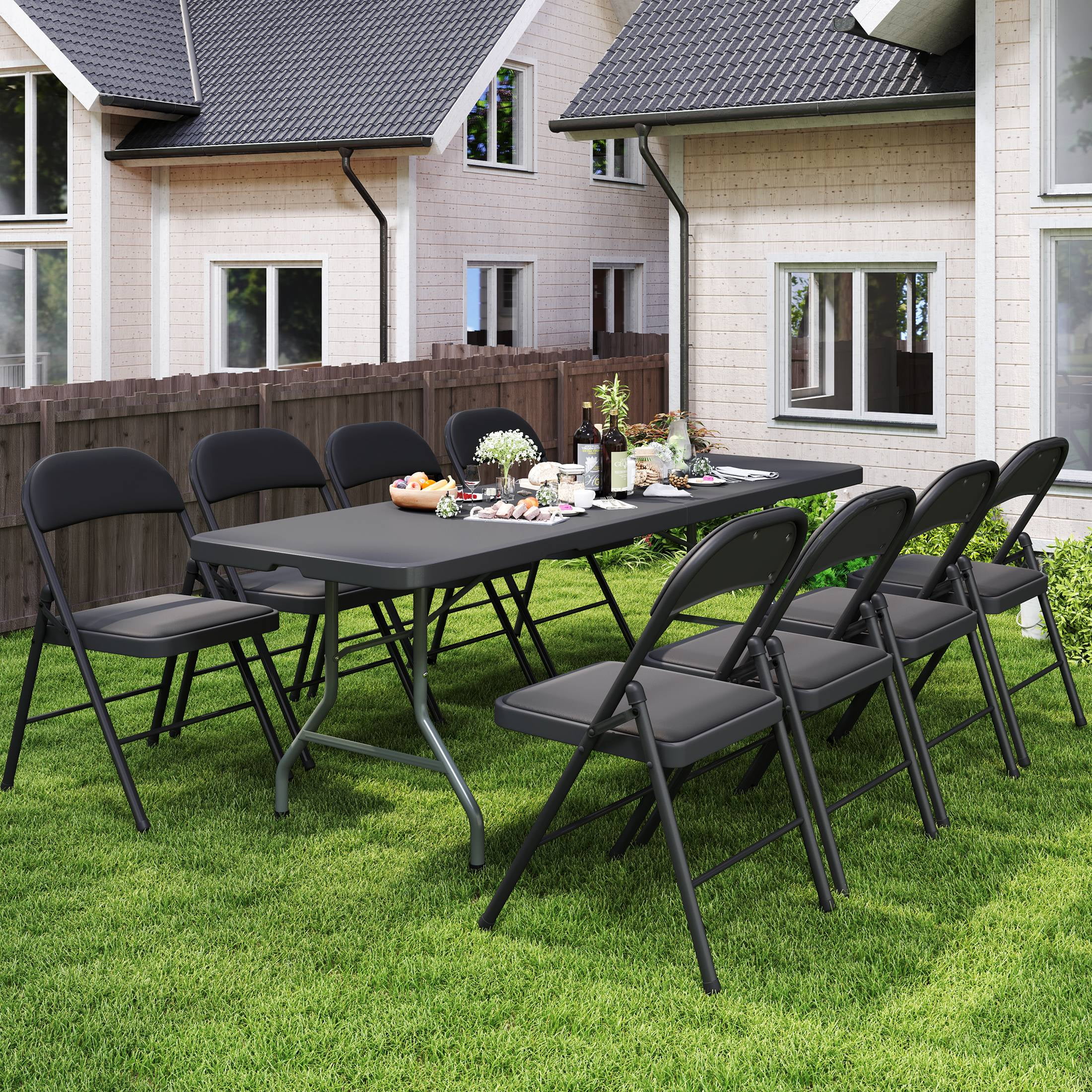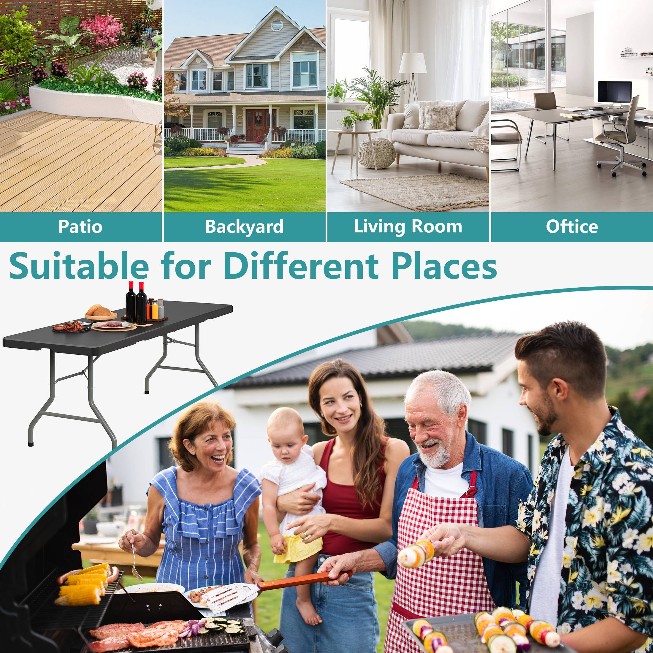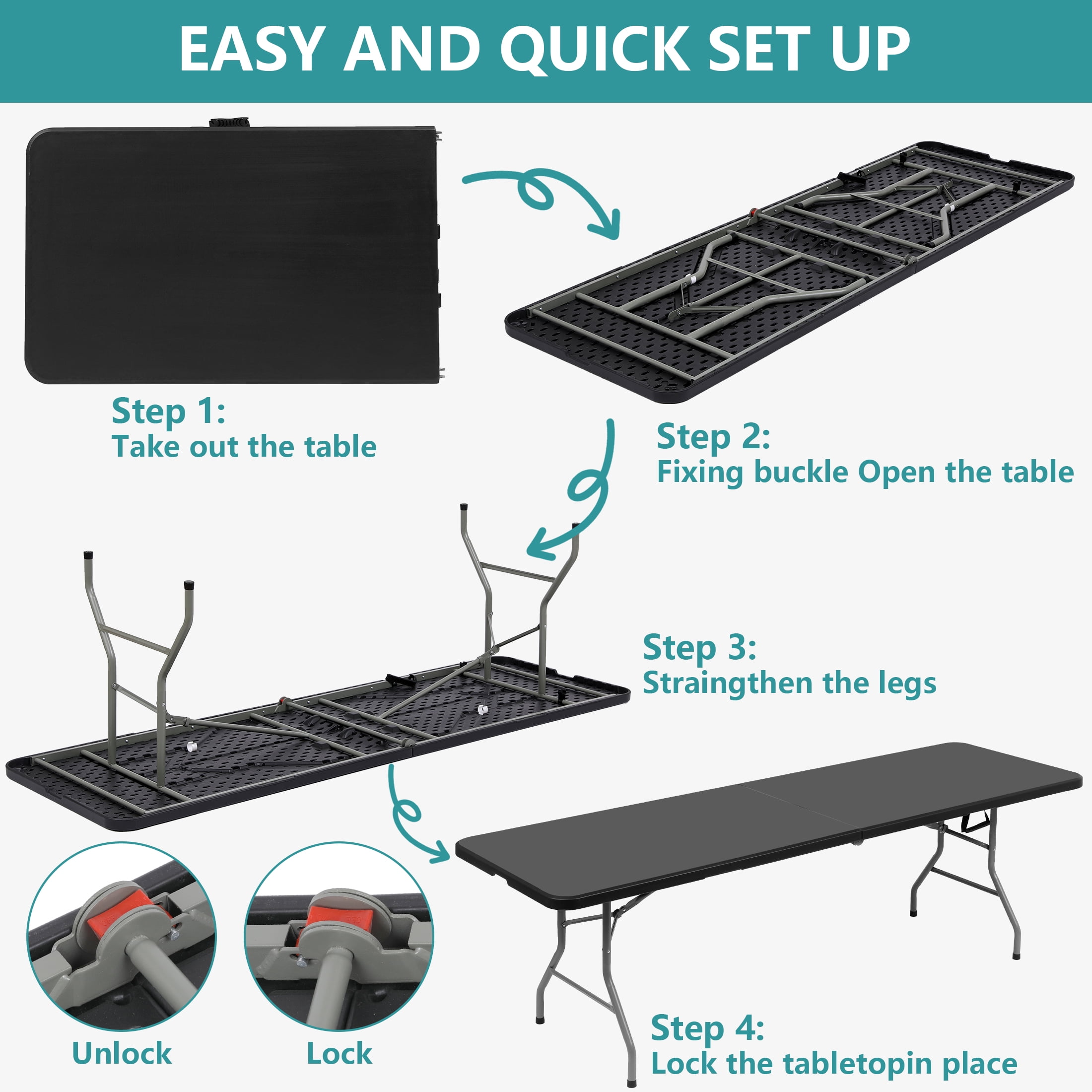 Spacious and Sturdy Design: This 8 foot folding table provides ample surface space and supports up to 330 lbs, making it a reliable choice for all your indoor and outdoor events. Ideal for gatherings, it comfortably seats 8–10 people with its wide, stable structure. Durable and Weather-Resistant Build: Made with high-density polyethylene and powder-coated steel legs, this large folding table is built to withstand daily wear. Its waterproof, scratch-resistant surface ensures easy cleaning and long-term performance in any environment. Enhanced Safety Features: Designed with user safety in mind, the 8′ folding table has rounded corners to prevent injuries and non-slip rubber-capped feet to protect floors. Gravity-lock steel legs offer a secure and stable setup for worry-free use. Portable and Easy to Store: This folding table requires no assembly. Simply fold it in half and use the integrated carry handle for effortless transport. The compact folded size fits in most vehicles—great for events, tailgates, or impromptu picnics. Sleek and Versatile Style: With its clean white surface and modern minimalism, this long folding table suits a wide range of uses—from dining and crafts to birthday parties or BBQs. It blends seamlessly with décor for both casual and formal setups.