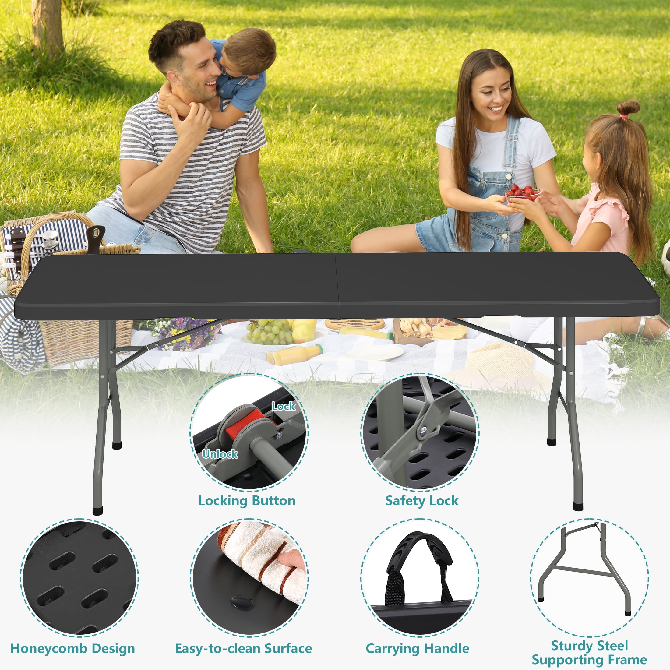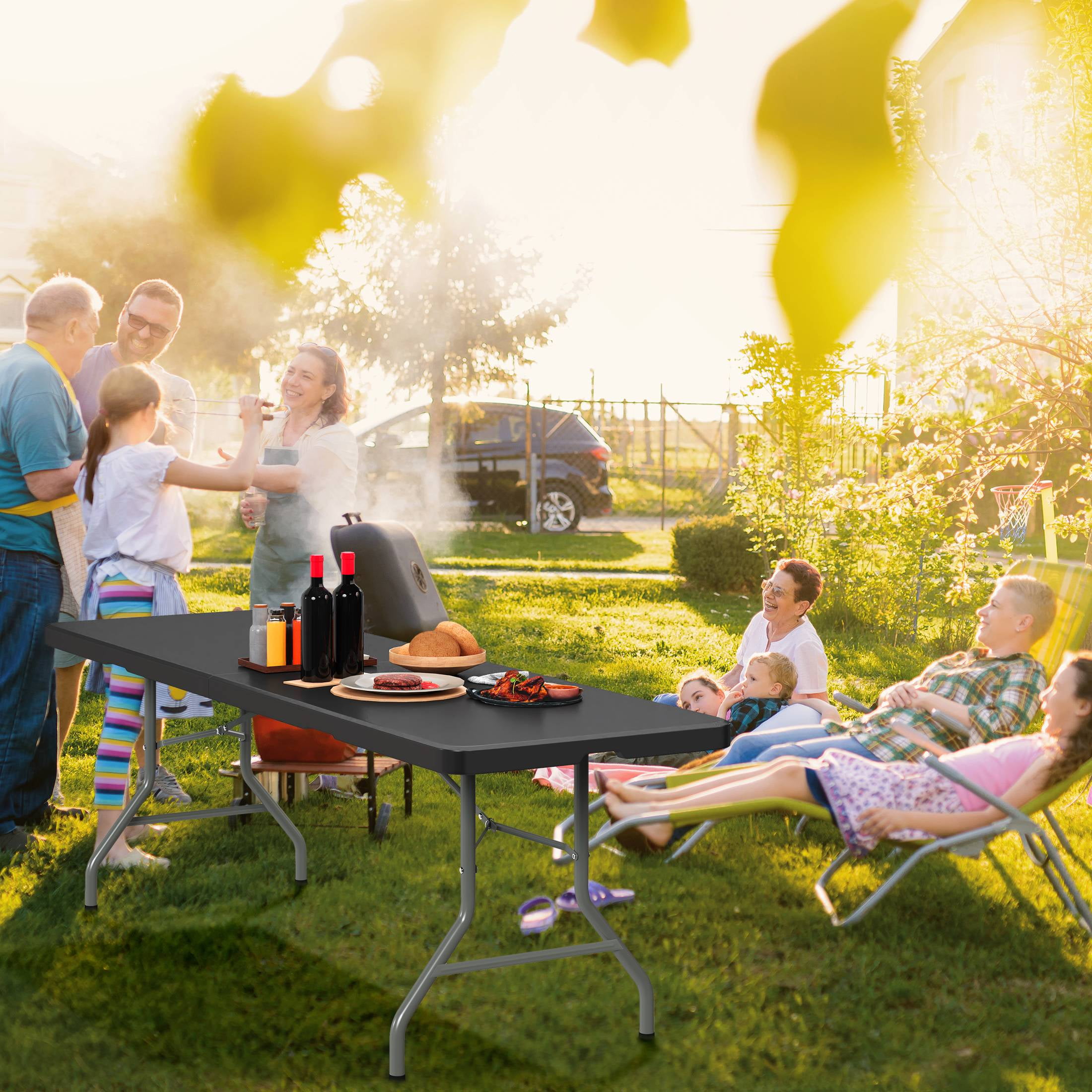 Harigal 8ft Folding Table Portable Fold-in-Half Design with Handle, Large Folding Table for Indoor Outdoor Events, Black
