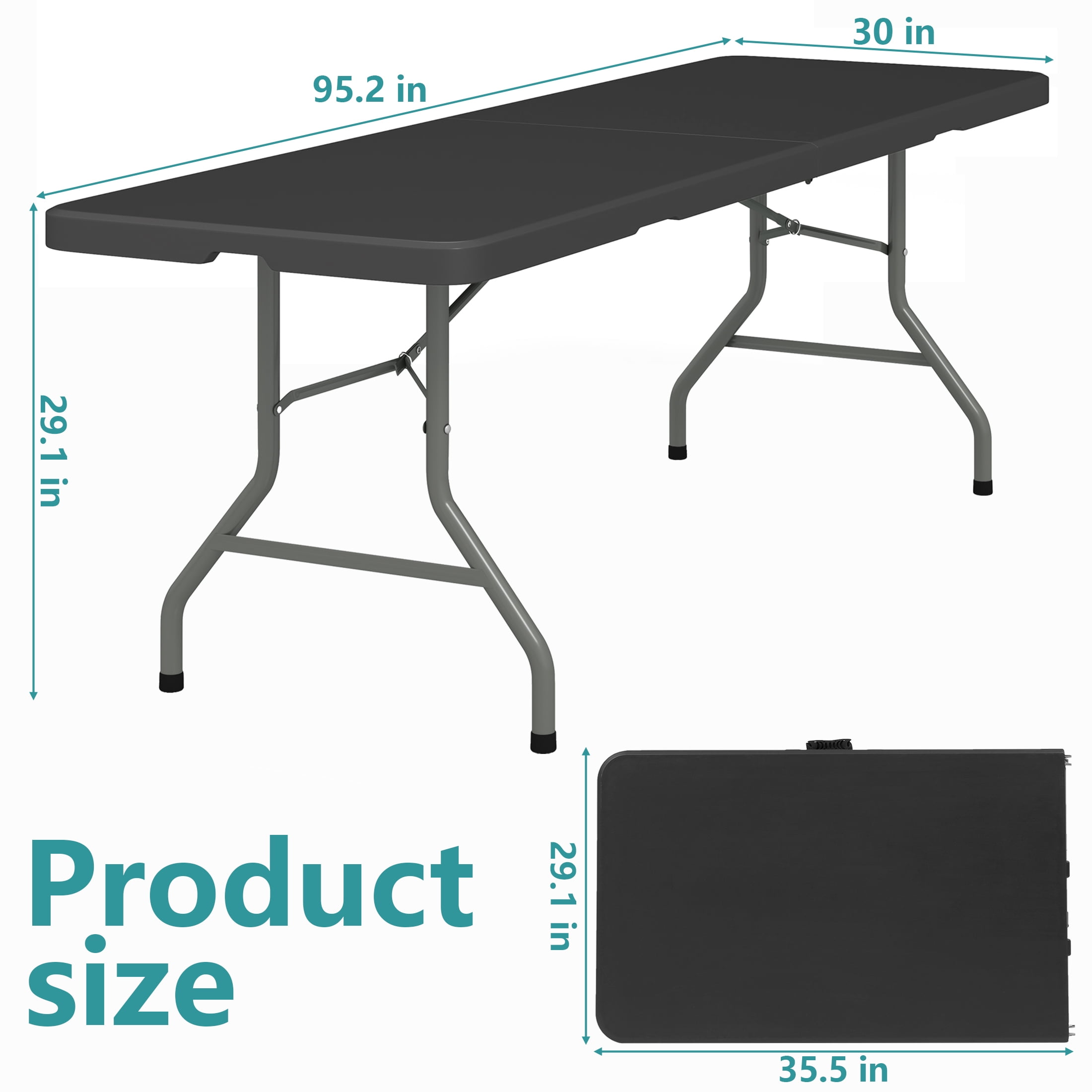Host any event with ease using this 8ft folding table! Built with a durable HDPE surface and steel frame, it’s waterproof, easy to clean, and seats up to 10 people. Folds in half with a carry handle for portability—perfect for indoor parties or outdoor picnics. Specifications: Product Type: Folding Table Unfolded Dimensions: 95.2″ L x 30″ W x 29.1″ H Folded Dimensions: 47.6″ L x 30″ D x 3.2″ H Material: HDPE tabletop + powder-coated steel legs Weight Capacity: 330 lbs Seating Capacity: 8–10 people