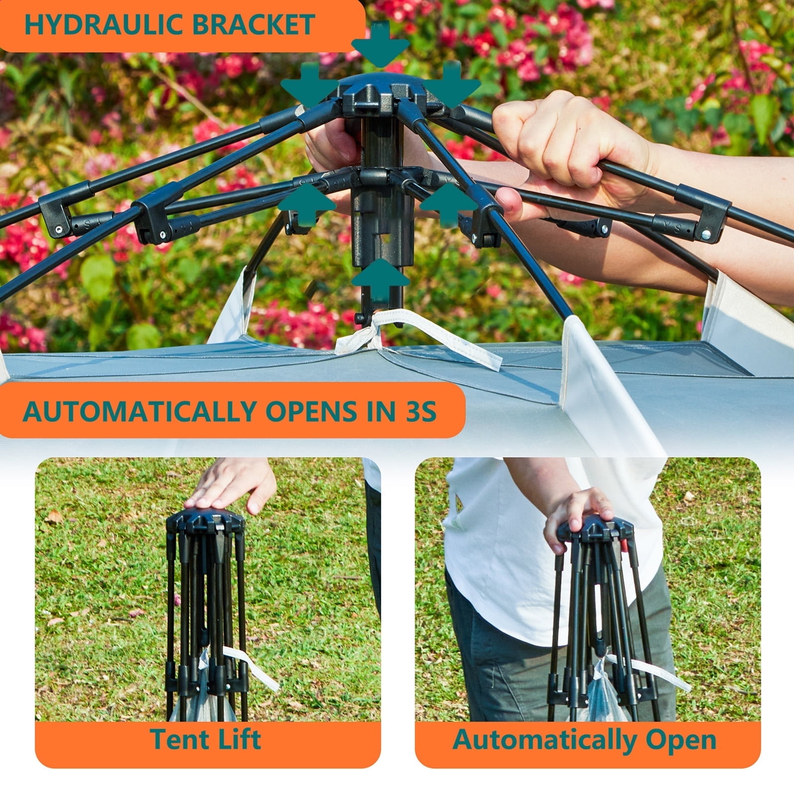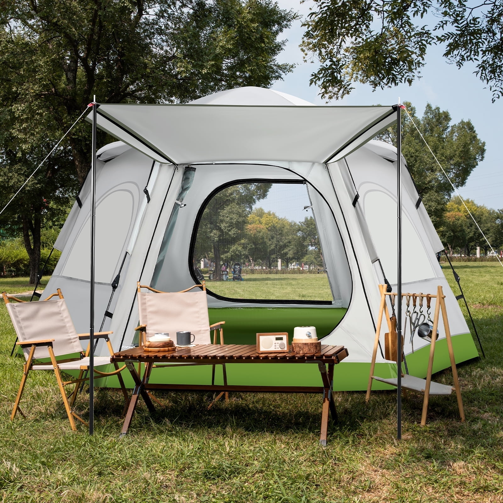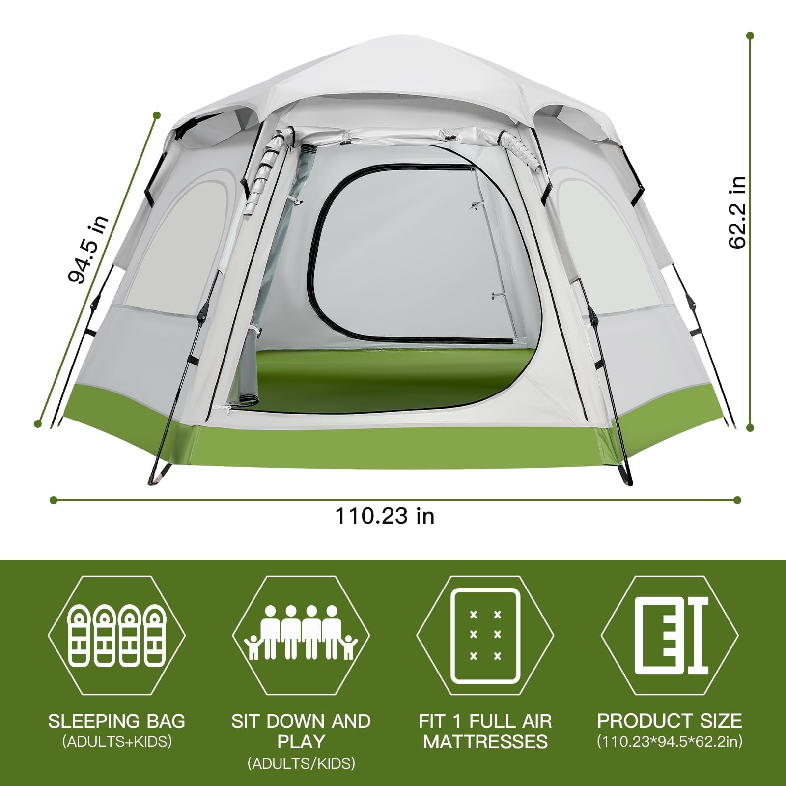 Instant Setup with Easy Operation: This tent camping model uses an innovative design that allows you to lift the top for automatic installation and press the designated part to fold it back down in just 60 seconds All-Season Versatility: Built for year-round use our tents for camping deliver reliable shelter during winter snow or summer rain making them ideal companions for family camping hiking and backpacking trips Lightweight Metal Poles and Front Vestibule: The pop up tents for camping include two lightweight metal door poles that create a functional vestibule adding extra sheltered space without increasing the packing weight Hexagonal Structure for Stability and Durability: The camping tent features a hexagonal design that offers enhanced stability and wind resistance ensuring better performance in harsh weather conditions with extra strength and durability Spacious 4-Person Interior: The tent has a hexagonal base measuring 110.24” ×94.49” ×62.2” easily accommodating four people with spacious comfort for two adults making it a perfect family tent for outdoor adventures