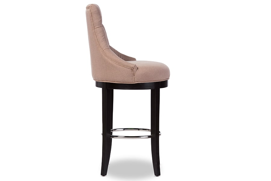 Harmony Modern Fabric Upholstered Bar Stool with Metal Footrest Dine in style. The Harmony Beige Fabric Upholstered Bar Stool is where convenience meets sophisticated dramatic style. The stool makes a statement in style and size with fabric upholstered tufted back making these stools perfect around a bar table. The Harmony barstool features a tall back having beautiful diamond tufts. The curved back fits perfectly against the tightly upholstered round seat. The exposed wood base has tapered legs that flare out as they meet the floor. A metal foot ring, available in chromed steel finish completes the stool. Made in China, the Harmony requires assembly. Specifications: Frame material: Solid wood Beige upholstery Stylish and inventive, manufactured to the highest quality standards