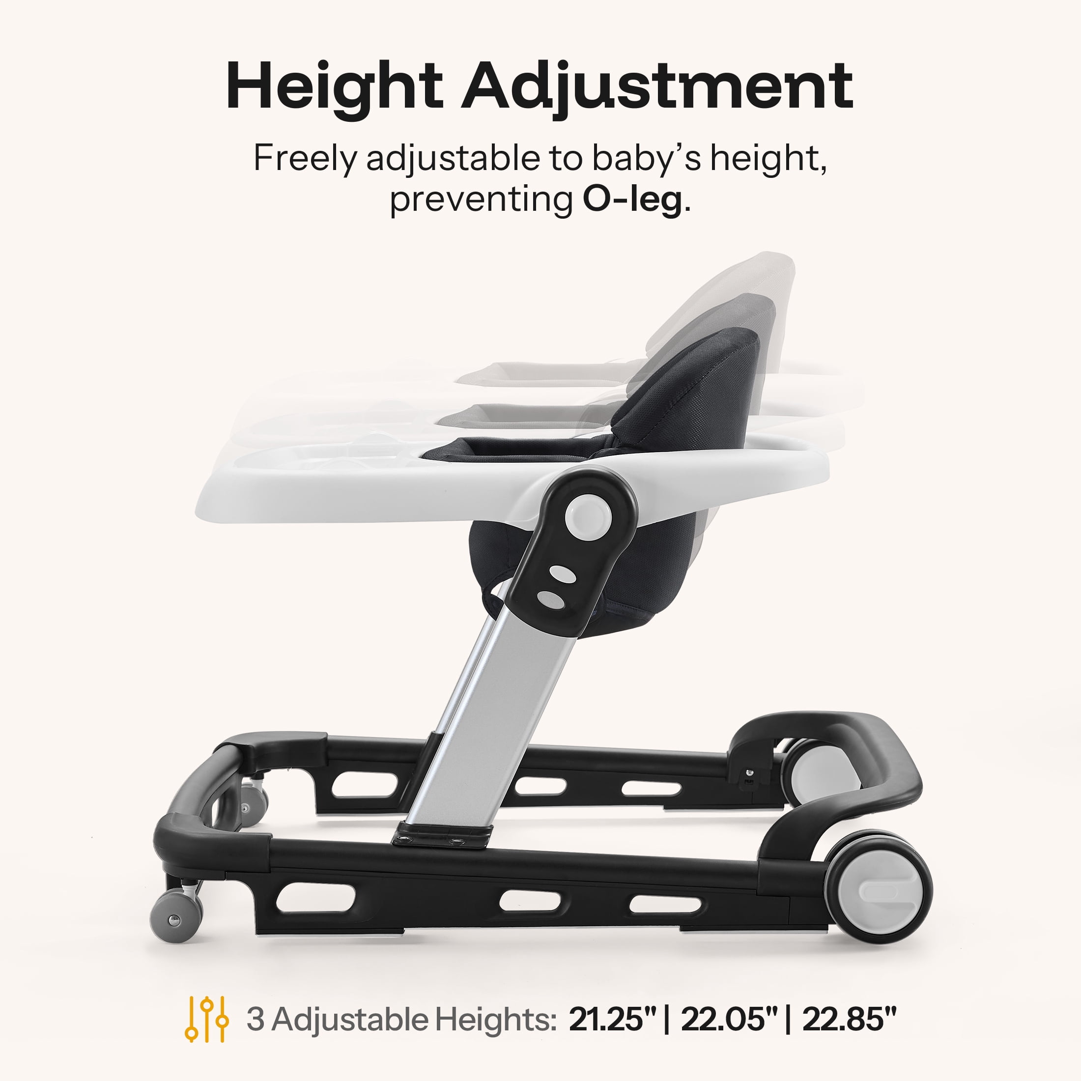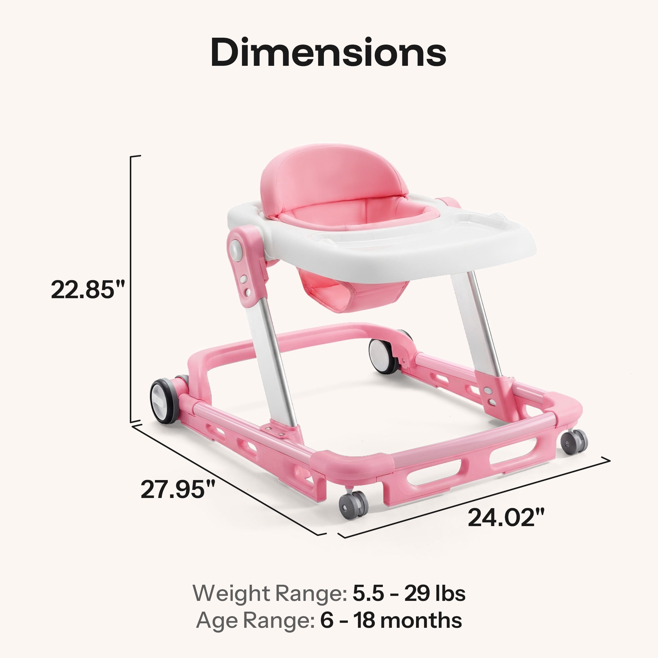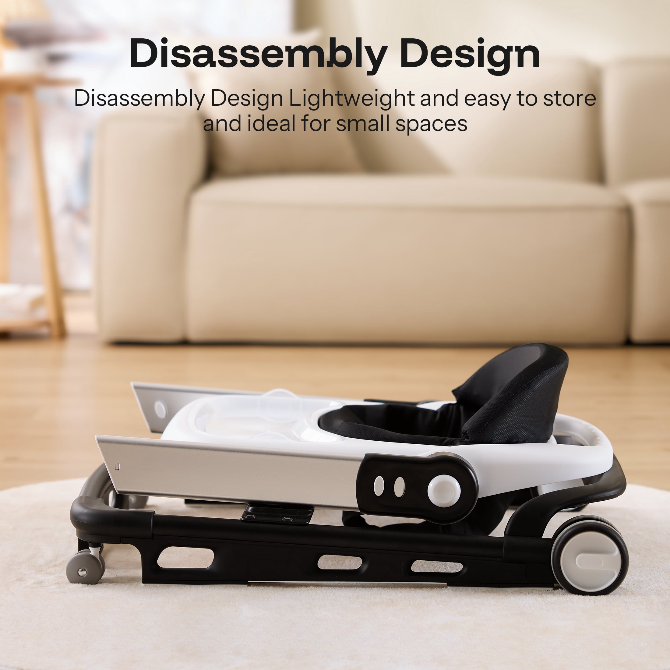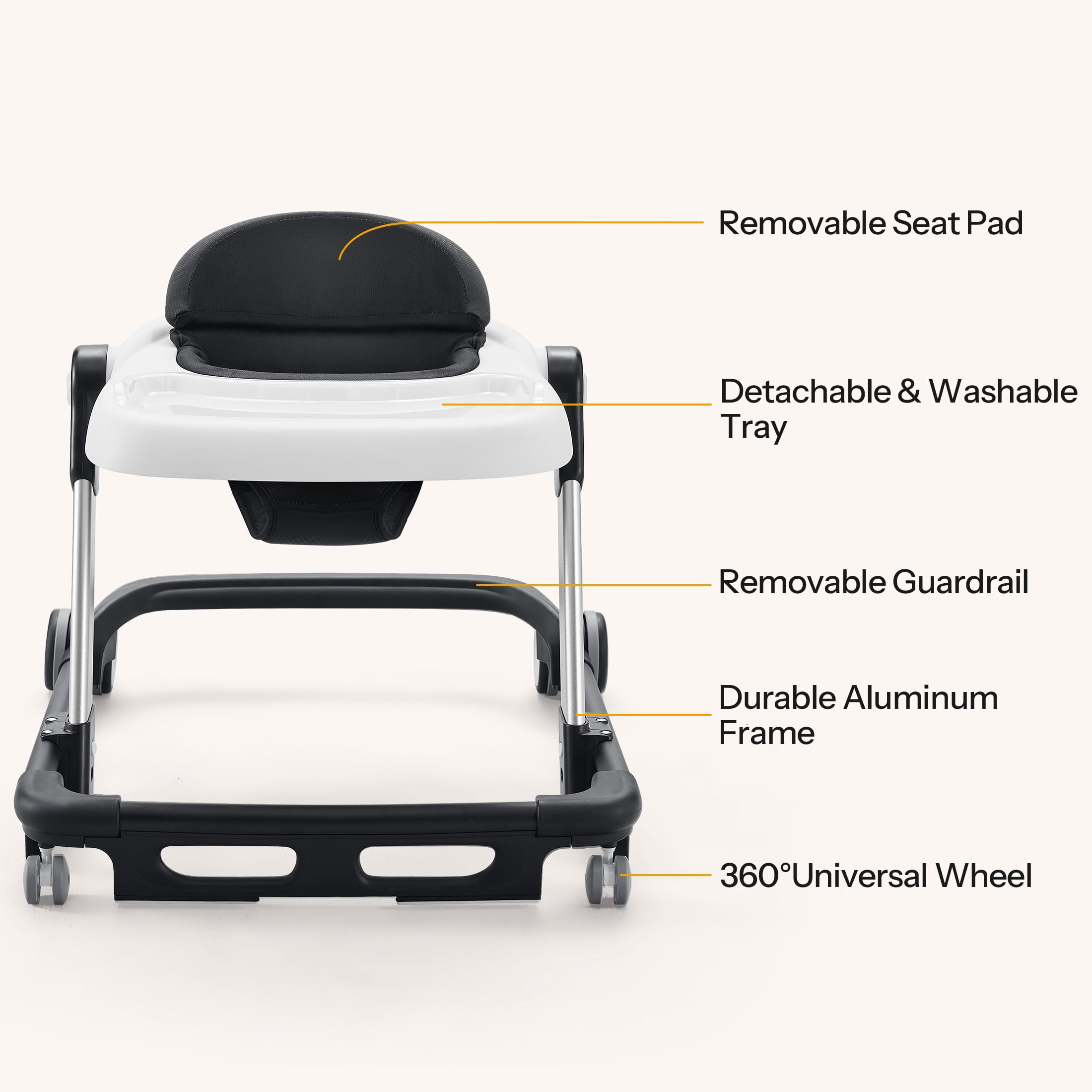 Avoid bow legs 360° rotatable and parking brakes wheel 4 gear adjustable seat 5-position adjustable height Anti-rollover folding baby walker 3 Mode: Baby walker & Push walker & Bouncing Platform Detachable seat cover for easy cleaning Safety bumper provides additional protection Quick to fold and can be storage under the bed Speed can be adjusted according to baby’s needs Brand: HARPPA Gross Weight: 8.6lbs Weight Capacity: 30lbs Age Range: 6-24months(Baby waker 6-12months; Push walker12-24months) Size: 25″ x 25″ x 19.1″(L x W x H) Color Options:Black/White/Blue/Gray/Green/Pink Material: PP + Sponge + Cloth (Seat Cover) + steel (support arms)