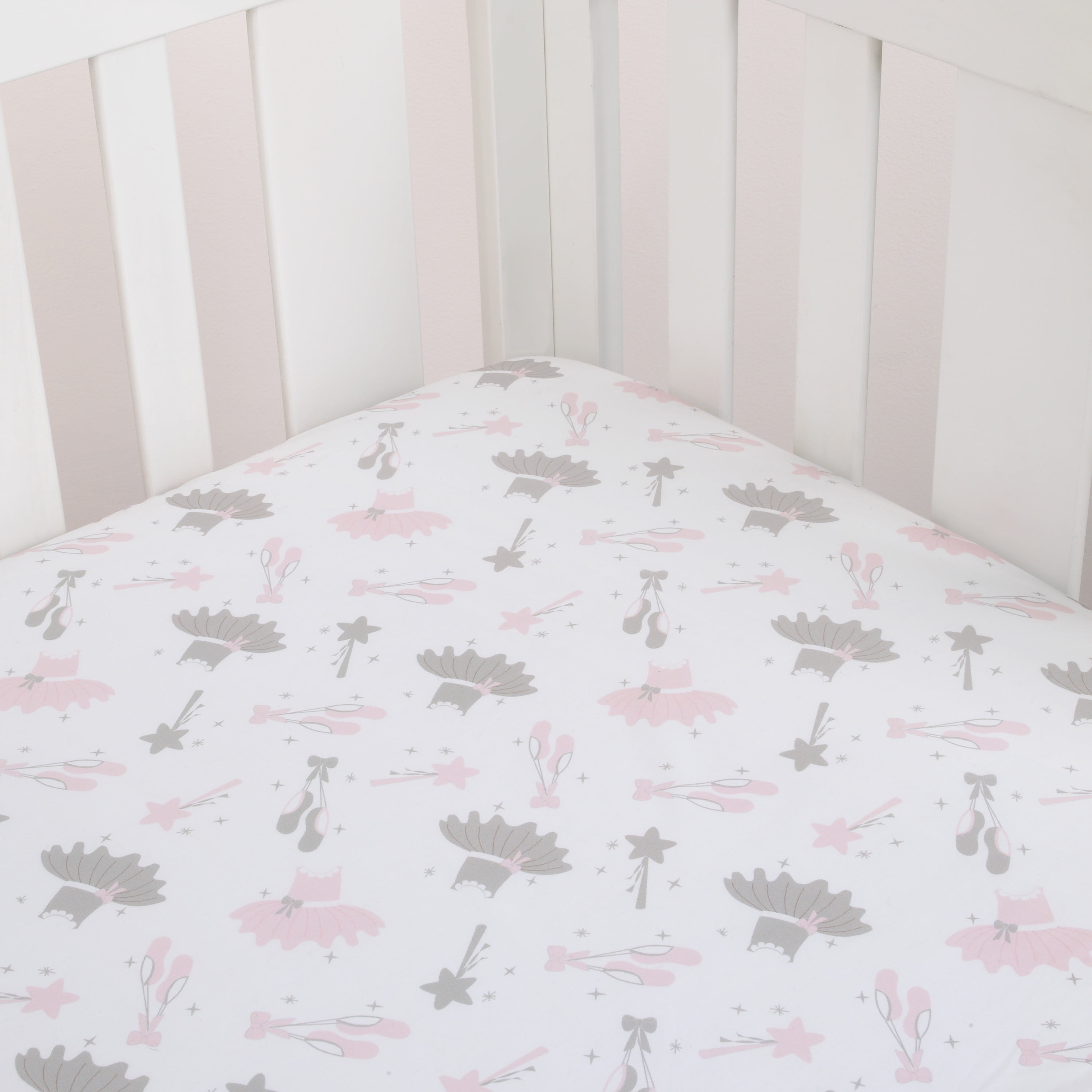CLASSICAL: Our Ballerina Bows 4-Piece Crib Set is a great way to turn your baby’s crib into a stunning elegant, ballet theme. This collection is full of sparkle and will provide a comfortable yet elegant space for sleeping and countless photo op memories. PERFECT FIT: Everything you need is included in this adorable, classic crib set: 45” x 36” double-sided comforter, 52” x 28” fitted sheet, 51″ x 27″ crib skirt and a 12″ x 8″ storage bin. FASHIONABLE: The Ballerina Bows Crib Set will incorporate nicely into the design of your baby’s nursery – turn your room into the nursery of your dreams. GIFTABLE: This all in one crib set is a great gift for baby showers – make sleep time a little more fun by giving this thoughtful crib set. QUALITY: We are the standard in high-quality stylish baby and toddler bedding, blankets, and décor – we are a trusted name in child product manufacturing. Coordinates with a full line of Ballerina Bows Bedding and Accessories by NoJo!