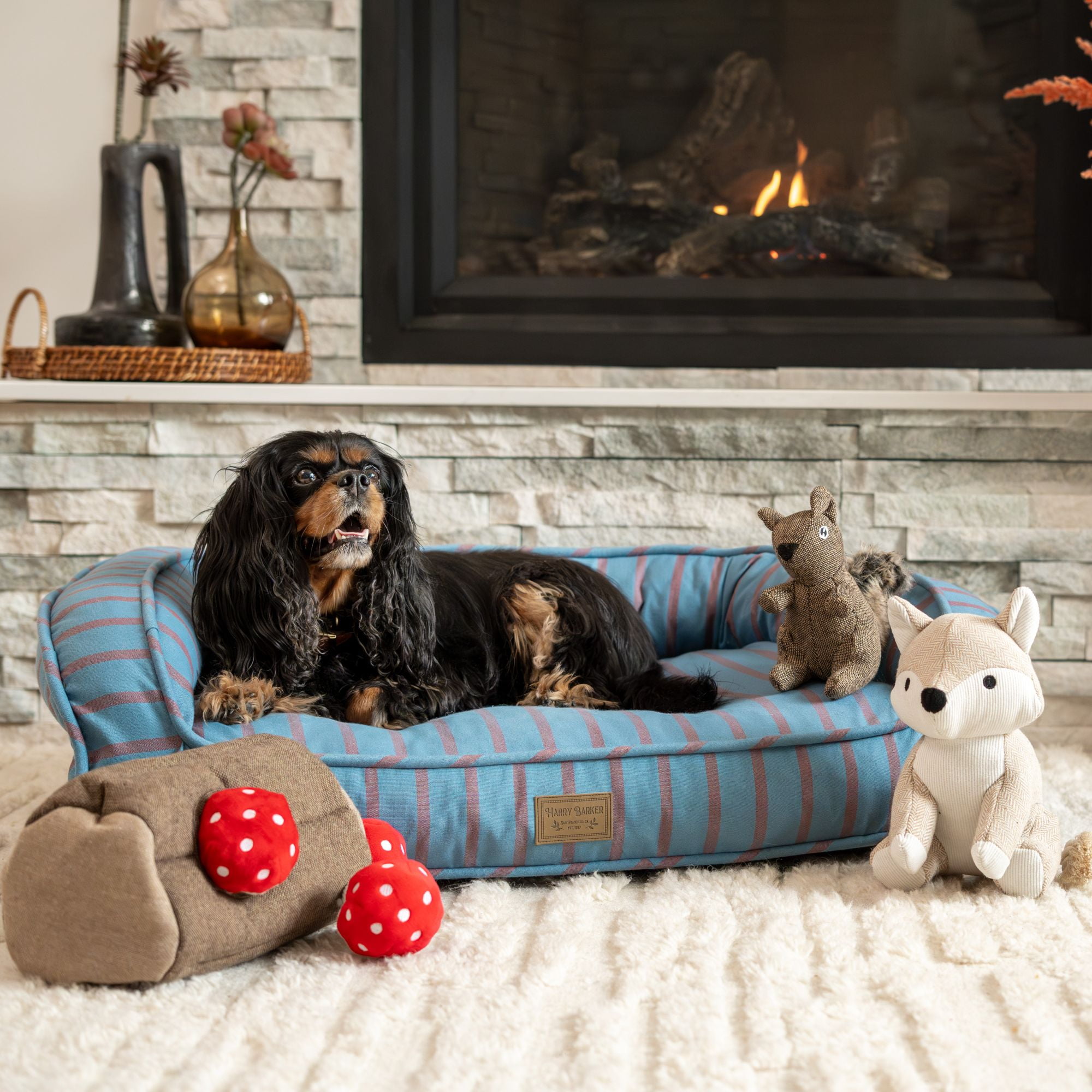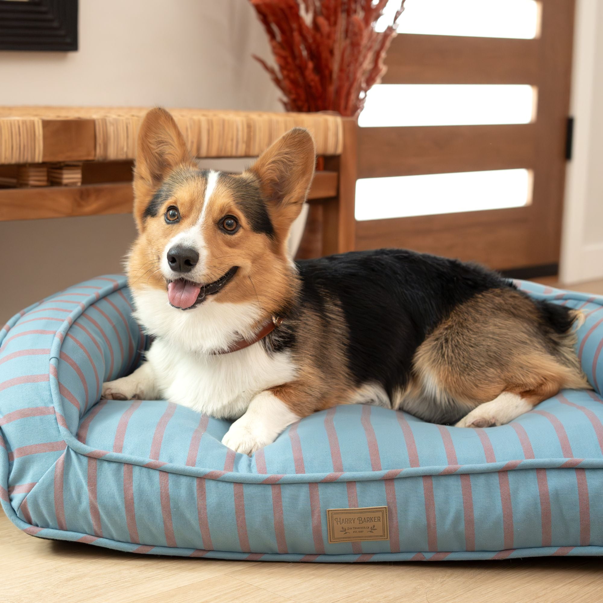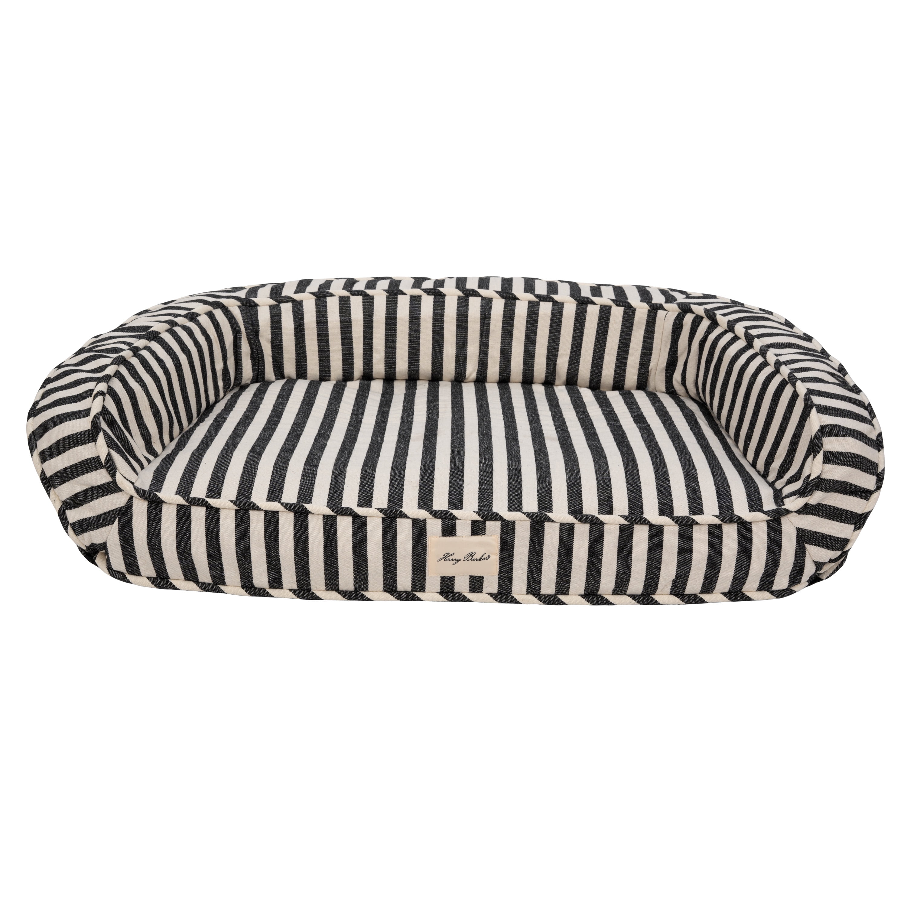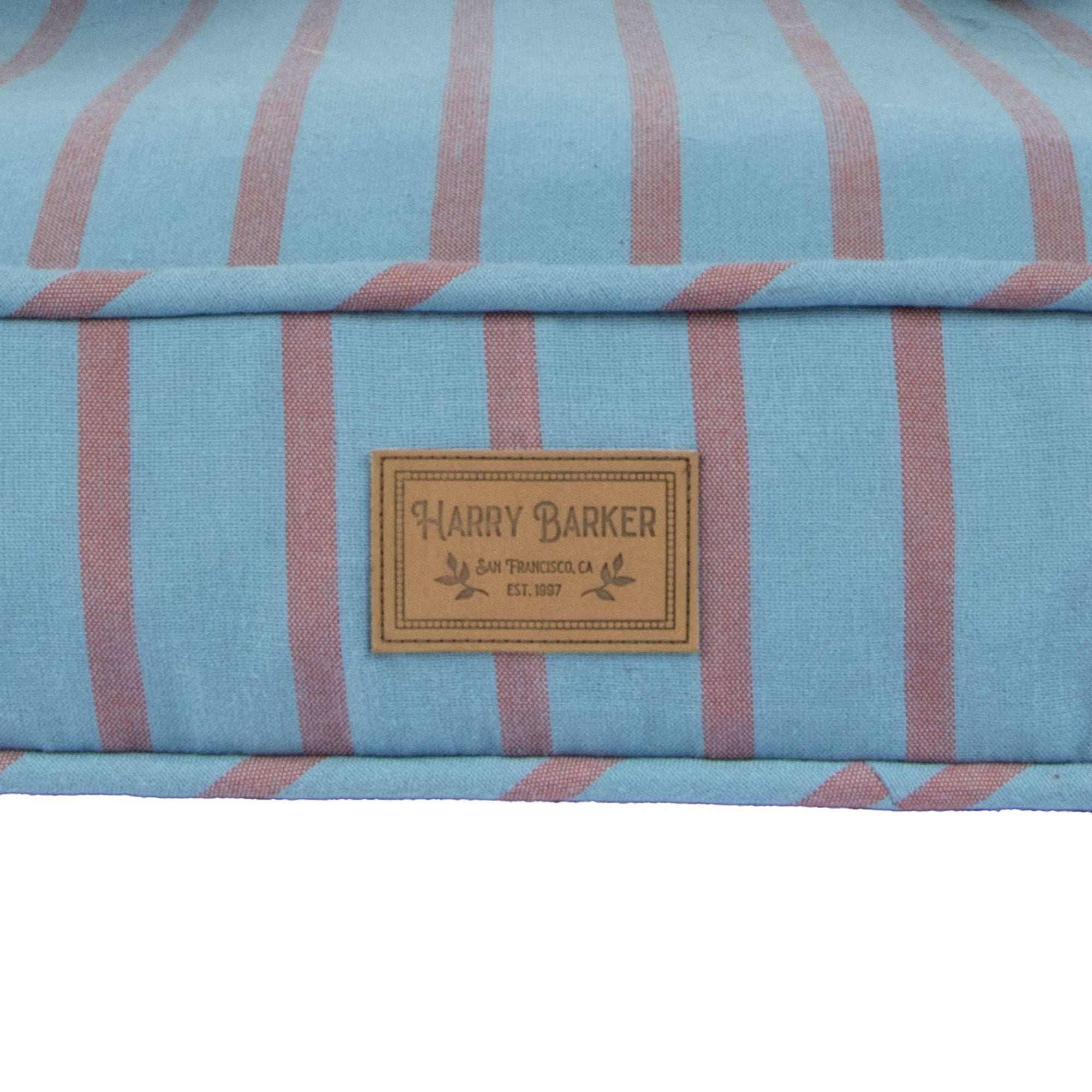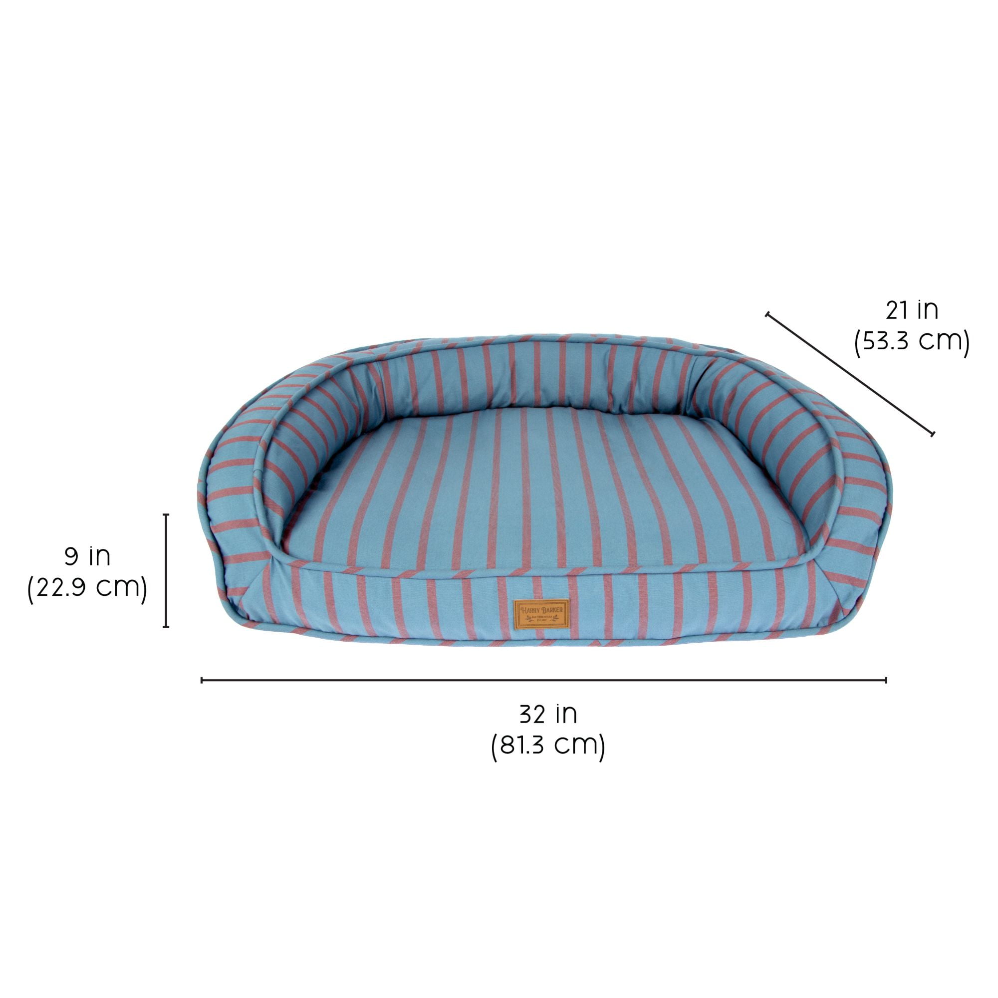 Premium Materials & Craftsmanship: Fashioned with meticulous attention to detail, the exterior of this pet bed boasts a stylish custom woven blue and rust colored yarn dye stripe, adding a touch of sophistication to any room. Ultimate Lounger: Filled with chipped memory foam on the bottom and soft filling along the back and sidewalls, it provides a luxurious and supportive retreat for your furry friend. Eco-Friendly Commitment: At the heart of this indulgent pet bed is its commitment to sustainability. The eco-friendly recycled poly filling not only ensures a cloud-like feel for your pet but also reflects our dedication to environmentally conscious living. Your pet can now enjoy a guilt-free nap in unparalleled luxury. Easy Maintenance: For added convenience, the removable insert allows for easy cleaning, ensuring a fresh and inviting space for your pet. The backside zipper provides effortless access, simplifying the process of maintaining your pet’s favorite spot. Cover is machine washable on cold, tumble dry low, no bleach. Branded Elegance: Adding a touch of exclusivity, the bed features a signature Harry Barker debossed patch – a symbol of quality and sophistication. Let your pet bask in the luxury they deserve with a bed that not only pampers them but also enhances the aesthetic of your living space. Medium: 30″L x 20″W x 8″H