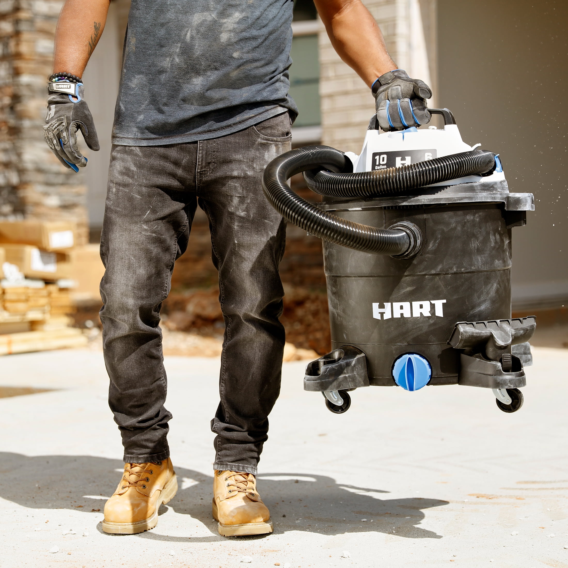 The HART 10 Gallon Wet/Dry Vacuum is the perfect size for a variety of tasks around the house, shop, or jobsite. With a 6 Peak HP motor this vacuum makes cleanup easy, whether it’s dust collection in the shop or liquid spills at home. The balanced top handle design and durable casters provide stable transportation during and after use. The on-board hose, cord, and accessory storage allows you to keep all of your attachments organized and your workspace tidy. This wet/dry vac comes standard with an array of locking accessories, so you don’t have to worry about attachments disconnecting during even the toughest jobs. Turning this vac into a blower to remove debris from your yard or workspace could not be easier – all it takes is a simple conversion.