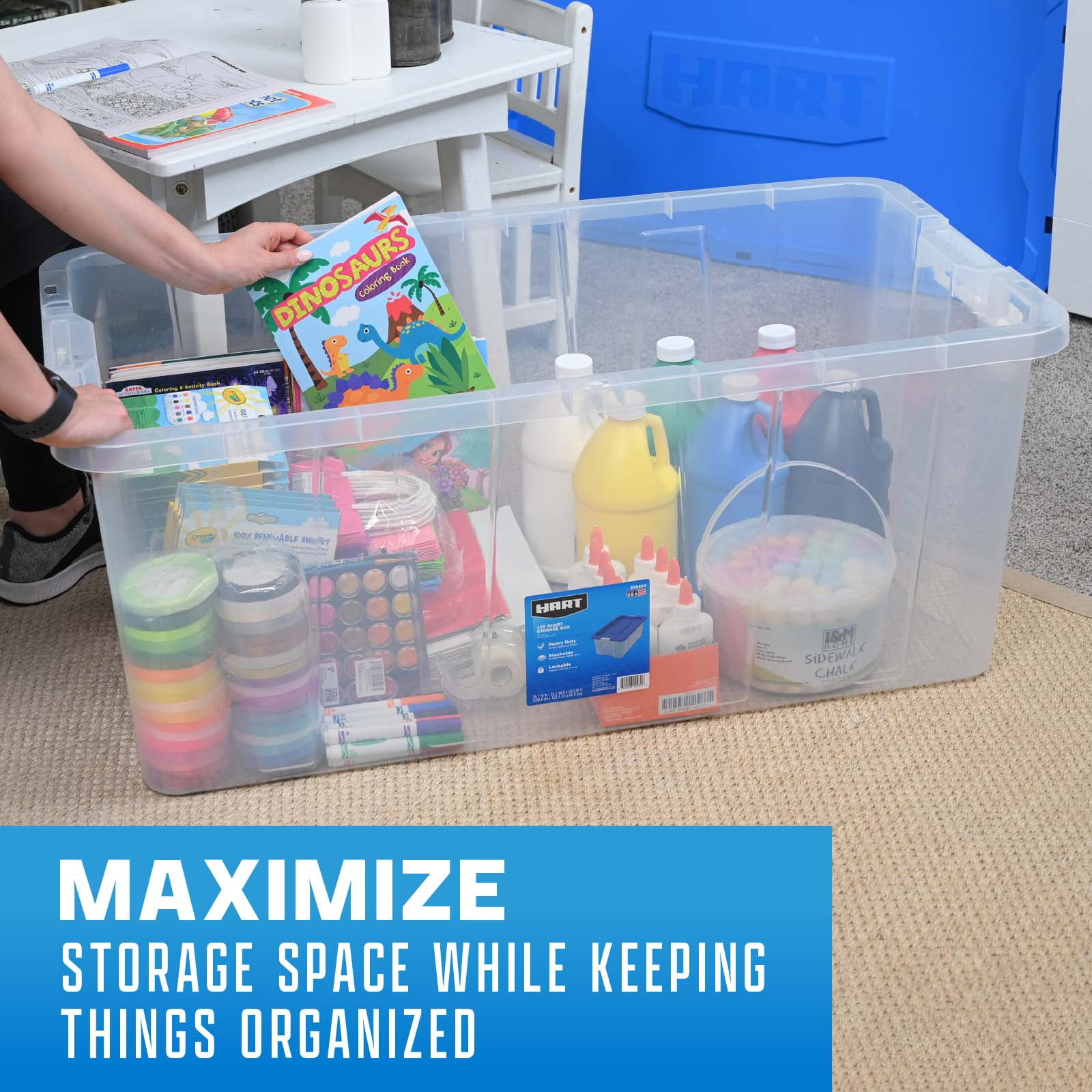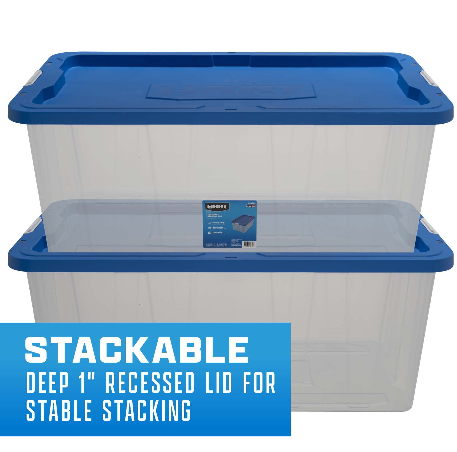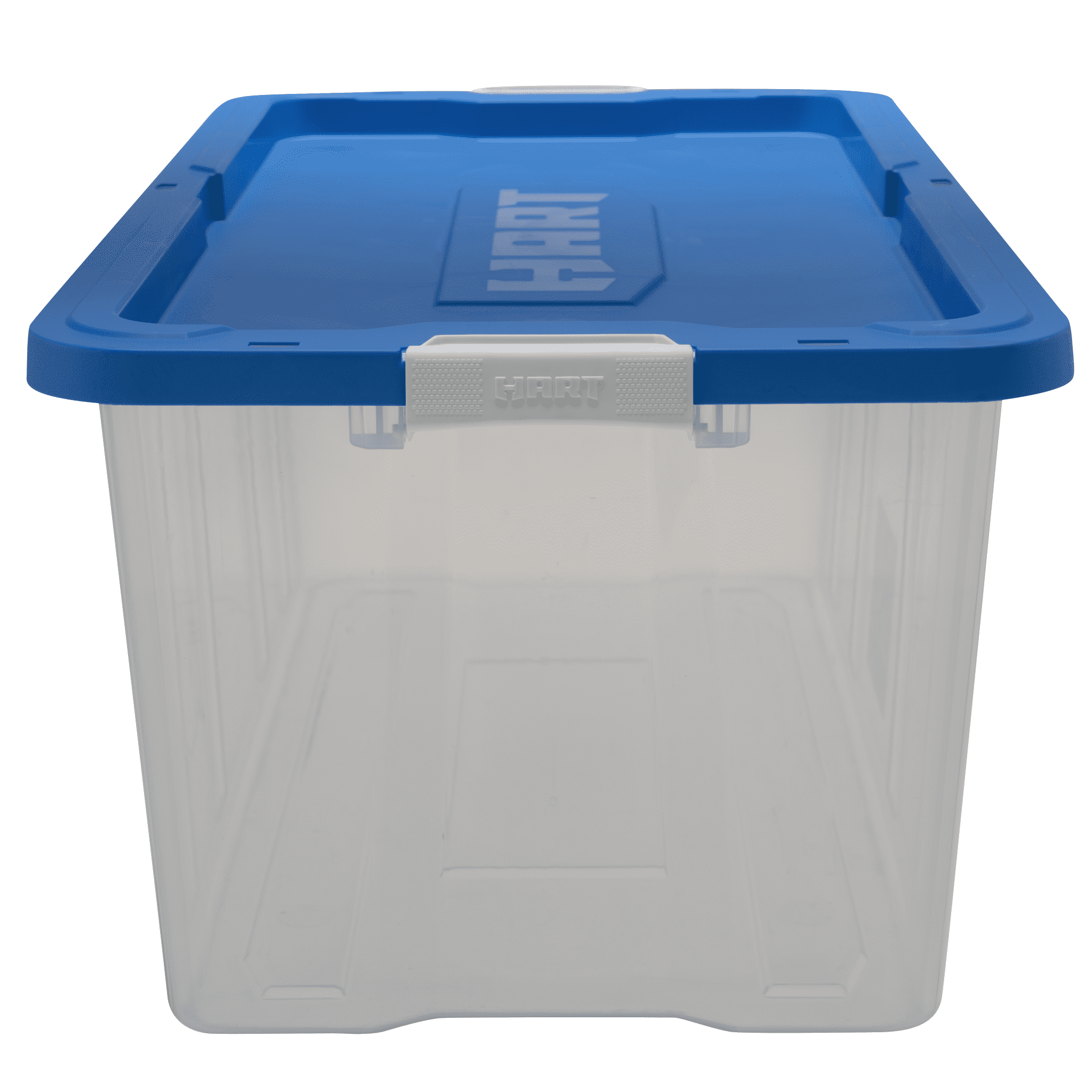 The HART 160 Quart Clear Latching Plastic Storage Tote Box, Clear Base/Blue Lid, Set of 3 provides you with an easy storage and organization solution to reduce clutter and increase space in your home. Take the guess work out of trying to locate what you have stores, the clear see-through storage box makes it easy to find what you need, when you need it. Made durable plastic, the strong rigid walls of the storage tote are stackable to maximize storage space and Protect your valuables and keepsakes from dust, dirt, bug, and water damage Two latch grip handles make it easy to transport while making sure the lid stays closed The medium 160 quart size is great when needing to store larger and bulkier items
