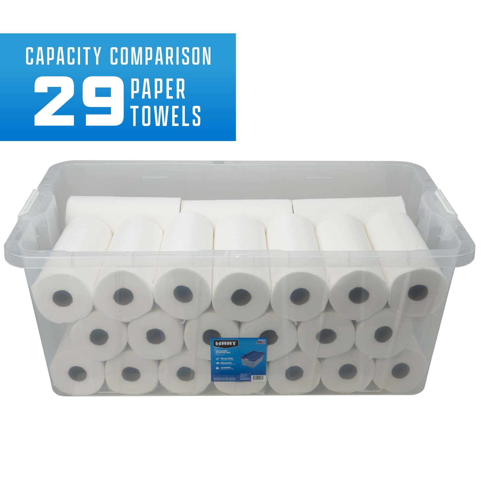 The HART 160 Quart Latching Plastic Storage Bin Container, Clear, Set of 3 Base/Blue Lid, Set of 3 provides you with an easy storage and organization solution to reduce clutter and increase space in your home. Take the guess work out of trying to locate what you have stores, these clear see-through storage bins makes it easy to find what you need, when you need it. Made durable plastic, the strong rigid walls of these storage containers are stackable to maximize storage space and to stay sturdy when stacked. Protect your valuables and keepsakes from dust, dirt, bug, and water damage in a stylish way. The two latch grip handles make it easy to transport or use for moving valuable around while making sure the lid stays closed. The medium 160 quart size is great when needing to store larger and bulkier items.