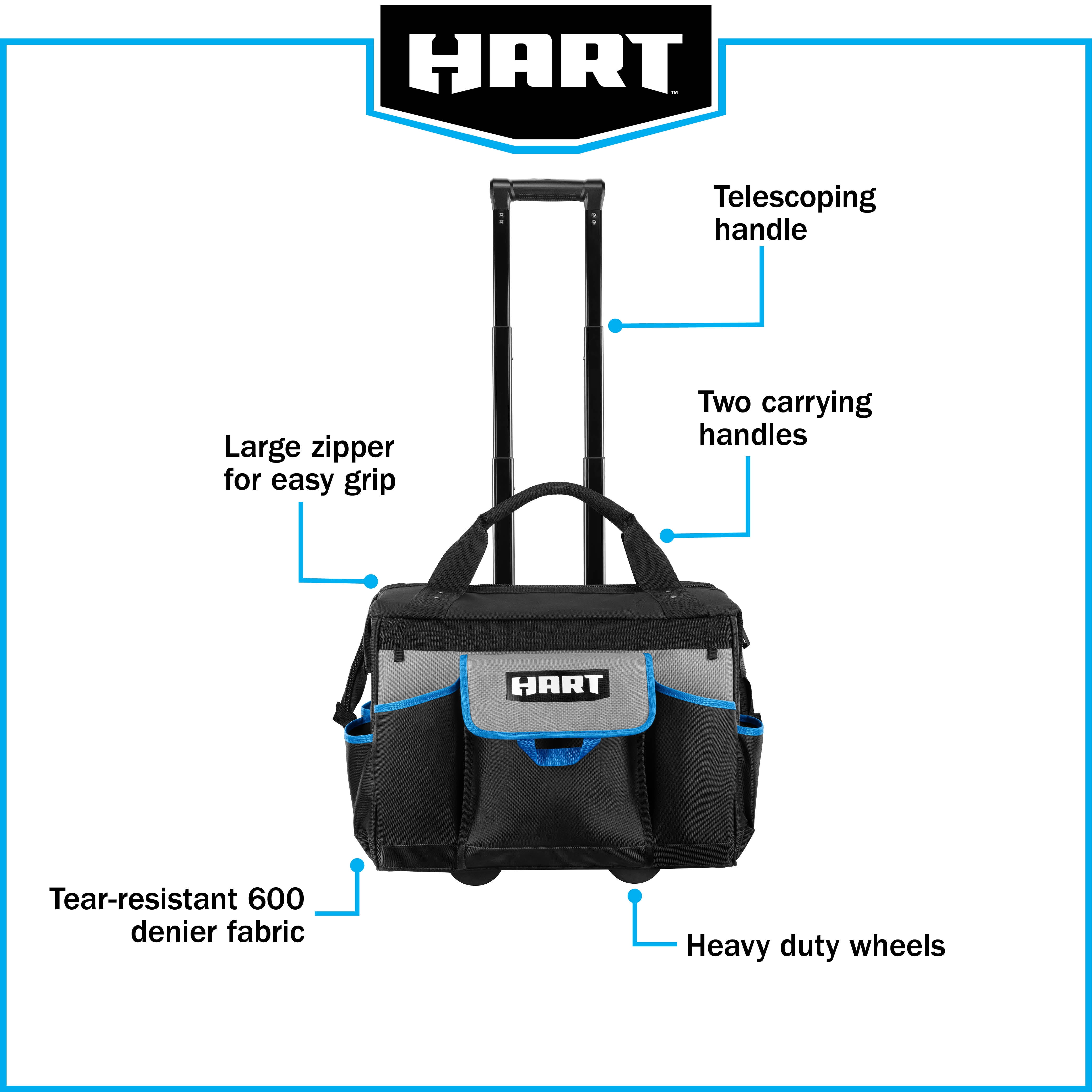 HART 18-inch Rolling Tool Bag, Waterproof Bottom, Telescoping Pull Handle