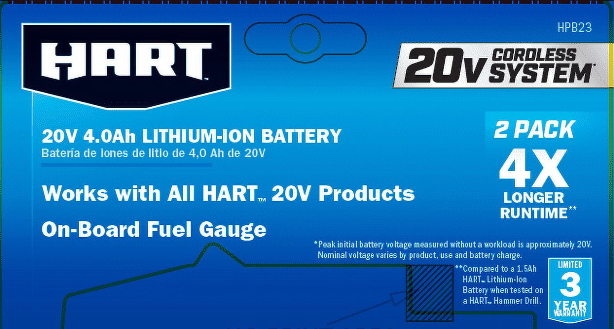 More Power than a standard 1.5Ah battery Works with All HART 20V Tools The 20V one battery system allows you to interchange the battery on all 20V HART products. It powers all HART 20V tools, outdoor, automotive and lifestyle items 4X Longer Runtime On-Board Fuel Gauge Battery chart that is on the back of packaging Works with All HART 20V Tools Fade free Lithium-Ion power Includes: (2) 4.0Ah 20V Lithium-Ion Battery Disclaimer: Compared to a 1.5Ah HART Lithium-Ion Battery tested on a HART Hammer Drill Battery: 20V Lithium-Ion Model: HPB23