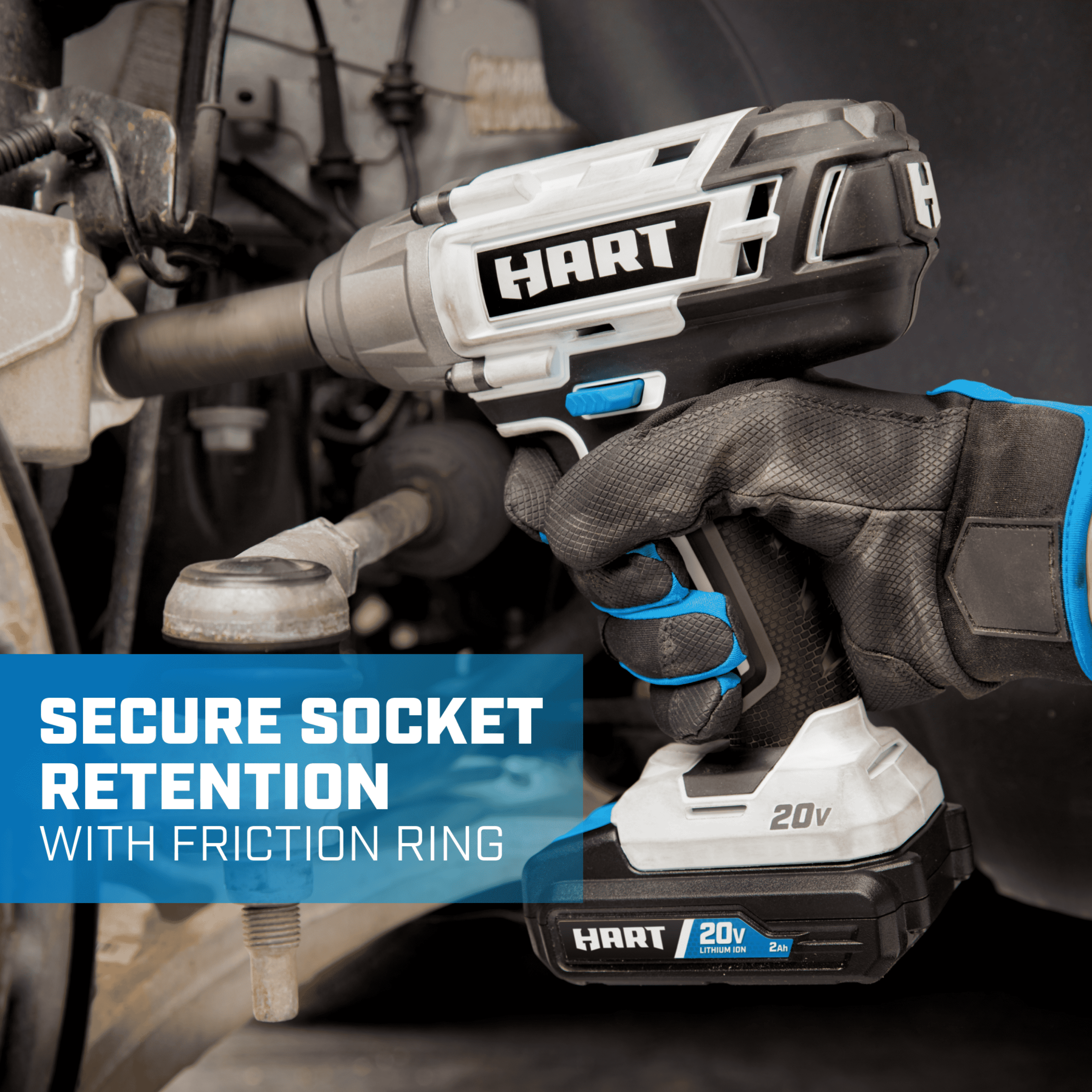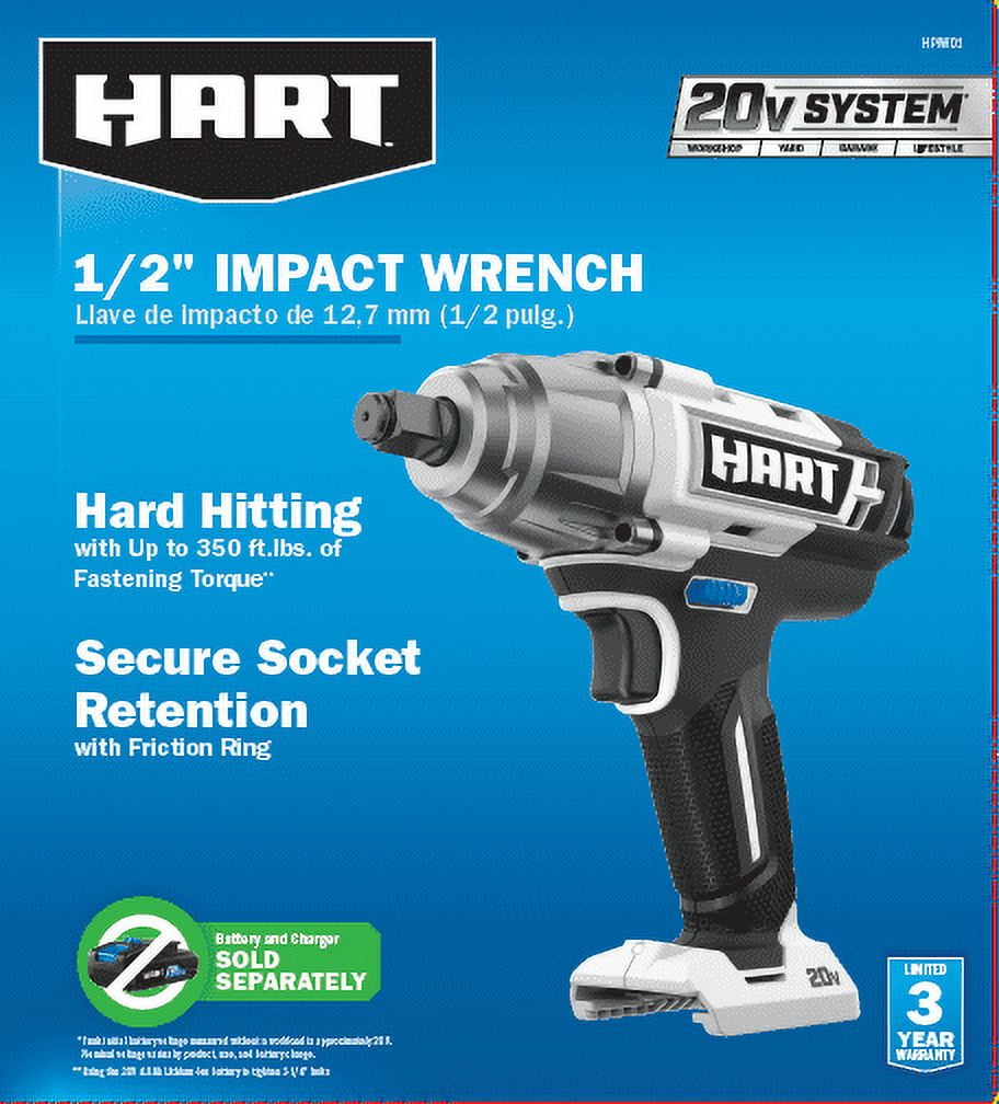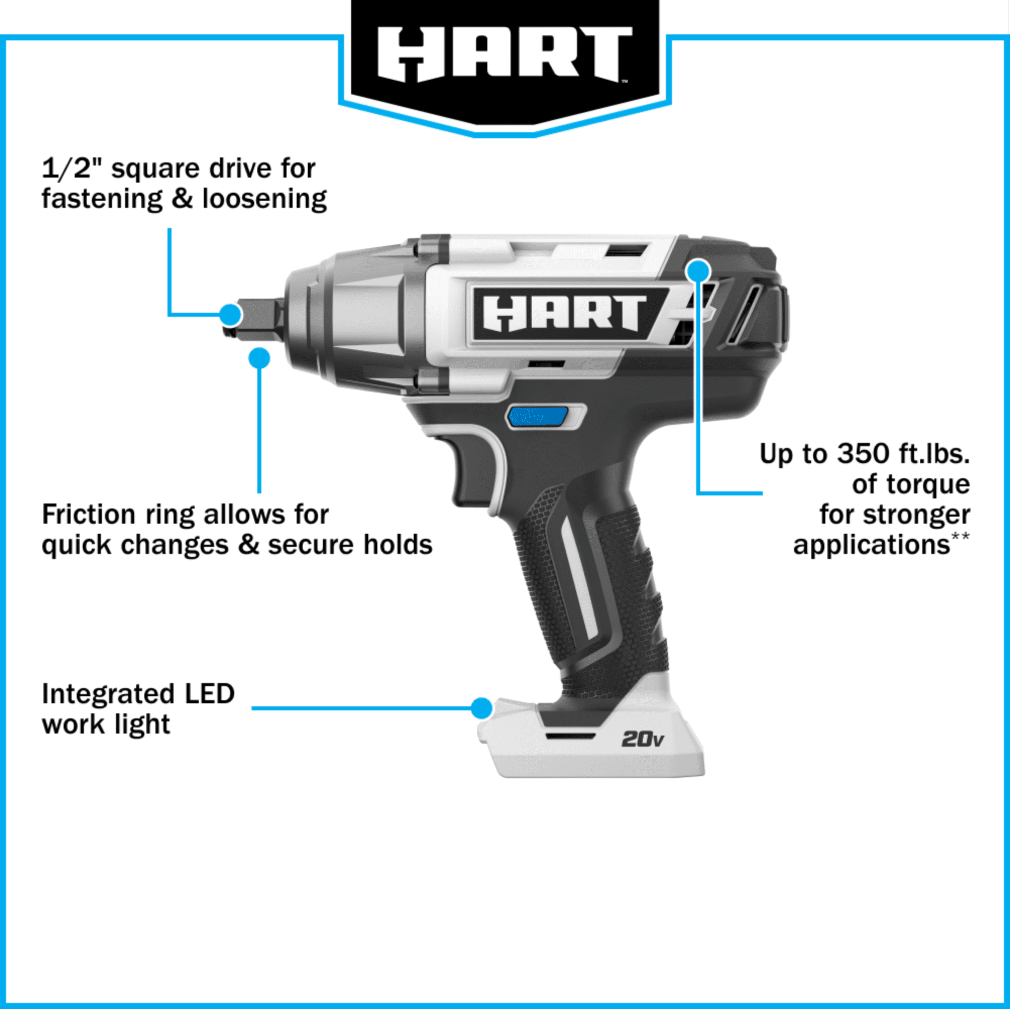 1/2” square drive for fastening and loosening nuts and bolts Friction ring allows for quick changes and provides secure hold on sockets Integrated LED work light to increase visibility for application Produces up to 350 ft.lbs. of torque for stronger applications* Compatible with all HART 20-Volt batteries New condition