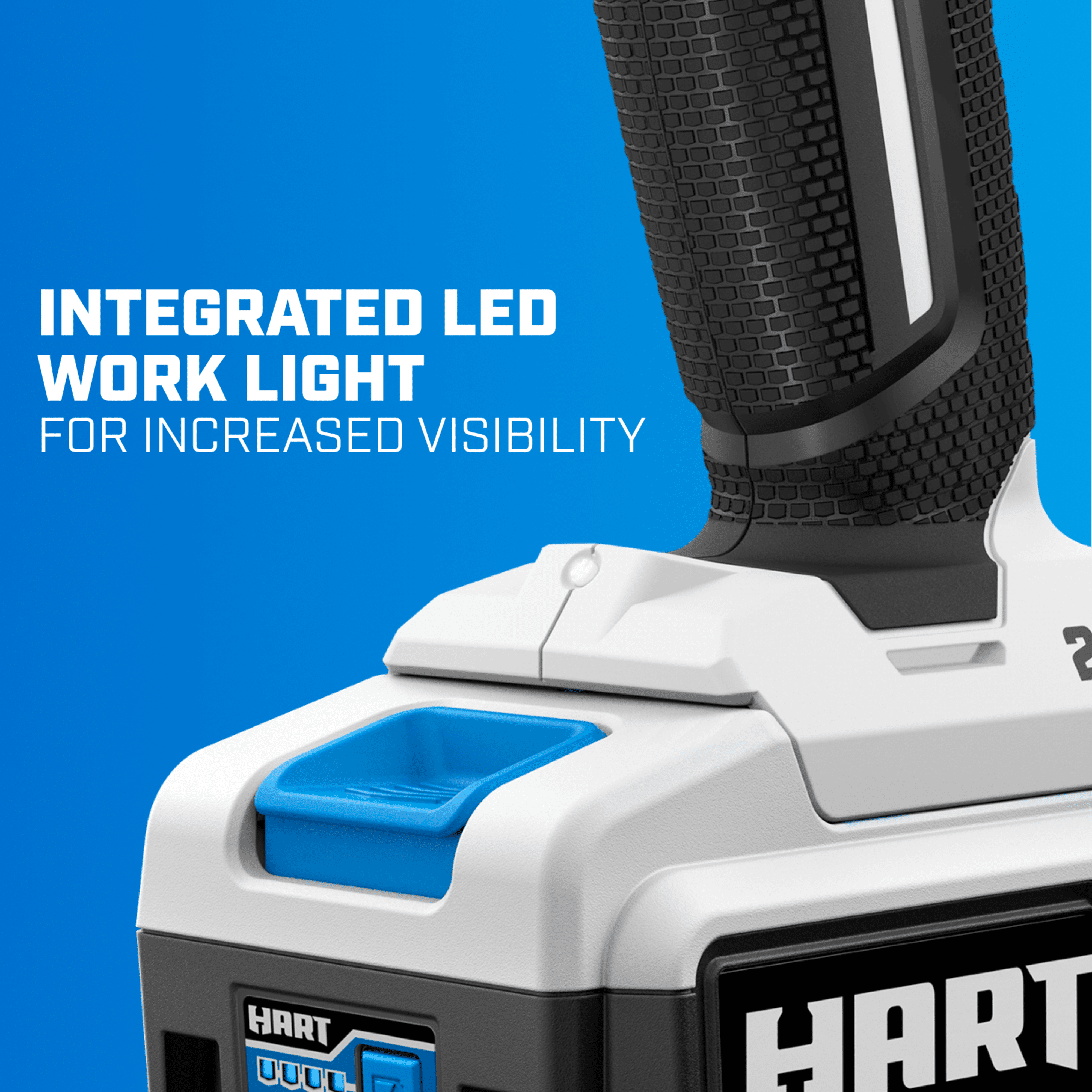 The HART 20V ½-inch Impact Wrench is a great, new addition for DIY mechanics. It’s strong, with a powerful motor that can handle tough tasks, like tightening or loosening big nuts and bolts and delivering up to 350 ft/lbs. of torque. You can easily change sockets thanks to the friction ring, and the built-in LED light helps you see better in tight spots under your car’s hood. Plus, it uses the same HART 20V Lithium-Ion Battery as other HART tools, so you can expand your tool collection without buying more batteries and chargers. (Battery and Charger Not Included). White & black in color. Disclaimer: *Using the 20V 4.0Ah lithium-ion battery to tighten 1-1/4″ bolts.