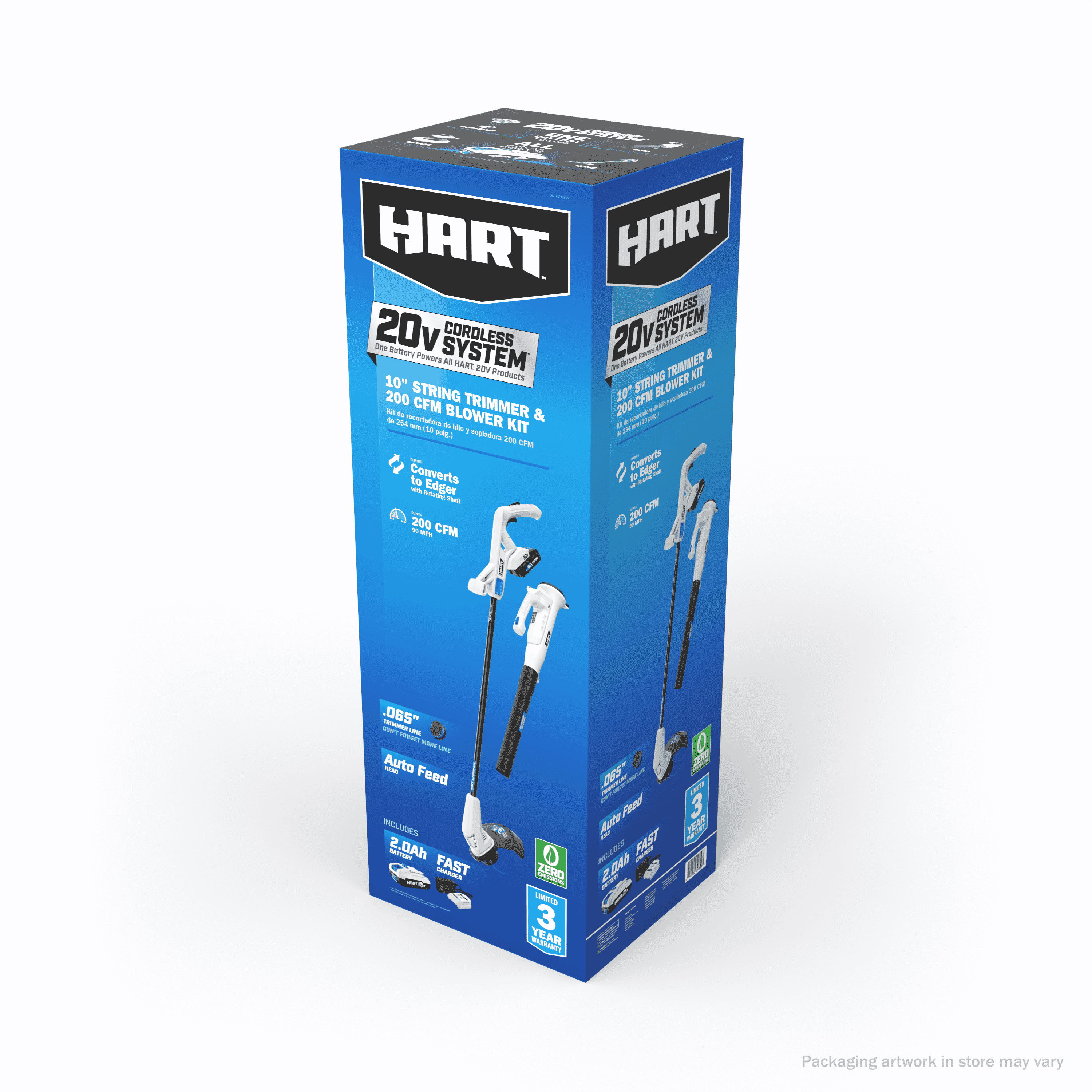 Tackle your light to medium duty trimming and blowing needs with the HART 20V String Trimmer/Bazooka Blower Combo Kit. The 10” auto-feed head requires no bumping and releases approximately ¼” of line every time you release the trigger. Easily switch your trimmer into a dedicated edger by rotating the shaft. The 20V Bazooka Blower provides 200CFM and 90MPH, which is perfect for sweeping debris off hard surfaces. The included HART 20V Battery is compatible with all HART 20V tools. The HART 20V 10” String Trimmer, HART 20V Bazooka Blower, and HART 20V battery are covered by 3-year limited warranties.