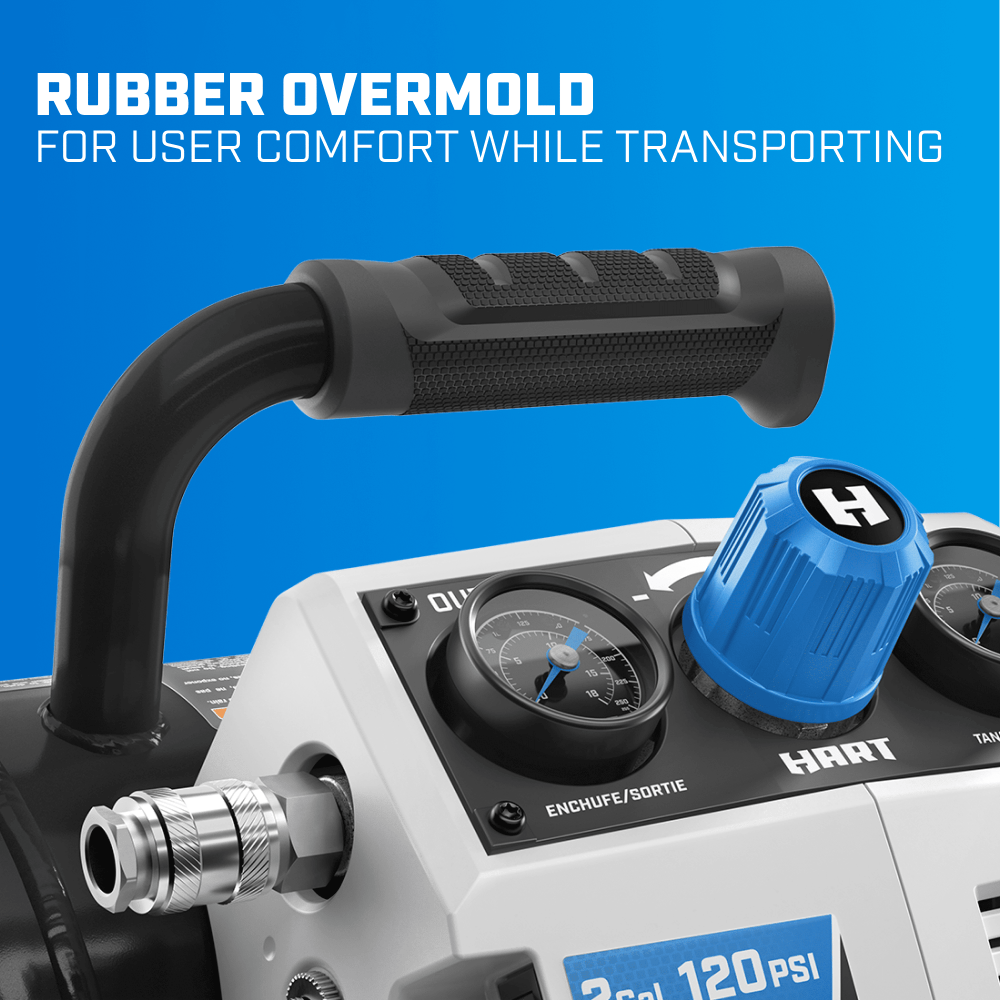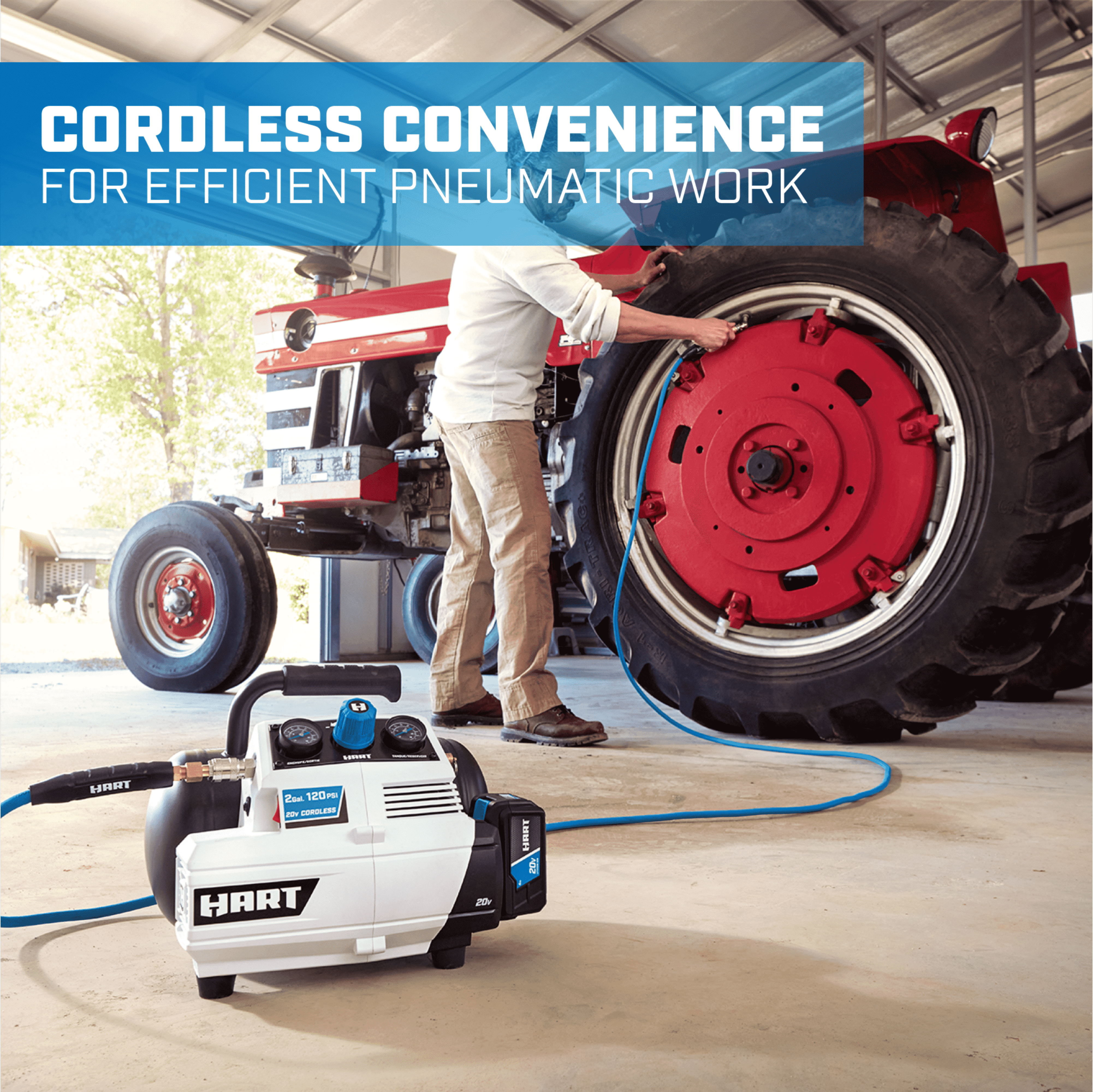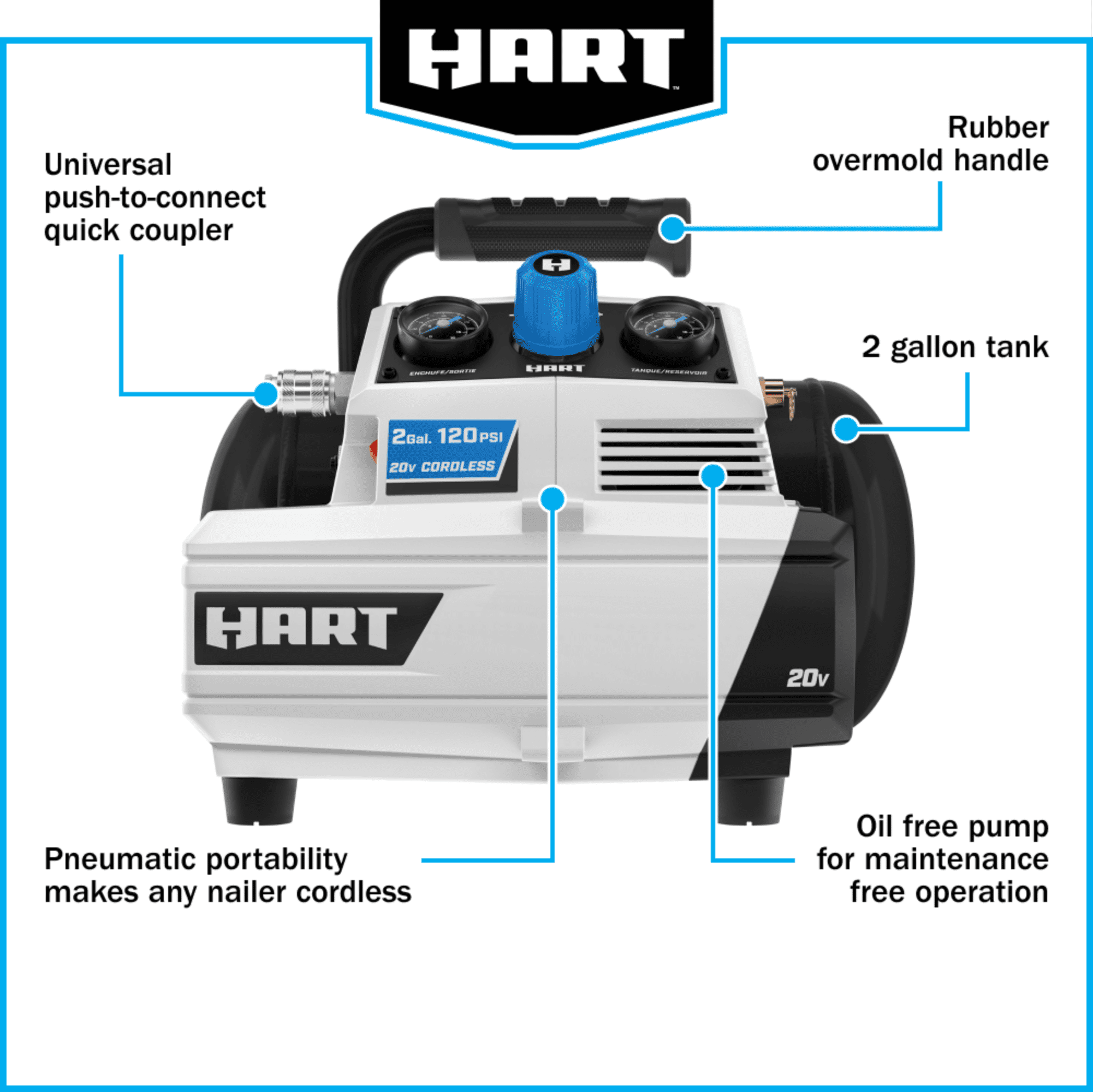 Cordless convenience for efficient pneumatic work Flat to full tire in under 1 minute Rubber overmold handle for user comfort while transporting 2-gallon tank provides extra air storage capacity Oil-free pump for maintenance-free operation 3-year limited warranty Works with all HART 20V Batteries