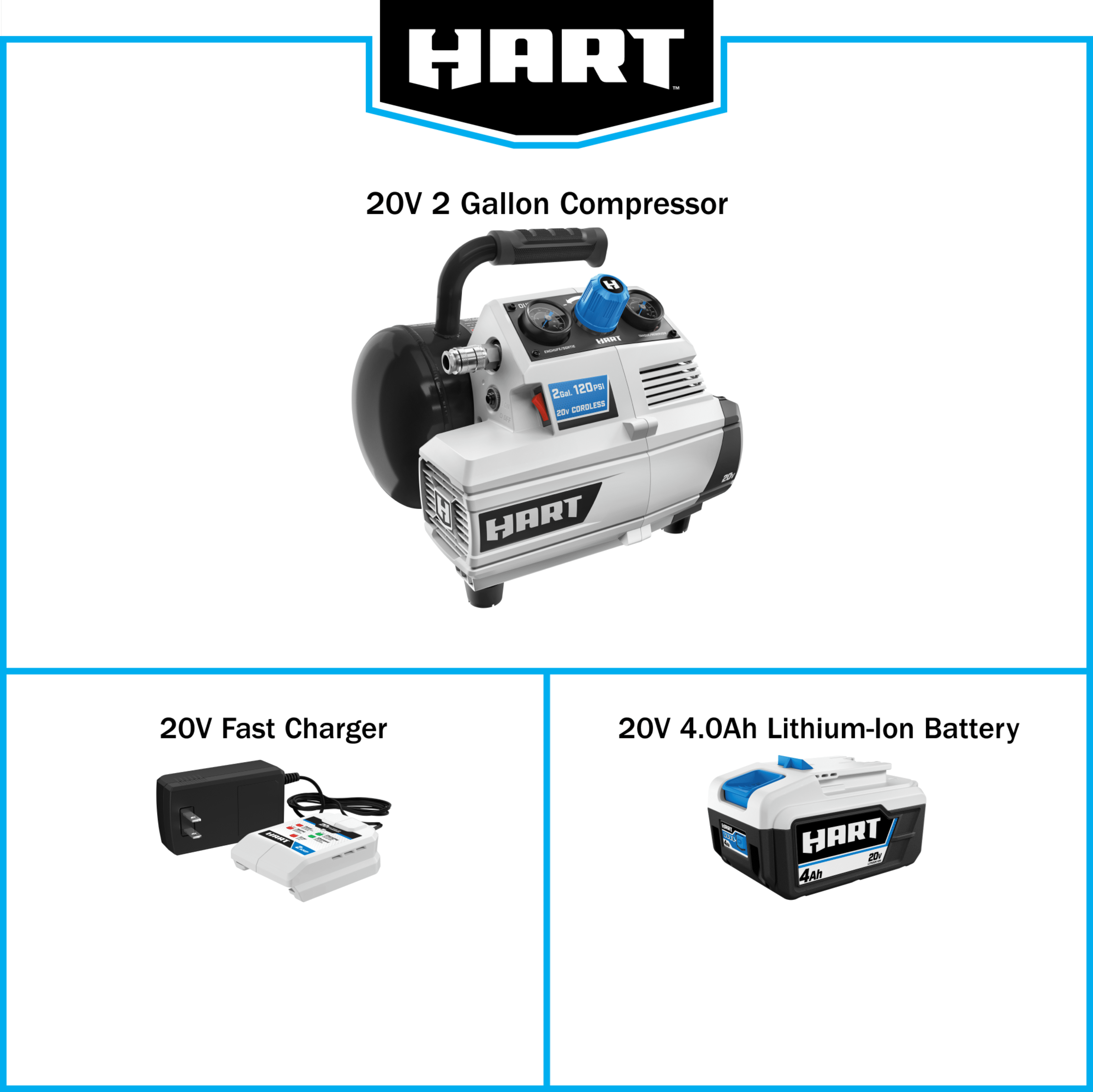 The HART 20-Volt 2-Gallon Compressor gives you the ability to work more efficiently, without the hassle of cords. Compact and convenient, this unit is ideal for topping off tires and small inflatables, anywhere you go. You can inflate a tire, from flat to full, in under 1 minute. It’s also perfect for pneumatic trim work, with cordless convenience. You’ll find the rubber over-mold handle makes transporting the compressor a lot more comfortable. It also features a universal push-to-connect quick coupler for quick and easy 1-handed use. Another convenient feature is that this pump is oil-free. That means you don’t have to worry about oil levels and all the maintenance that goes with it. The 2-gallon tank allows you to do more work with less downtime. The kit includes: (1) 20-Volt 2-Gallon Compressor, (1) 20-Volt 4.0Ah Battery, (1) 20-Volt Fast Charger, and (1) operator’s manual. This tool works with all HART 20-Volt batteries, and the HART 20-Volt battery in this kit powers all HART 20-Volt tools, outdoor equipment, automotive, and lifestyle items!