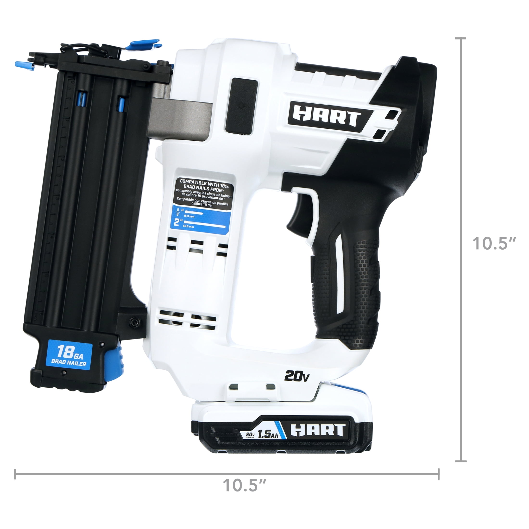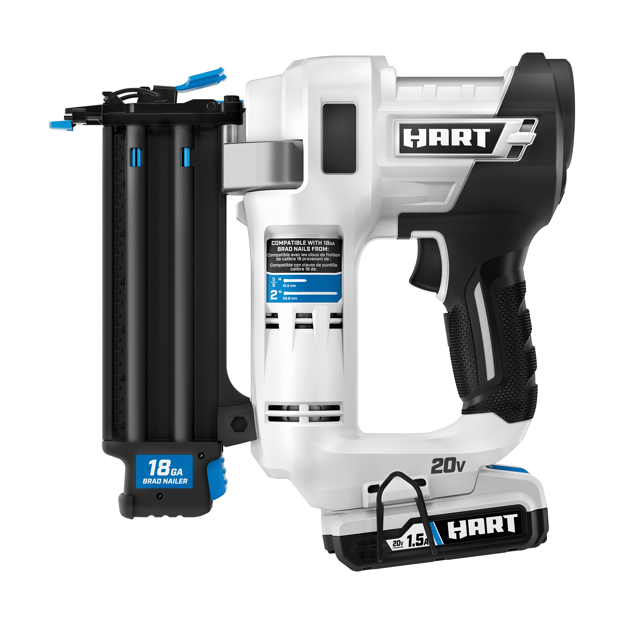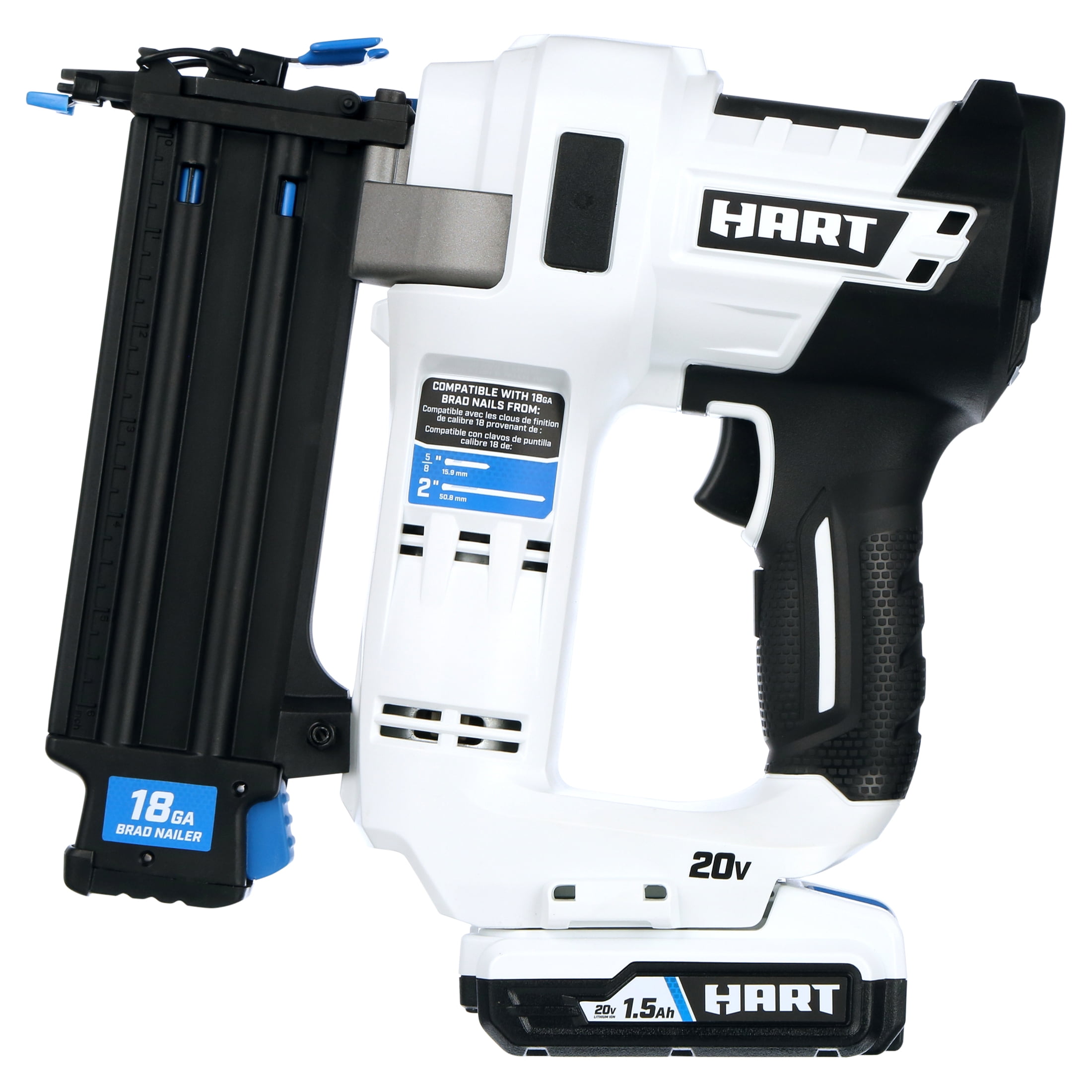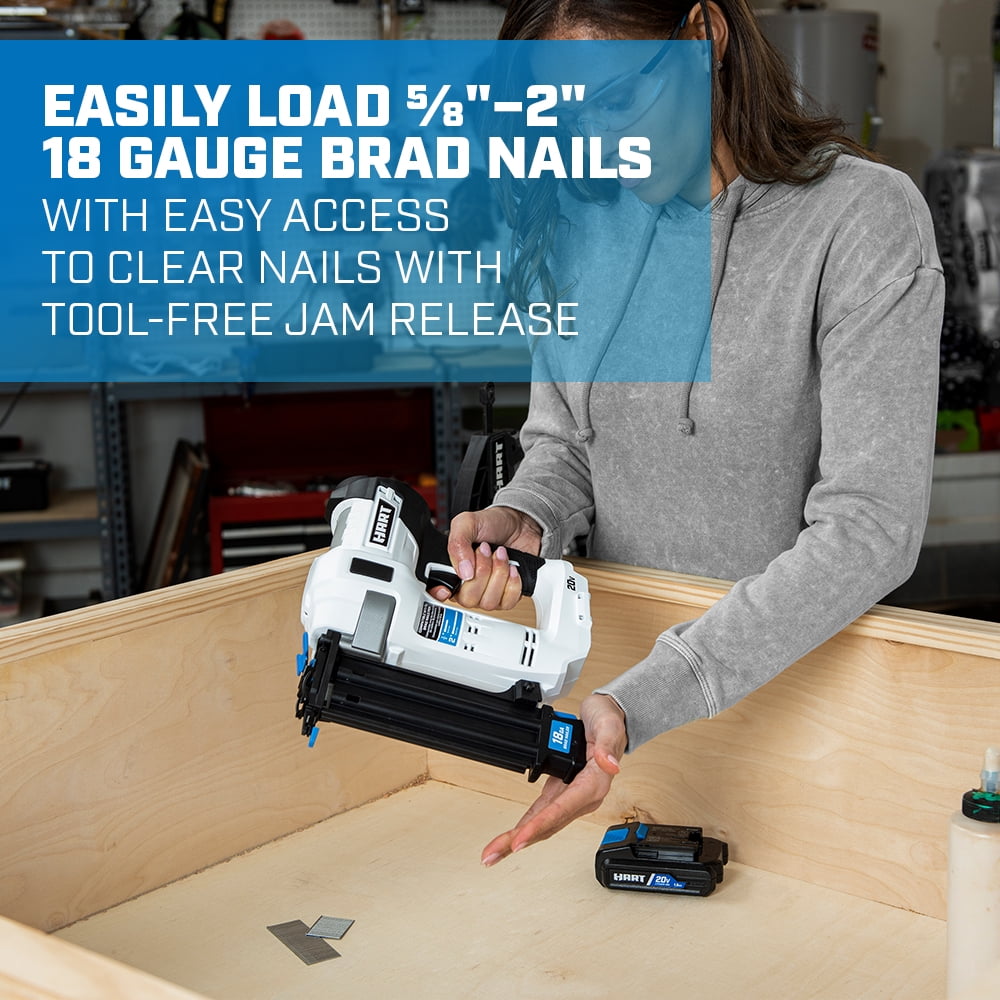 The HART 20V 18-Gauge 2″ Brad Nailer Kit easily drives over 600 nails per charge (with 1.5Ah battery). Easy access to clear nails with tool-less jam release Protect the work surface and allow for proper setting of nail heads with tool-free depth-of-drive adjustment Air compressor-like power without all the hassle