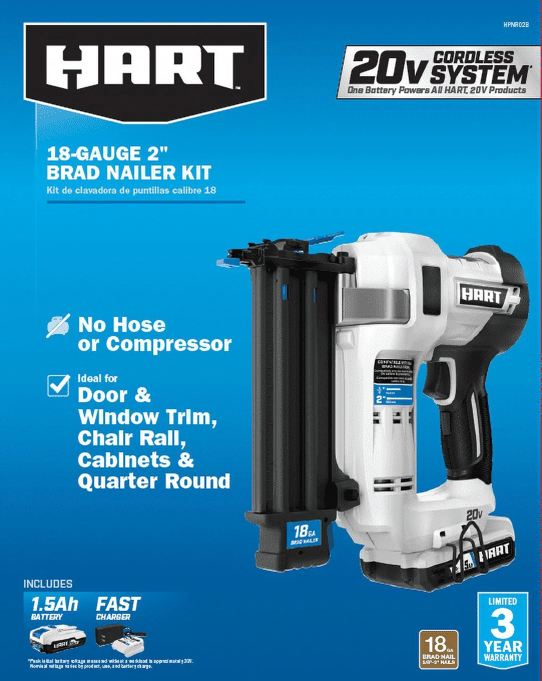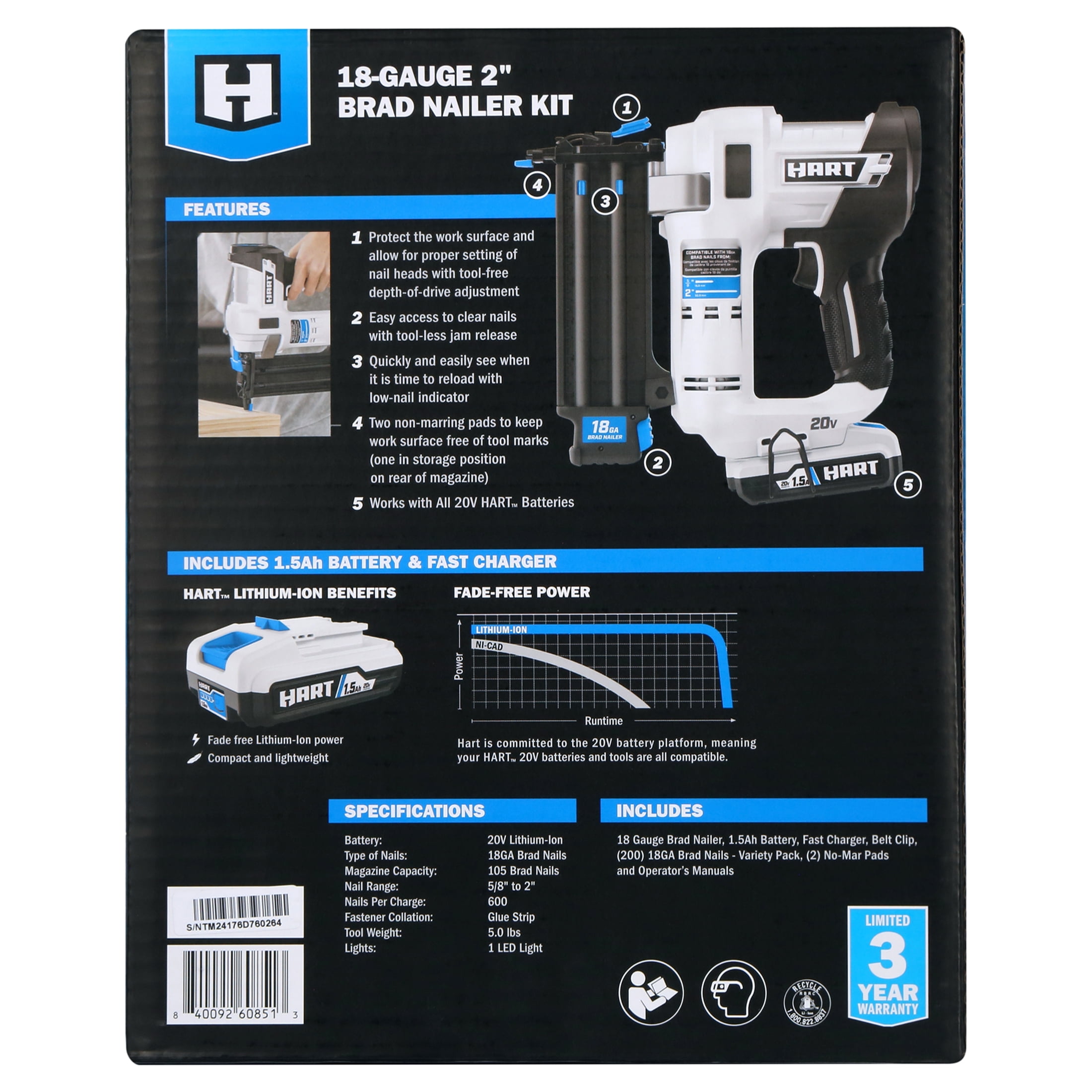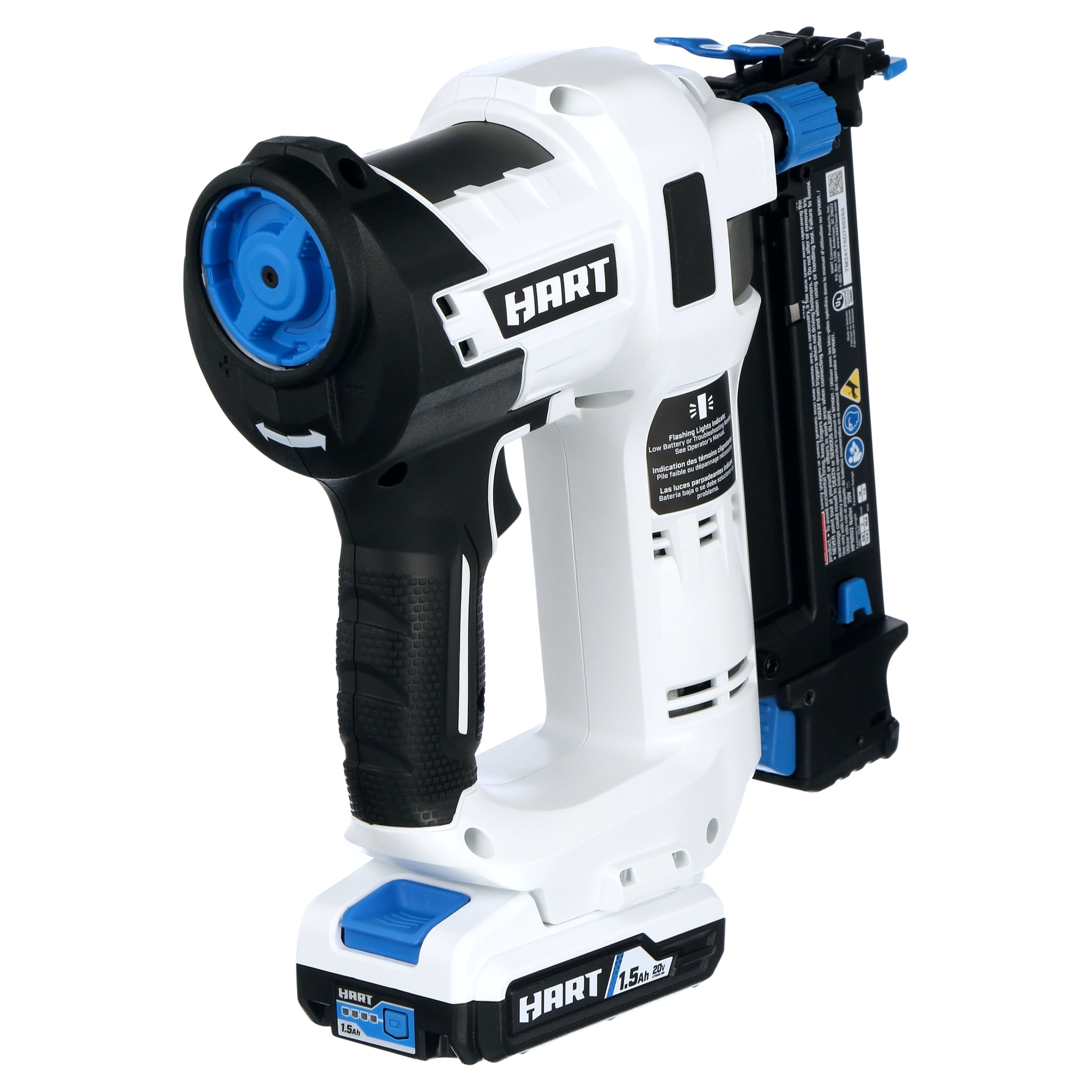 The HART 20V 18-Gauge 2″ Brad Nailer Kit easily drives over 600 nails per charge (with 1.5Ah battery). Easy access to clear nails with tool-less jam release Protect the work surface and allow for proper setting of nail heads with tool-free depth-of-drive adjustment Air compressor-like power without all the hassle