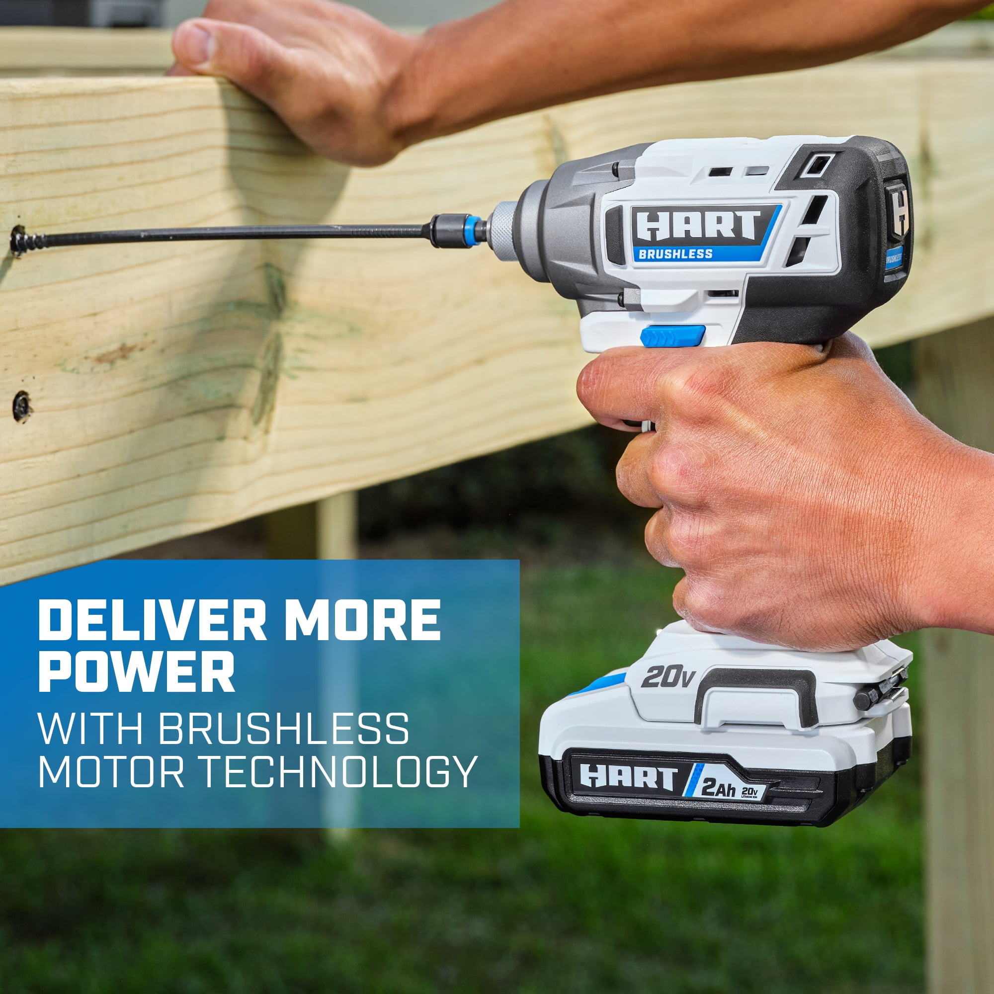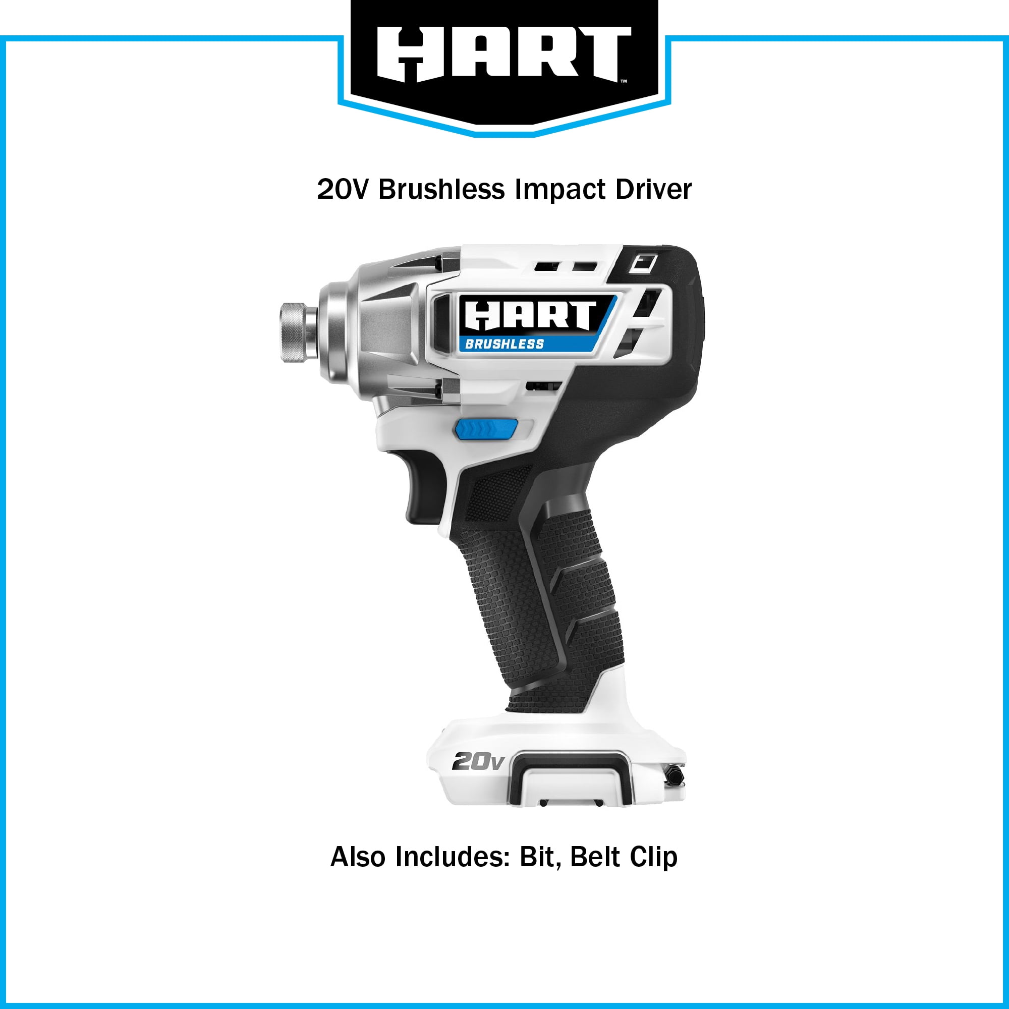 The NEW HART 20V Brushless Impact Driver can drive over 500 screws per charge! Powerful brushless motor with 2,200 in-lbs. torque and lightning-fast 3,900 IPM speed for maximum performance Effortlessly swap bits with the lightning-fast ¼” quick-connect collet and convenient one-handed bit release. Enhanced visibility with integrated LED light Works with all HART 20V batteries Hex shank chuck