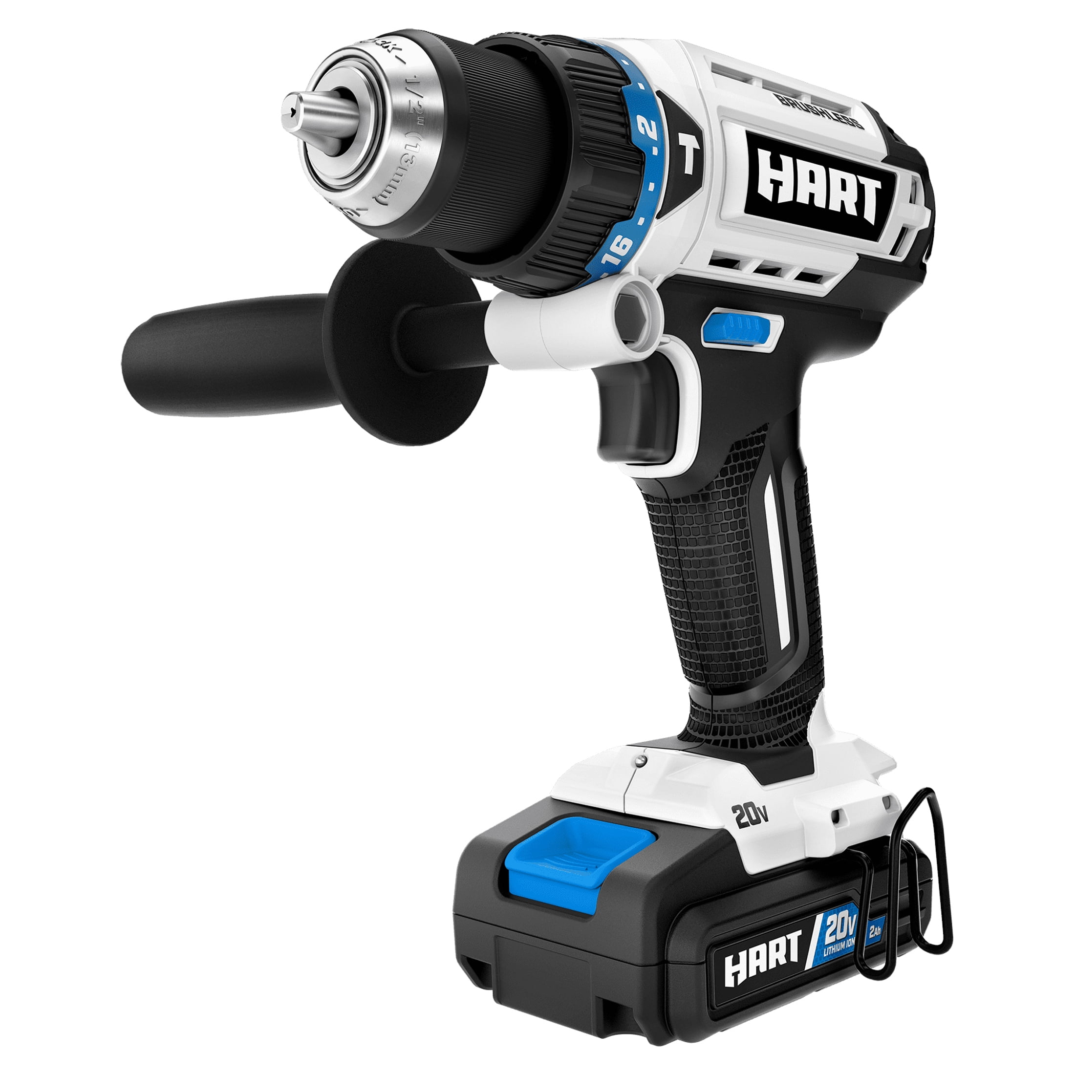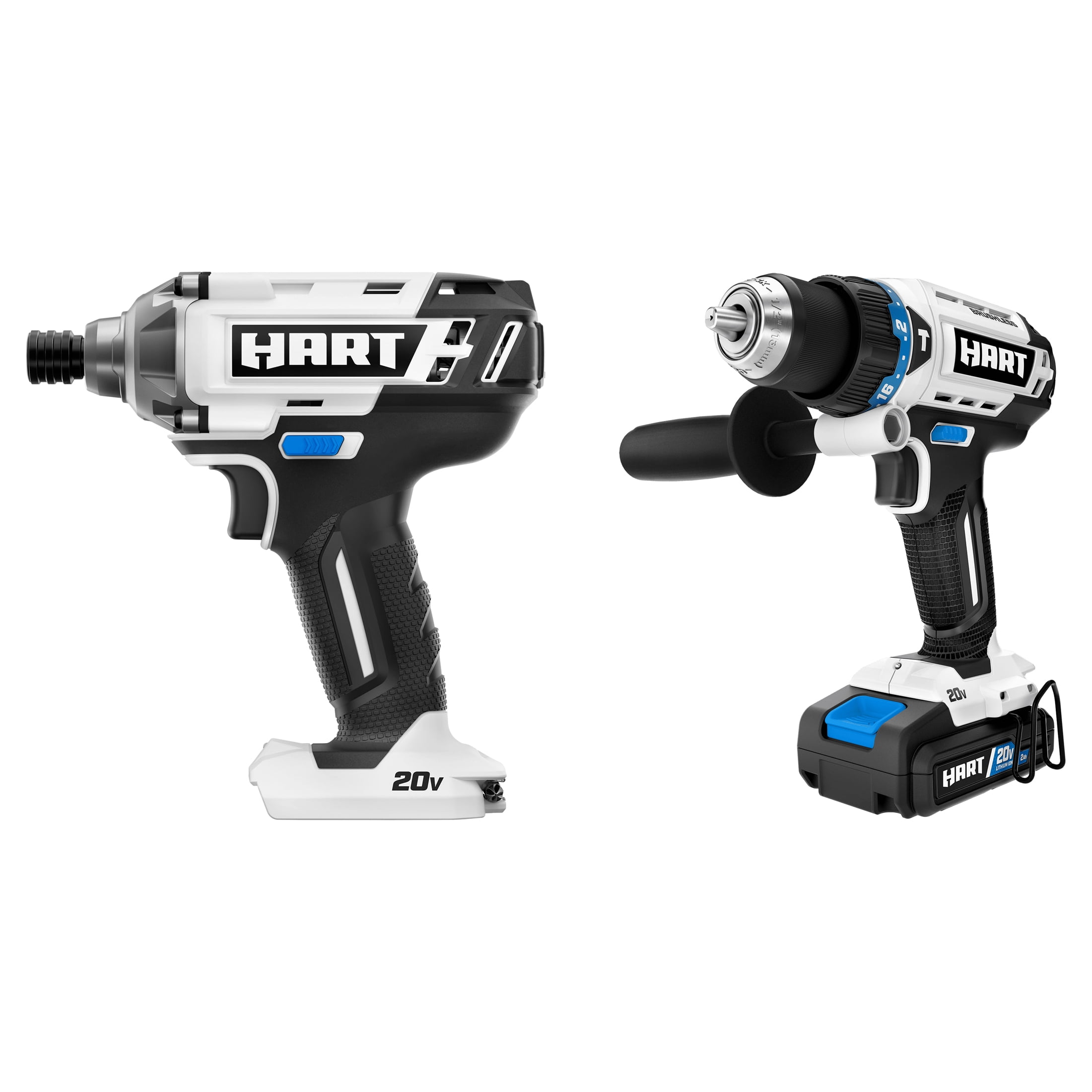Bundle includes Brushless Impact Driver and Hammer Drill Brushless Impact Driver provides up to 3000 RPM for strength and controlled drilling and driving Includes a 1/4-inch hex chuck for fast and easy bit changes, an LED work light and a belt clip Hammer Drill features a powerful motor delivering up to 31,000 BPM Included auxiliary handle ensures you always have a secure grip during high-torque applications 24-position clutch puts more control in your hands The 20V one battery system allows you to interchange the battery on all 20V HART products