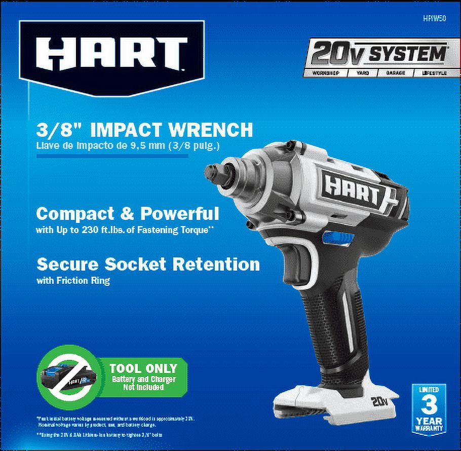 The NEW HART 20-Volt 3/8-inch Impact Wrench is a must-have tool for any DIY mechanic’s garage. With its powerful motor, it delivers up to 230 ft-lbs. of torque (**Using the 4.0Ah Lithium-Ion battery to tighten 3/4″) for effortless fastening and loosening of nuts and bolts. The friction ring allows for quick and easy changes of sockets while ensuring a secure grip. Plus, the integrated LED work light provides enhanced visibility in dark and hard-to-see areas. What’s more, this Impact Wrench is compatible with the same 20V Lithium-Ion Battery (Battery Not Included) used by other tools in HART’s 20V lineup, making it convenient and cost-effective to expand your tool collection without purchasing additional batteries and chargers. Add this tool to your arsenal today, and do it with HART!