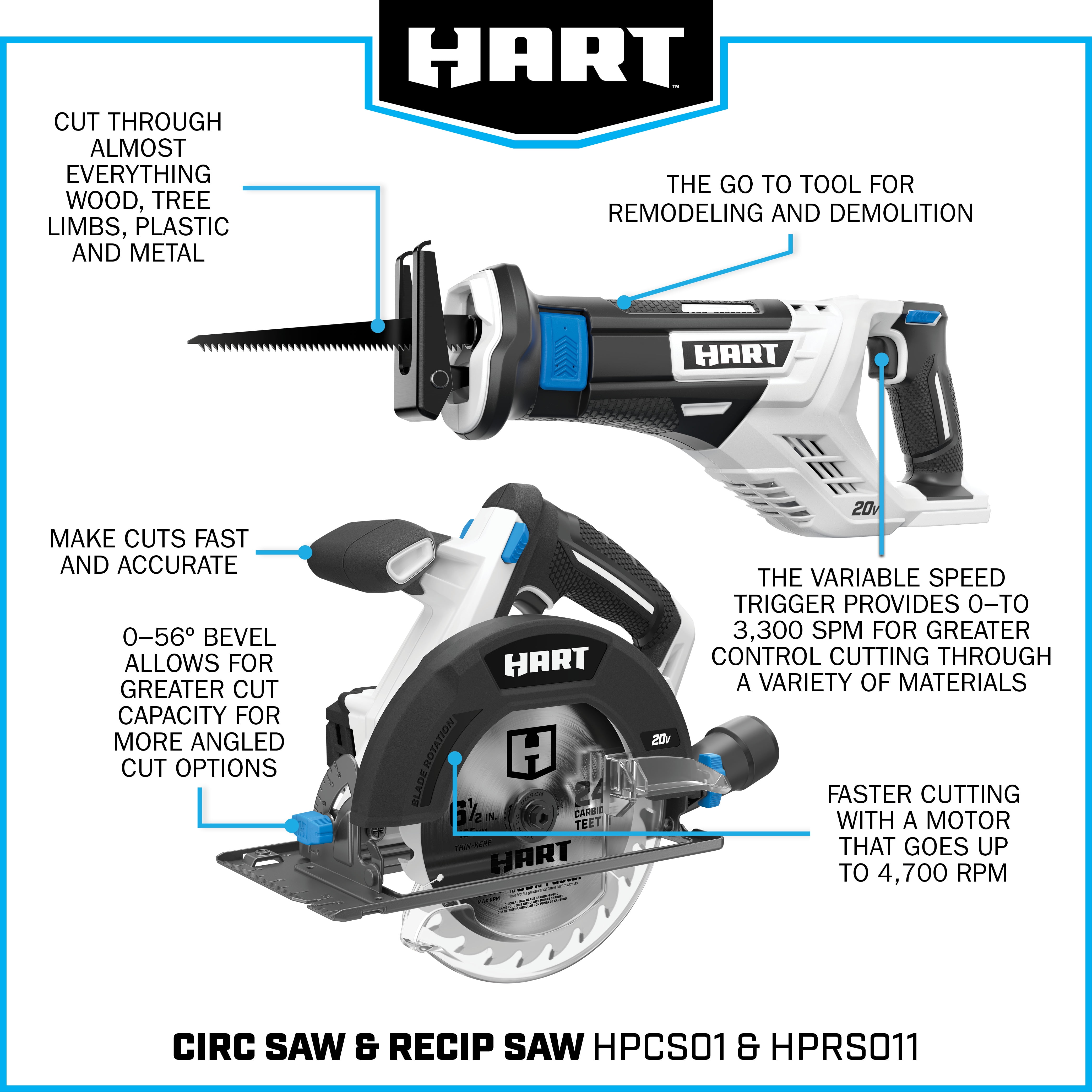 The NEW HART 6-Tool Combo Kit comes with a variety of tools, allowing for broader project coverage possibilities in one kit. Make the most demanding cuts easier with the included 6-1/2″ Circular Saw that features a powerful motor delivering 4,700 RPM. Fasten screws with ultimate power with the included Impact Driver’s range of up to 1,700 in/lbs. of torque. Get through a multitude of materials with this kit’s included 1/2″ Drill/Driver that delivers power at up to 1,600 RPM. Effortlessly removes material at a top speed of 10,000 RPM with the Random Orbit Sander. Work with all 20V Lithium-Ion Batteries Includes: (1) 20V 1/2″ Drill/Driver, (1) 20V Impact Driver, (1) 20V Reciprocating Saw, (1) 20V 6-1/2″Circular Saw, (1) 20V Random Orbit Sander, (1) 20V LED Light, (1) 20V 4.0Ah Lithium-Ion Battery, (1) 20V 1.5Ah Lithium-Ion Battery, 20V Fast Charger, (1) Storage Bag, and (1) Operator’s Manual