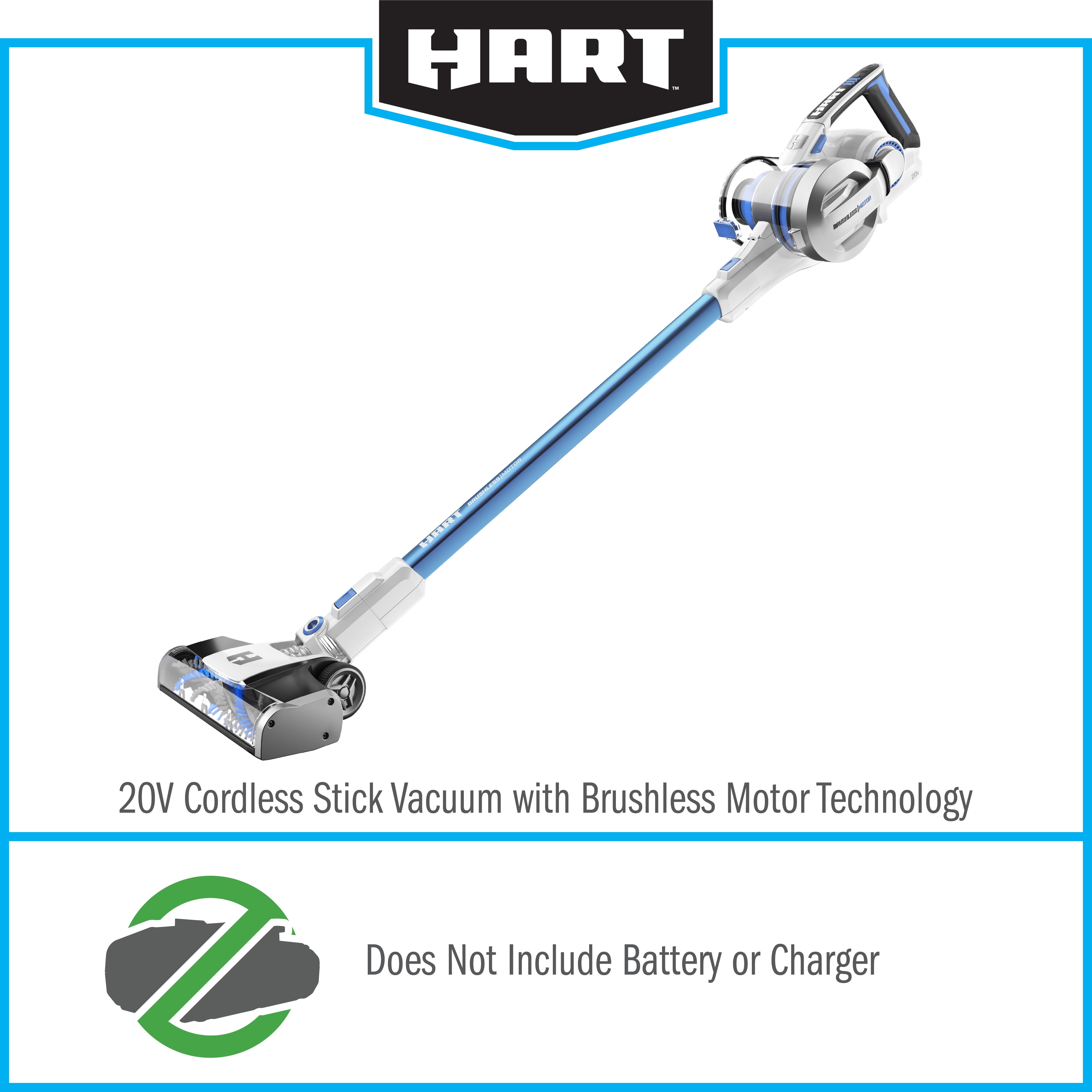 Brushless motor technology for superior power and runtime Cordless Stick Vac works on all surfaces from floor to ceiling Removable handheld vacuum offers easy above-floor cleaning 2-mode setting for a variety of new cleaning applications Integrated LED lights for hard-to-see debris Filter traps over 99.9% of dust and allergen matter with no suction loss Large dust cup for easy debris disposal 2-in-1 storage option Works with all HART 20V Batteries Limited 3-year warranty