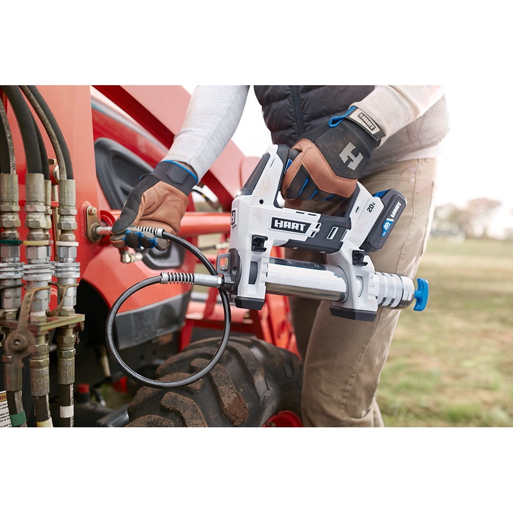 The HART 20V Cordless Grease Gun is the perfect tool for maintaining any heavy machinery requiring regular lubrication. You can quickly and efficiently finish with your regular maintenance and get back to work. This grease gun features a 30” flexible hose to provide easy access to any grease fitting and features an LED light for those fitting in hard-to-reach spaces that may be in the dark. The steel tube ensures maximum durability and longevity of the tool. This grease gun works with 13.7-14.5 grease cartridges or bulk filling for multiple grease methods. The HART 20V Cordless Grease Gun operates on the HART 20V battery system allowing you to use the same battery across the entire 20V line-up of HART tools. This grease gun is sold as “Tool Only” meaning there is no battery included so you can purchase the tools you need without purchasing more batteries and chargers than you need.