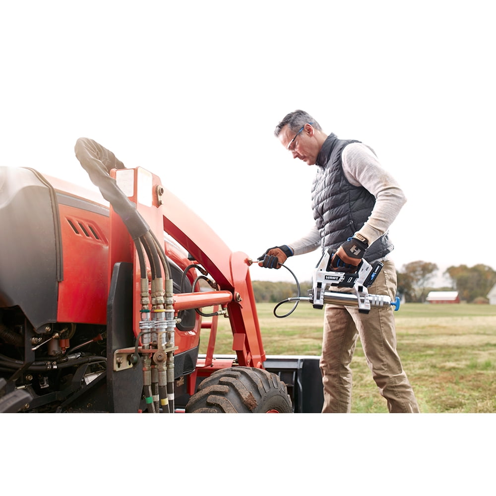 Maximum pressure of us to 10,000 PSI Increased efficiency with 7.5 oz./min flow rate 30” flexible hose and LED light Works with all HART 20V batteries