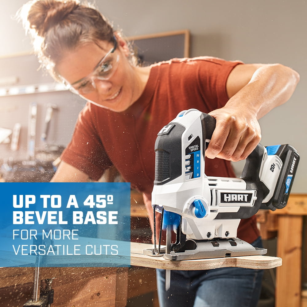Precision cutting jigsaw with variable speed up to 3,000 SPM The cordless saw cuts a variety of materials with 4 orbital settings Up to 45° bevel base allows for more versatile cuts Easy release blade collar makes for quick and easy blade changes Lock on switch allows for continuous uninterrupted cutting LED light increased cut accuracy by illuminating cut line Battery powered. This electric jigsaw is powered by HART’s 20V battery system