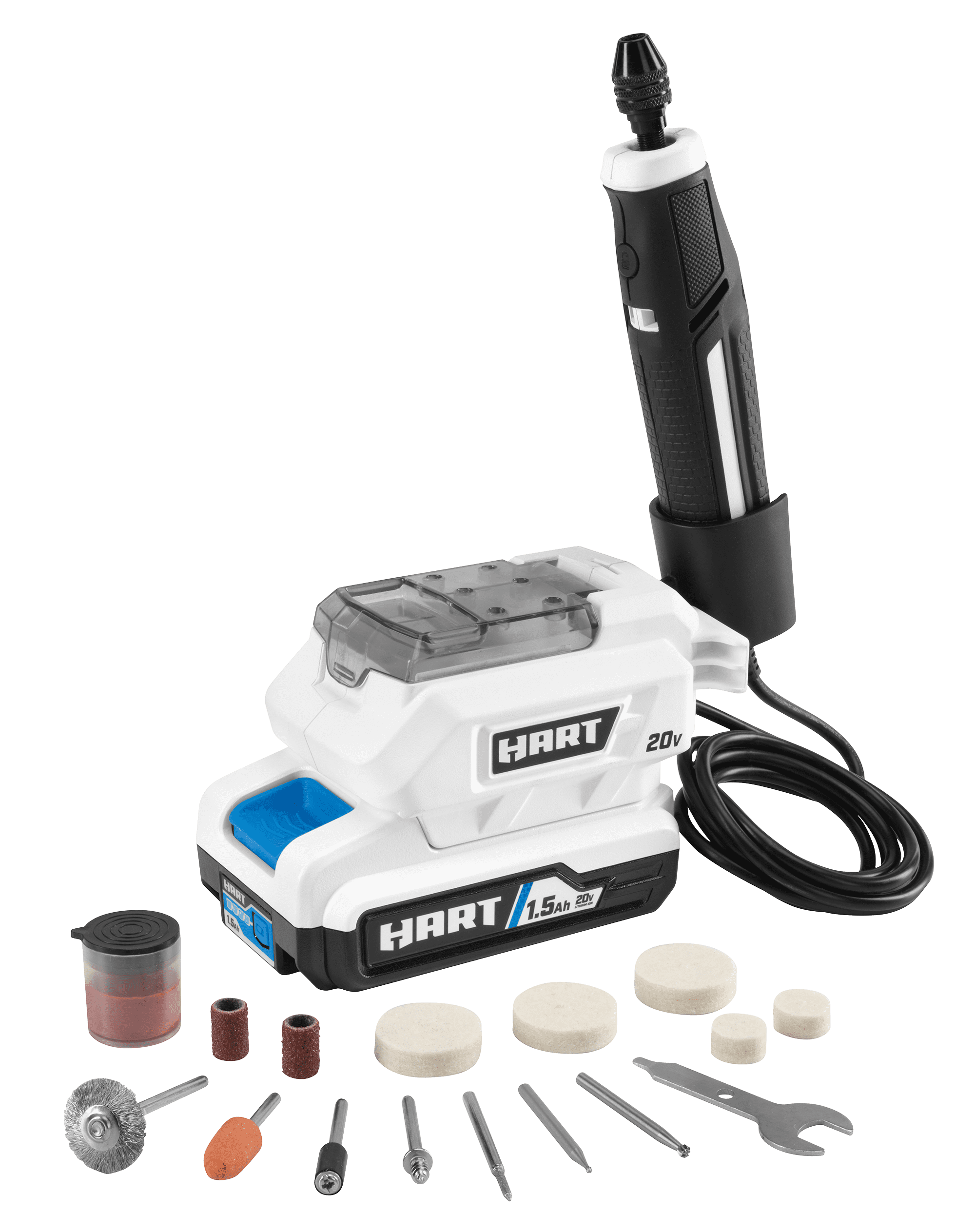 Looking to take your crafts, woodworking, carving and other DIY projects to the next level? Look no further than the HART 20V Precision Craft Rotary Tool Kit! Featuring an impressive variable speed of 5,000-23,000 RPM and 15 accessories included with on-board storage, this precision craft rotary tool is ideal for precise carving, polishing and sanding. The tool-free bit changing system with keyless chuck design makes switching accessories a breeze, while onboard bit storage provides you easy access to accessories when in use. With integrated cord management and the ability to work with all HART™ 20V batteries (1.5Ah battery included), it’s never been easier to tackle all your creative projects. Get ready to take your crafting skills up a notch with the HART 20V Precision Craft Rotary Tool Kit!