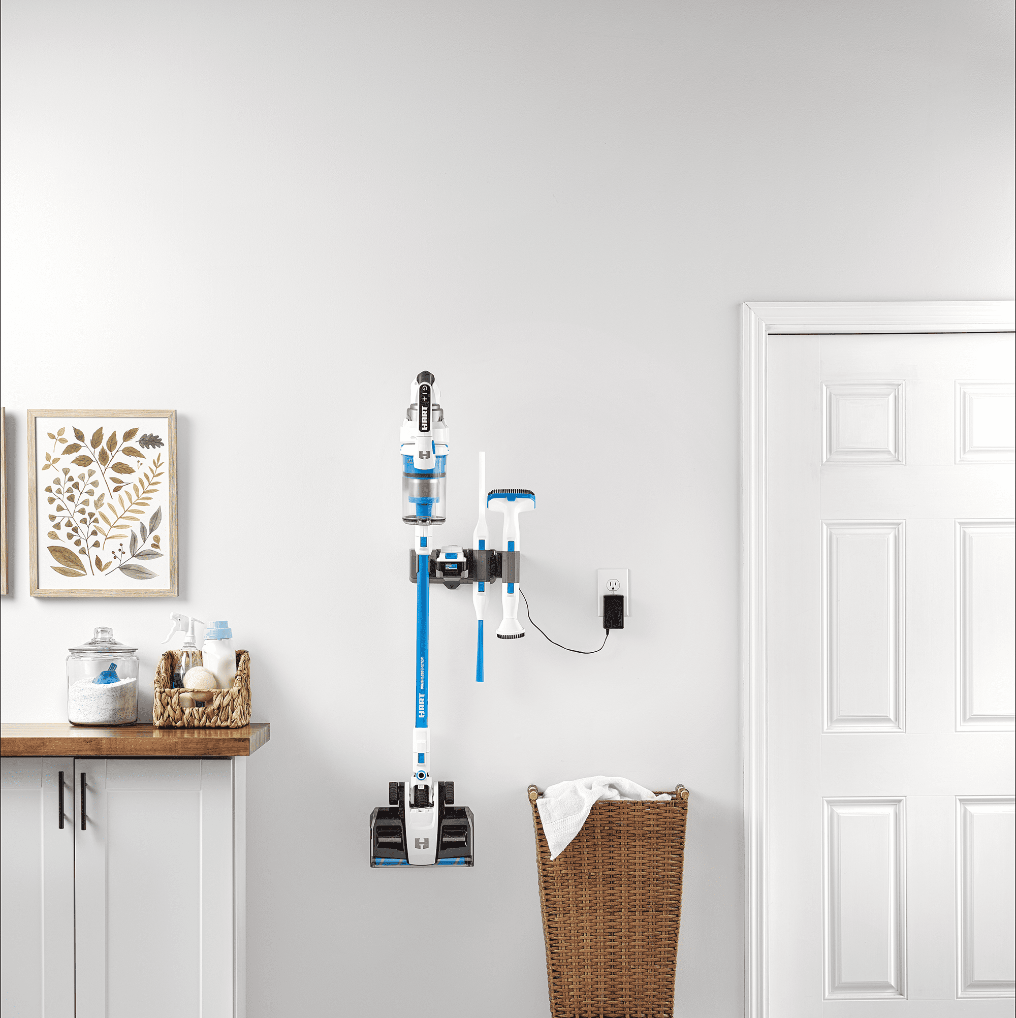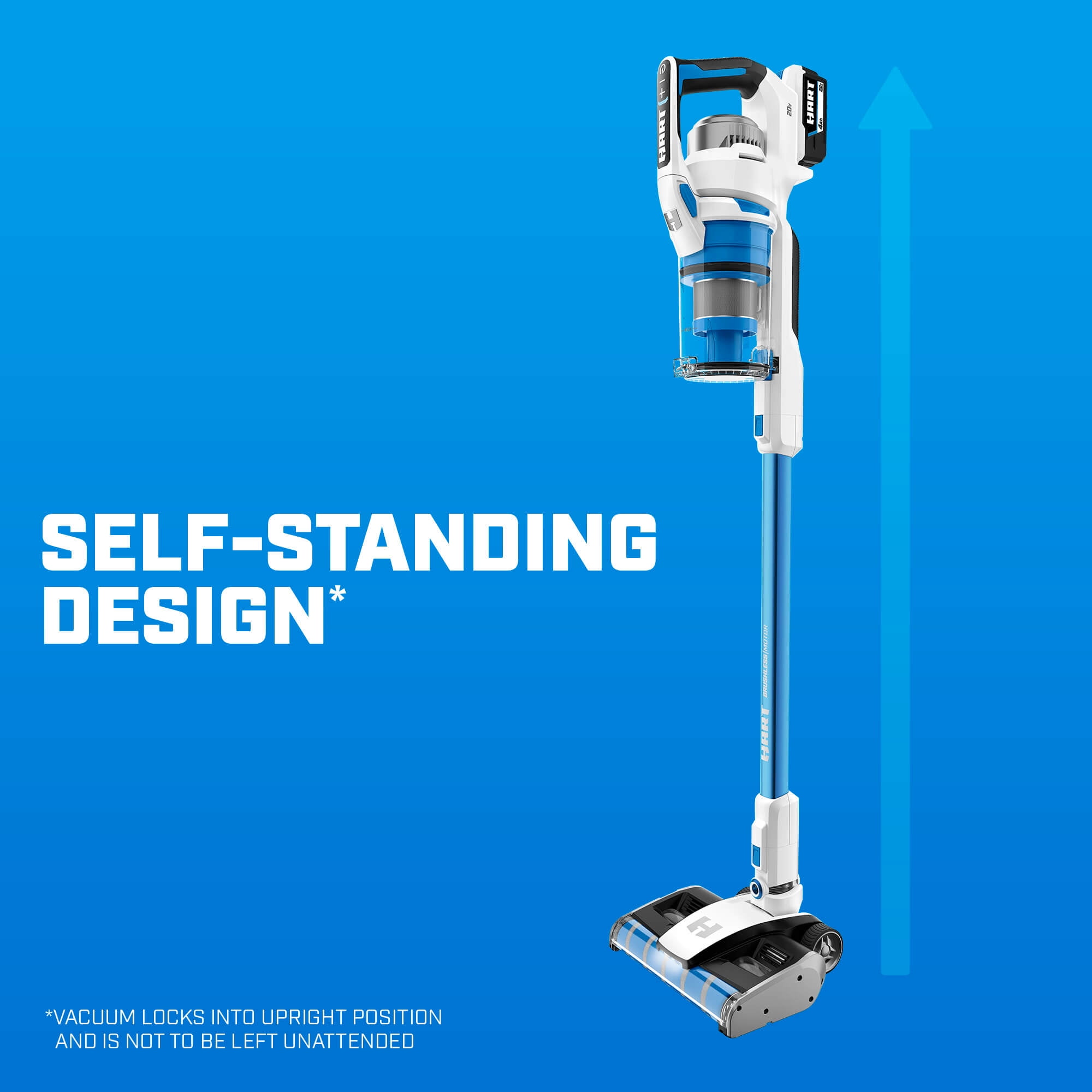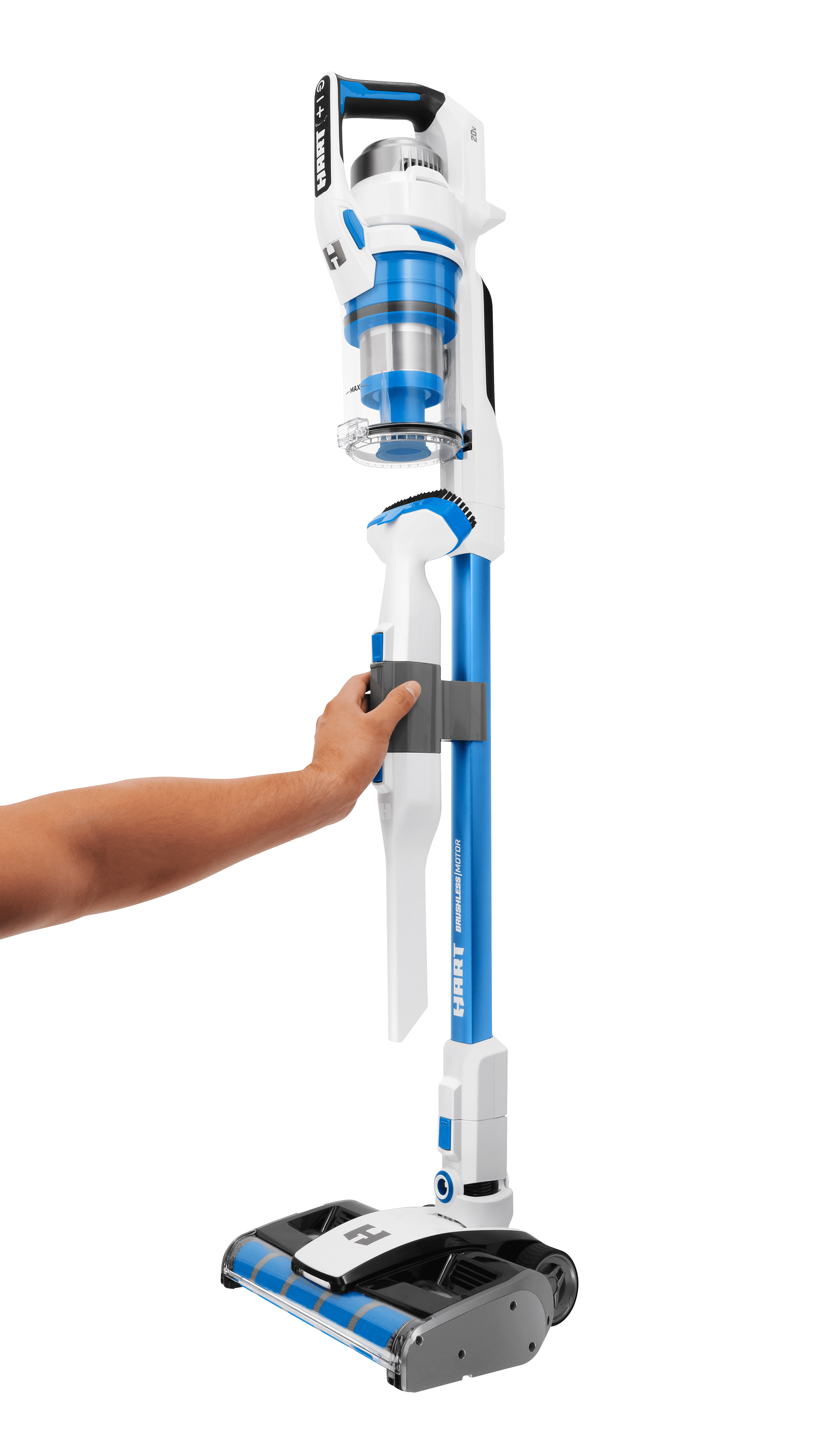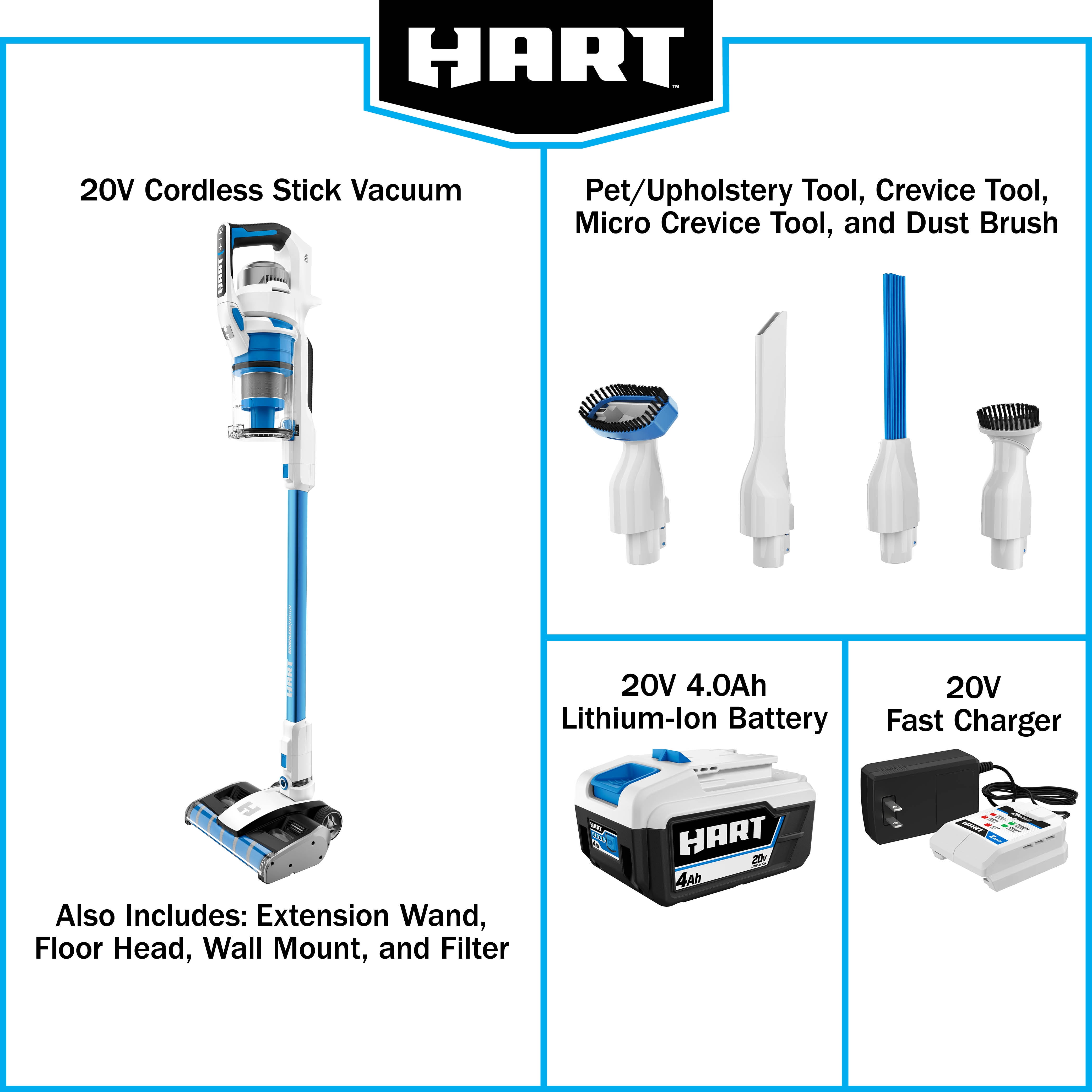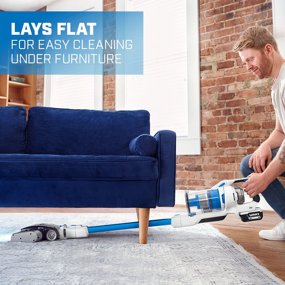 HART 20- Volt Vertical Bin Dual Brush Roll Stick Vacuum with Brushless Motor Technology for all Floor Types with (1) 4.0Ah Lithium-ion Battery included. The plush microfiber brush roll tackles large debris and fine dust whereas the rear bristle brush roll lifts embedded messes. Still offering 45 min. of runtime, this cordless stick vacuum has the power to clean carpets, area rugs, and hard floor surfaces in up to 16 rooms with the included HART 20V 4.0Ah Lithium-Ion Battery. Clean the messes in your car, on your stairs, or other above-floor surfaces by easily converting into a hand vacuum with the included crevice, dust brush, and micro crevice tool accessories. The wider floor head design makes cleaning quicker and easier while sucking up larger debris, like dry cereal messes. The floor head includes integrated LED lights that help you see what you might otherwise miss, and aggressive nylon bristles with antimicrobial protection that lift embedded dirt. The tool-free roller bar release offers effortless maintenance for hair removal. Vacuuming on delicate area rugs? The unit starts in middle-suction mode which is great for everyday messes. Press +/- buttons to increase or decrease suction power. In addition to a large, easy-to-empty, easy-to-remove dust cup, the washable filter traps over 99.9% of dust and allergen matter. Keep your vacuum and accessories clutter-free with the included wall mount and battery dock that also provides a space to conveniently charge the battery after use. This vacuum also has a free-standing design allowing the vacuum to lock in place upright.