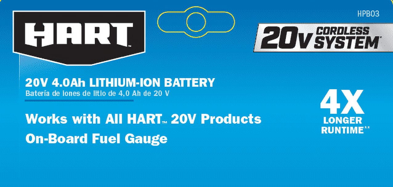 The 20V one battery system allows you to interchange the battery on all 20V HART products. It powers all HART 20V tools, outdoor, automotive and lifestyle items 4X Longer Runtime* On-Board Fuel Gauge Battery chart that is on the back of packaging Works with All HART 20V Tools Fade free Lithium-Ion power Includes: 4.0Ah 20V Lithium-Ion Battery Disclaimer: *Compared to a 1.5Ah HART Lithium-Ion Battery tested on a HART Hammer Drill Specs: Battery: 20V Lithium-Ion