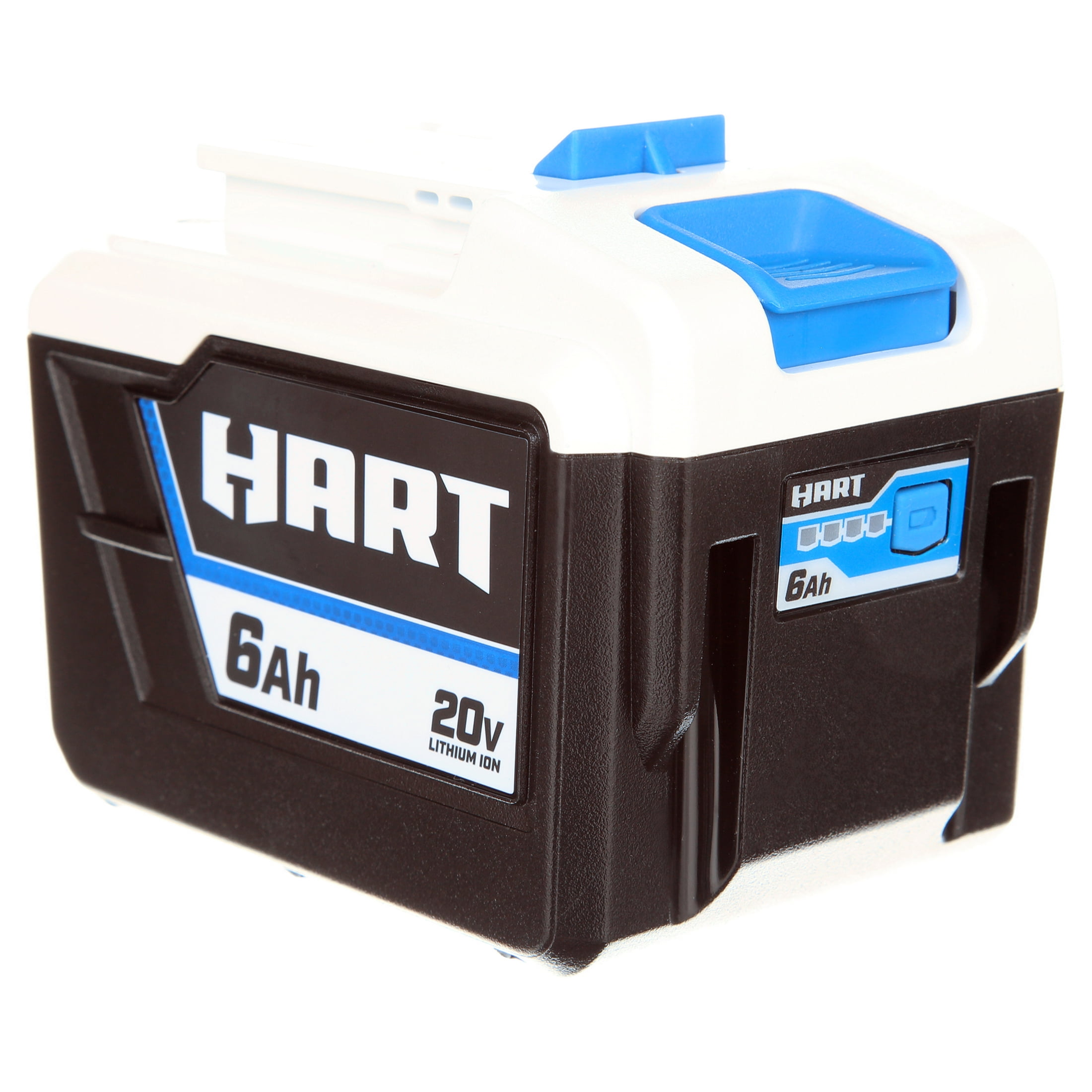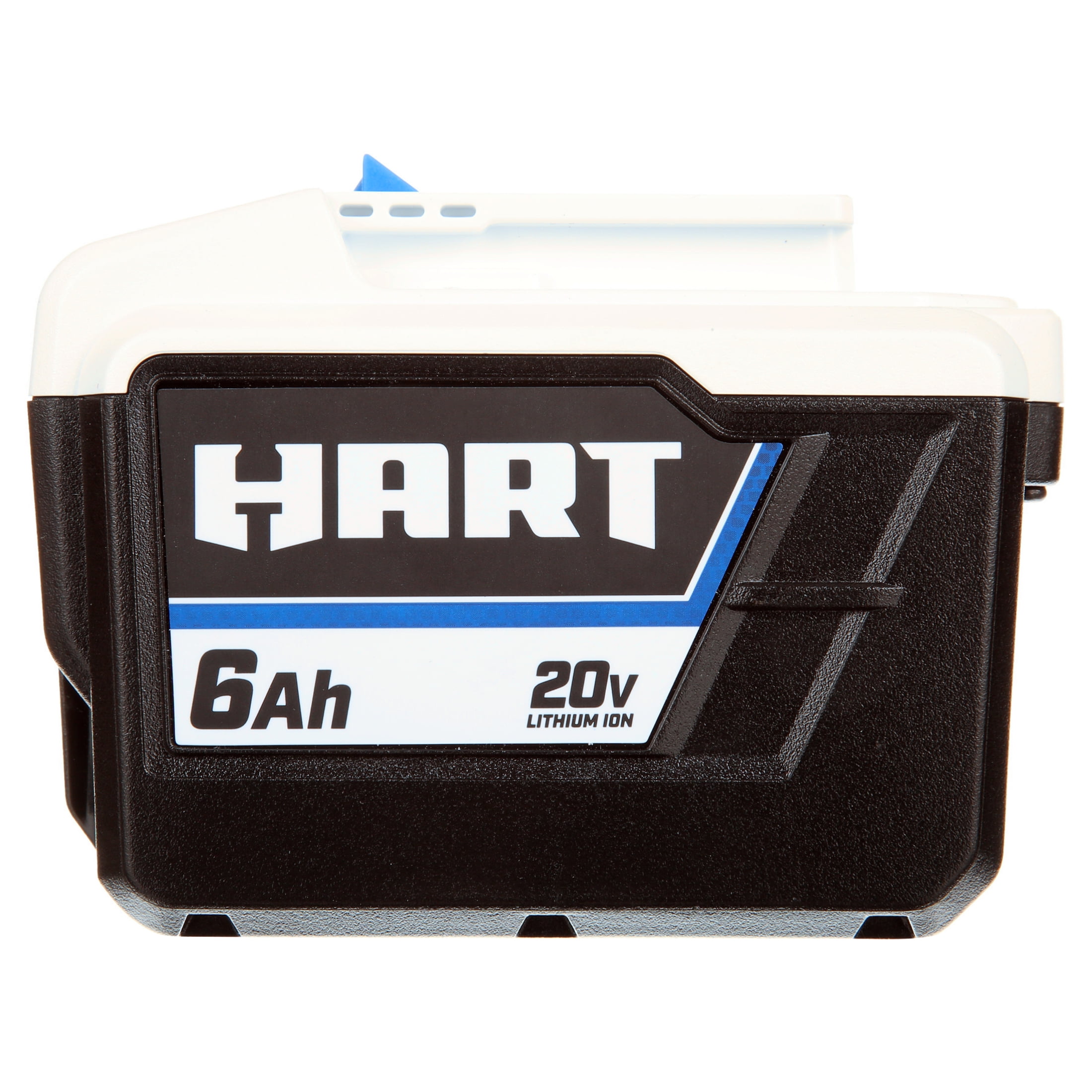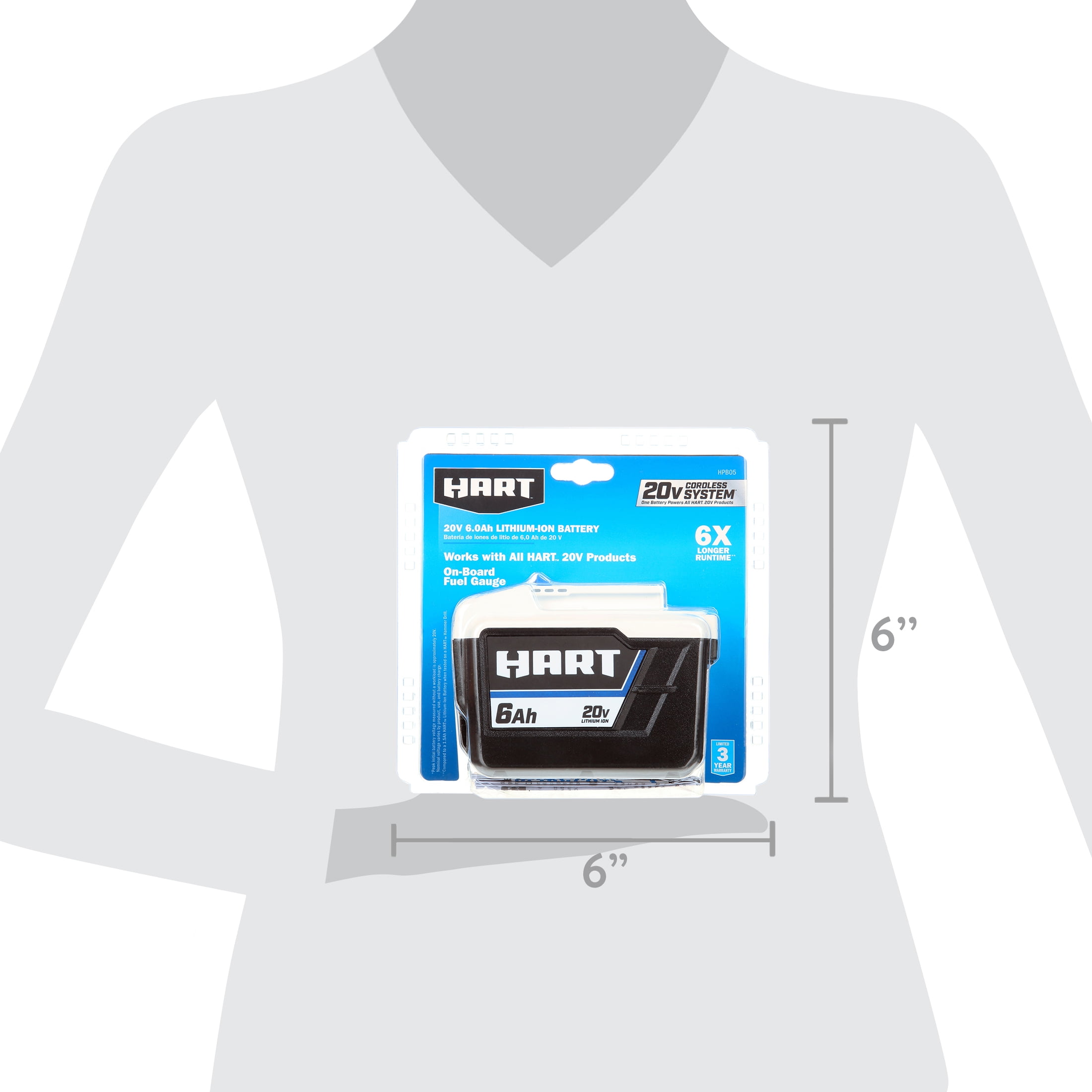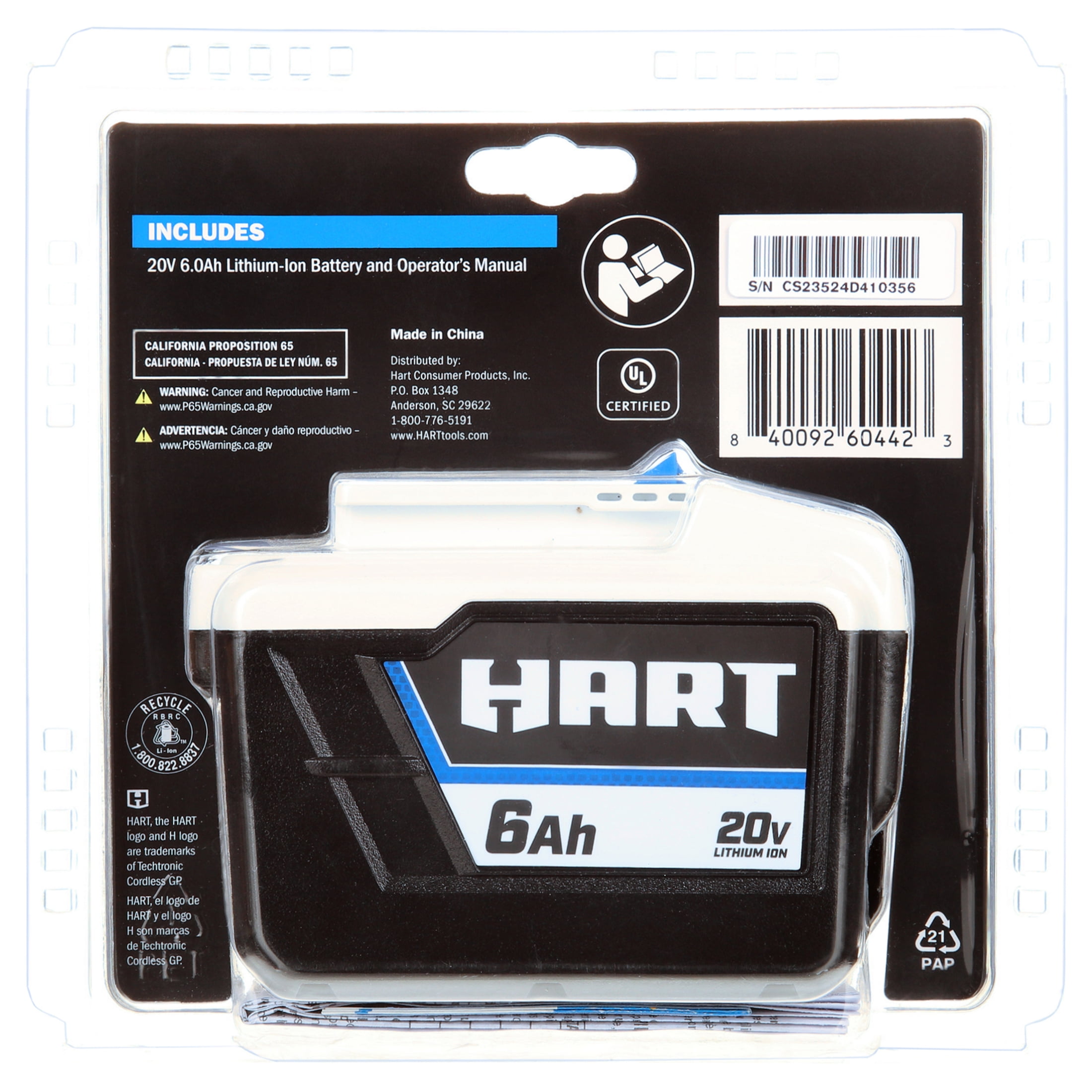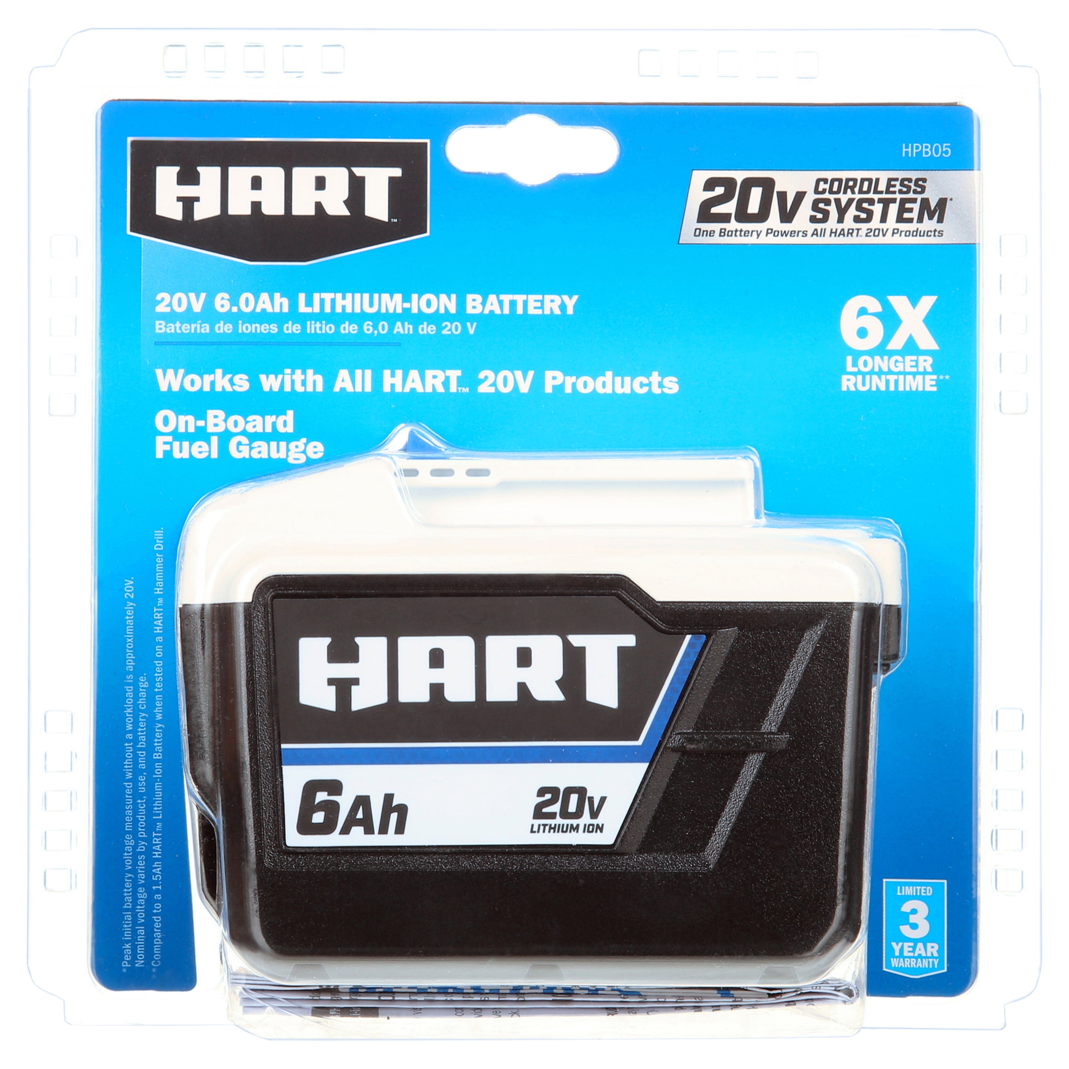 Tackle extended and larger projects with a remarkable 6X longer runtime** Fade-free lithium-ion power for consistent, long-lasting performance. Enhance efficiency and measure your charge with the on-board fuel gauge Powers All HART 20V Tools The NEW HART 6.0Ah Lithium-Ion Battery (HPB05) comes with (1) 20V 6.0Ah Lithium-Ion Battery and (1) Operator’s Manual.