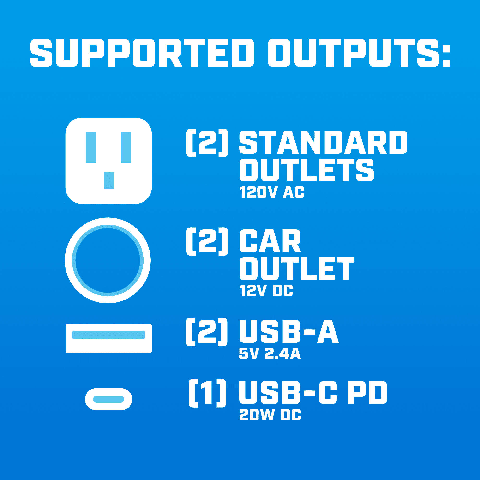 Continuous Output: Power Sources: On-Board Task Light: Enhanced Portability: Battery Compatibility: Running Watts: AC Output: DC Output: Includes:
