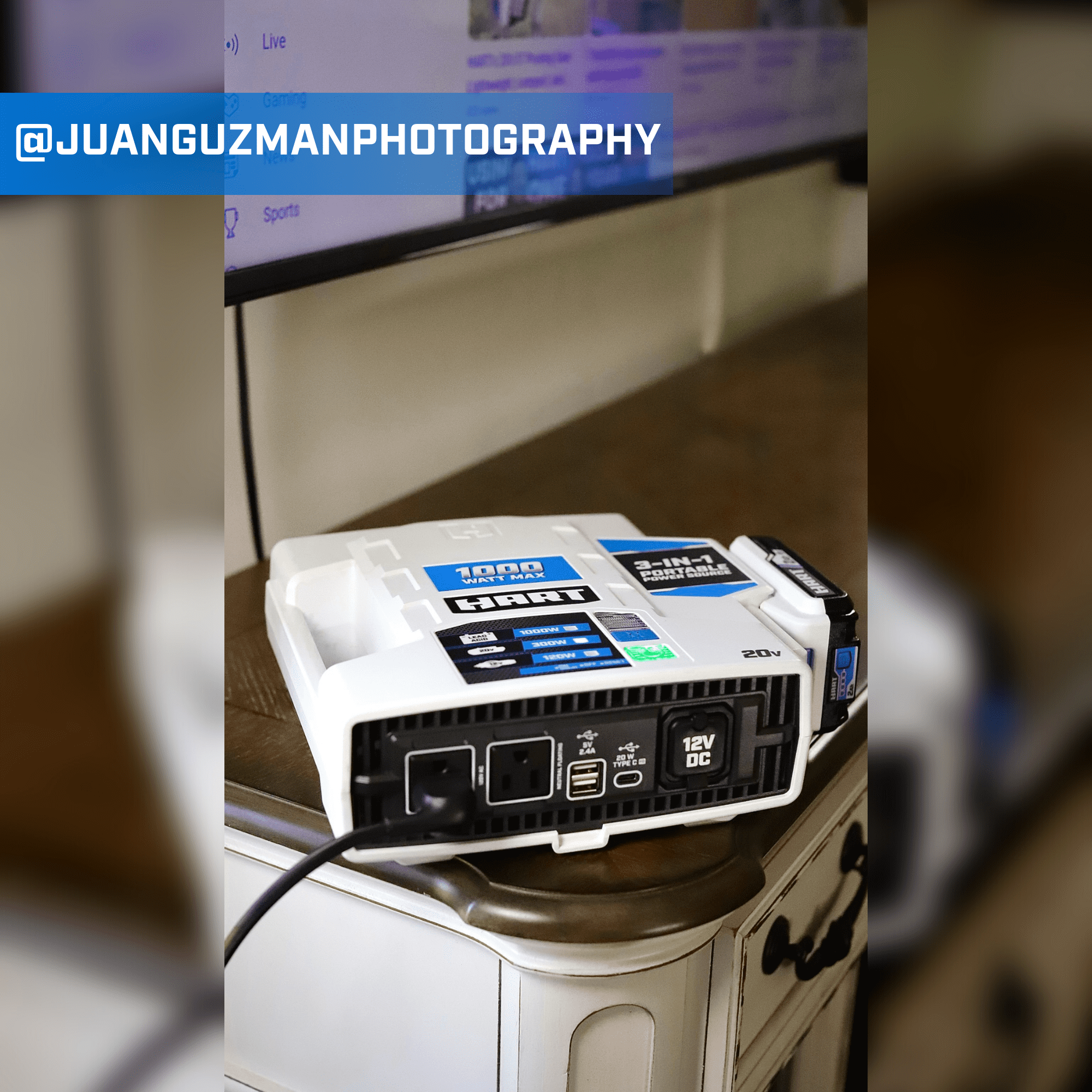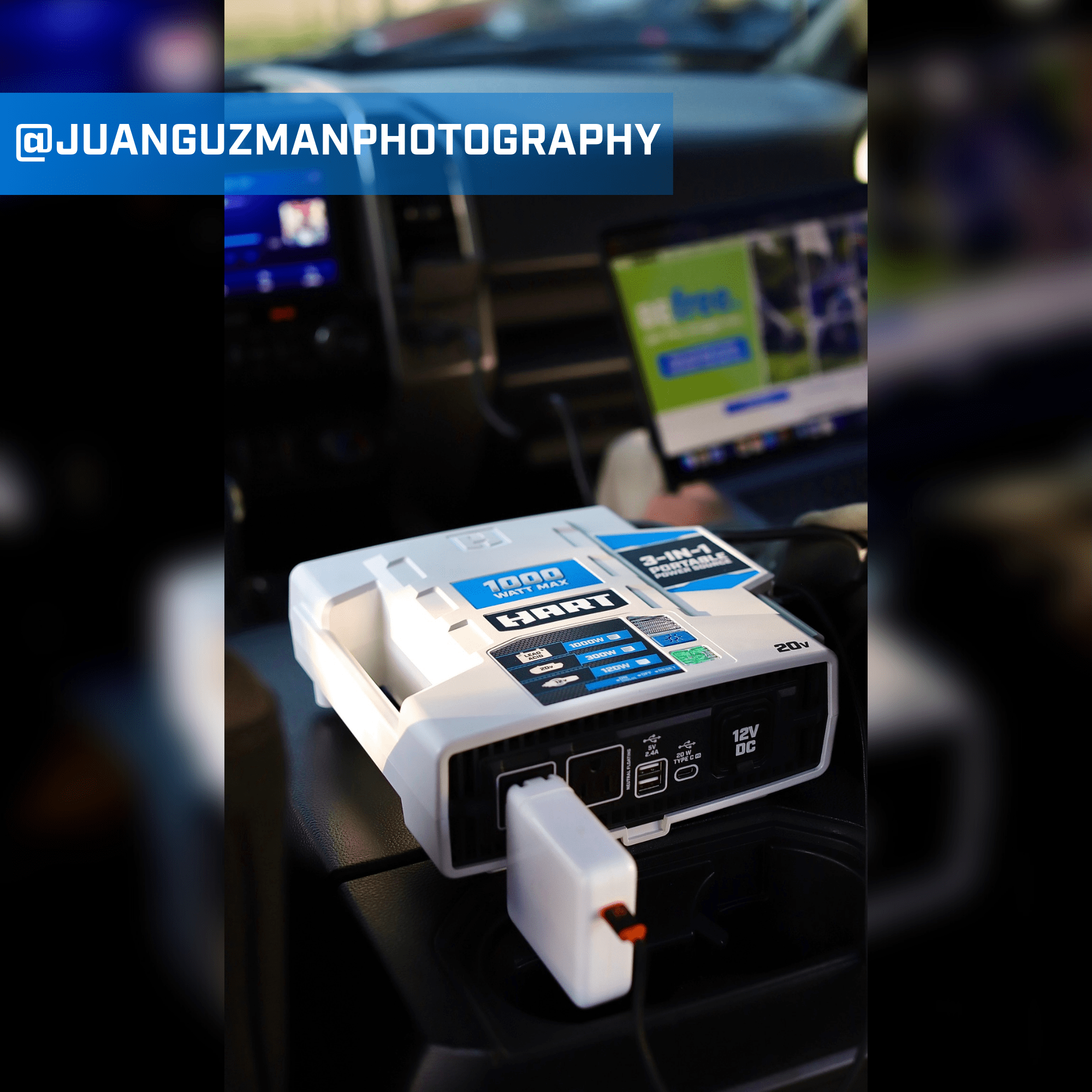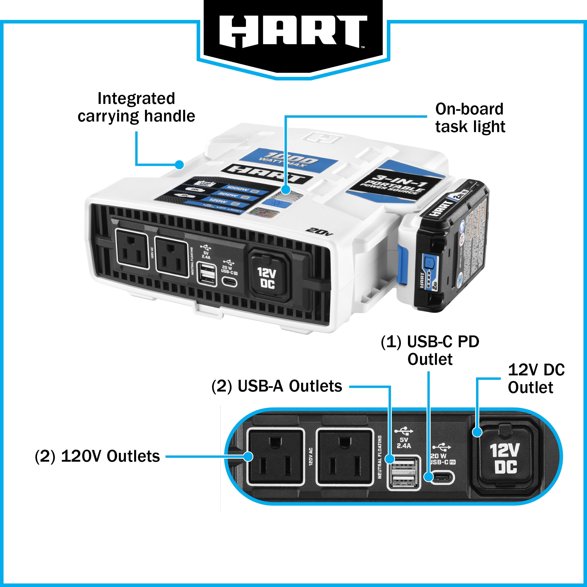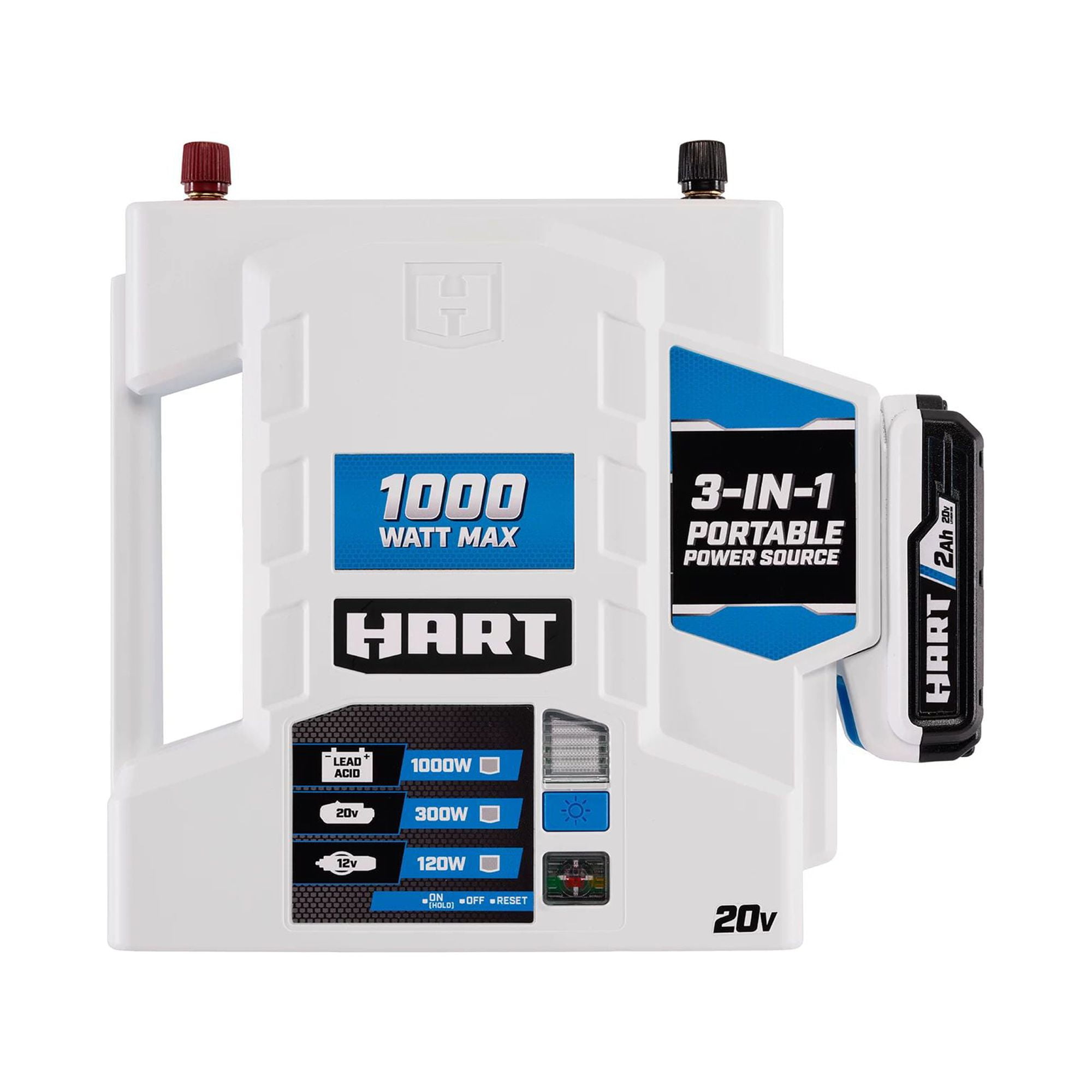 Introducing the all-new HART 1000W 3-in-1 Power Source/Inverter! You’ll never have to worry about running out of power again -whether you’re on the go or taking it easy at home. This groundbreaking product is perfect for operating just about any small appliance around the house, including, TVs, lights, projectors, and laptops. Use the included car battery clamps to connect directly to a vehicle battery, unleashing the maximum output of up to 1000 watts to power devices. Utilize the included 12V car adaptor and connect to a 12V power port found in most vehicles for up to 120 watts of continuous output. For use on the go or in remote locations, use a HART 20V battery for up to 300 watts of output. In addition, experience improved visibility with its on-board task light making sure that you don’t ever fumble in the dark trying to get things set up. It even has an integrated carrying handle for enhanced portability so you can take it anywhere. And best of all, the HART 1000W 3-in-1 Power Source works with all HART™ 20V Batteries making life even easier!
